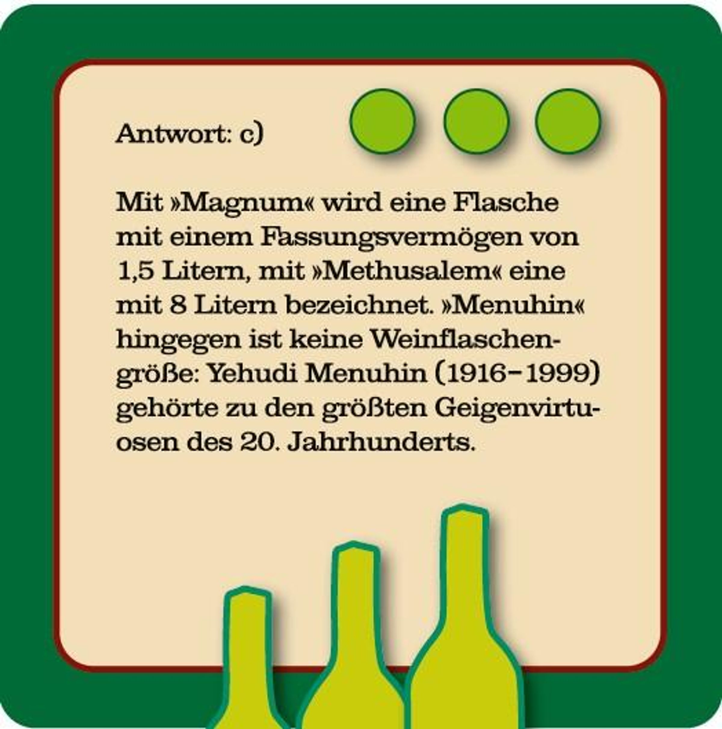 In der stilvollen Box erwarten Sie 66 abwechslungsreiche Fragen rund um den Rebensaft -- von bekannten Zitaten über Weinregionen bis hin zu kuriosen historischen Fakten. Wer sagte: „Wein ist Gottes Geschenk" -- Papst Pius IX., Ludwig XV. oder Martin Luther? Und woher stammt der berühmte Ausruf Est! Est!! Est!!! -- aus Montepulciano, Montefiascone oder Montecassino?