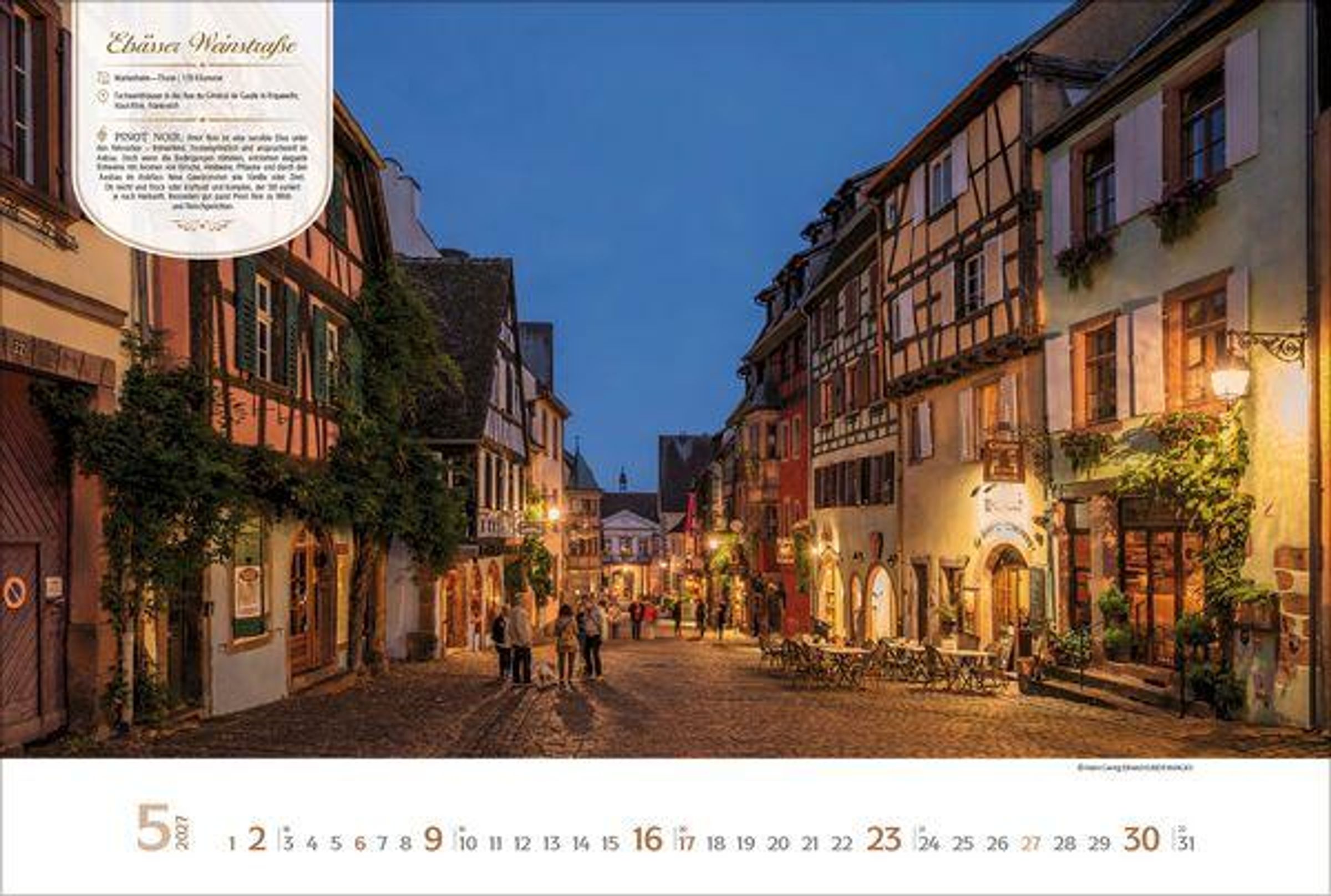 Dieser Kalender lädt den Betrachter ein auf eine visuelle Entdeckungsreise entlang der schönsten Weinstraßen Europas. Monat für Monat erwarten den Betrachter stimmungsvolle Aufnahmen malerischer Orte, sanfter Rebhänge und traditionsreicher Weinlandschaften. Neben den Fotografien bietet jeder Monat wissenswerte Informationen zur jeweiligen Weinstraße sowie eine kurze Vorstellung eines typischen Weins aus der Region. Ein perfekter Kalender für alle, die Genuss, Reiselust und die Vielfalt europäischer Weinkultur schätzen.