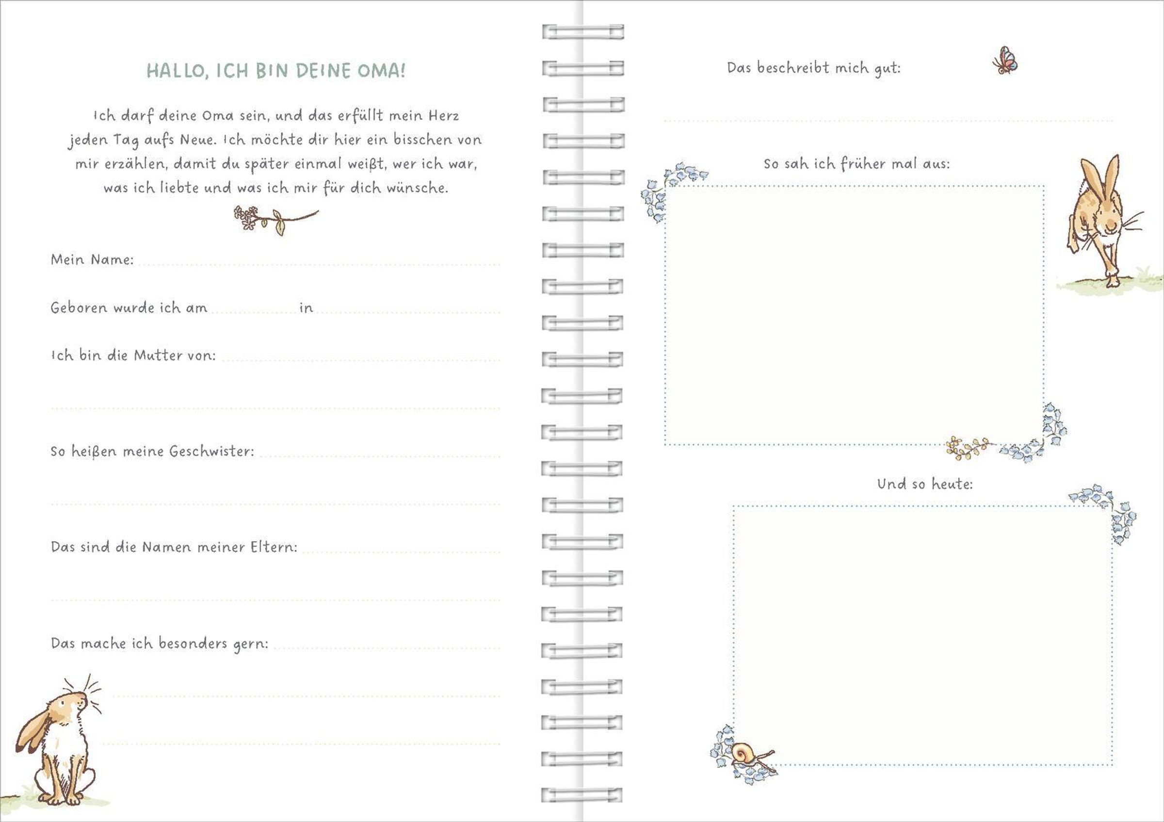 Dieses liebevoll gestaltete Erinnerungsalbum ist ein ganz besonderes Geschenk von Herzen: Oma und Opa halten darin ihre schönsten gemeinsamen Momente, Wünsche und Gedanken für ihr Enkelkind fest. Mit den zauberhaften Hasen-Illustrationen aus "Weißt du eigentlich, wie lieb ich dich hab?" wird das Album zu einem einzigartigen Familienschatz, der ein Leben lang begleitet. Das Album bietet viel Platz für Fotos, kleine Geschichten und persönliche Botschaften: von der Geburt über die ersten Abenteuer bis hin zu den kleinen Alltagsmomenten. Die hochwertige Spiralbindung sorgt dafür, dass das Buch bequem ausgefüllt und kreativ gestaltet werden kann. So entsteht ein Erinnerungsschatz, der Generationen verbindet und immer wieder Freude schenkt.