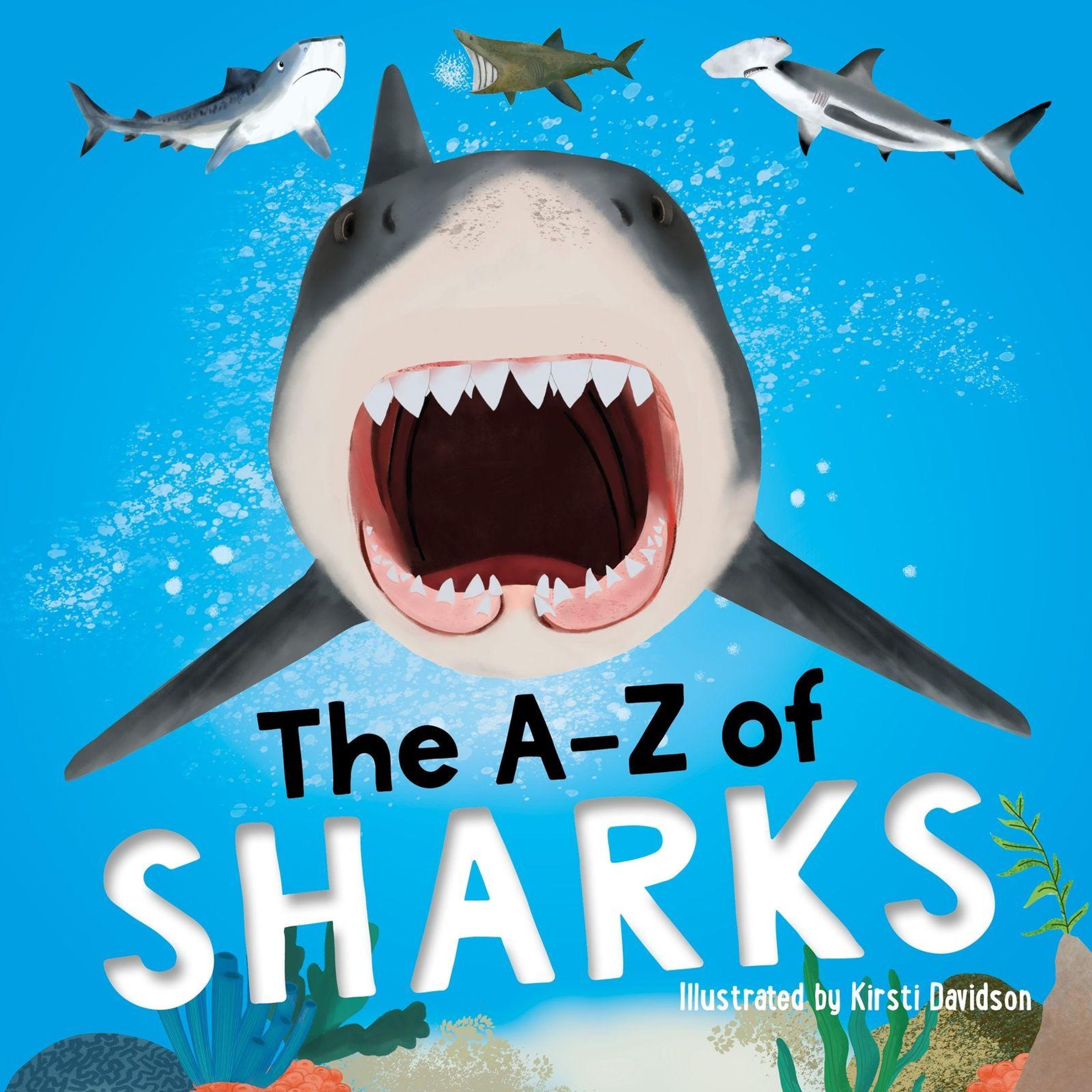 "The A-Z of Sharks" und "Illustrated by Kirsti Davidson". Ein Hai mit geöffnetem Maul, umgeben von weiteren Haien., Buch