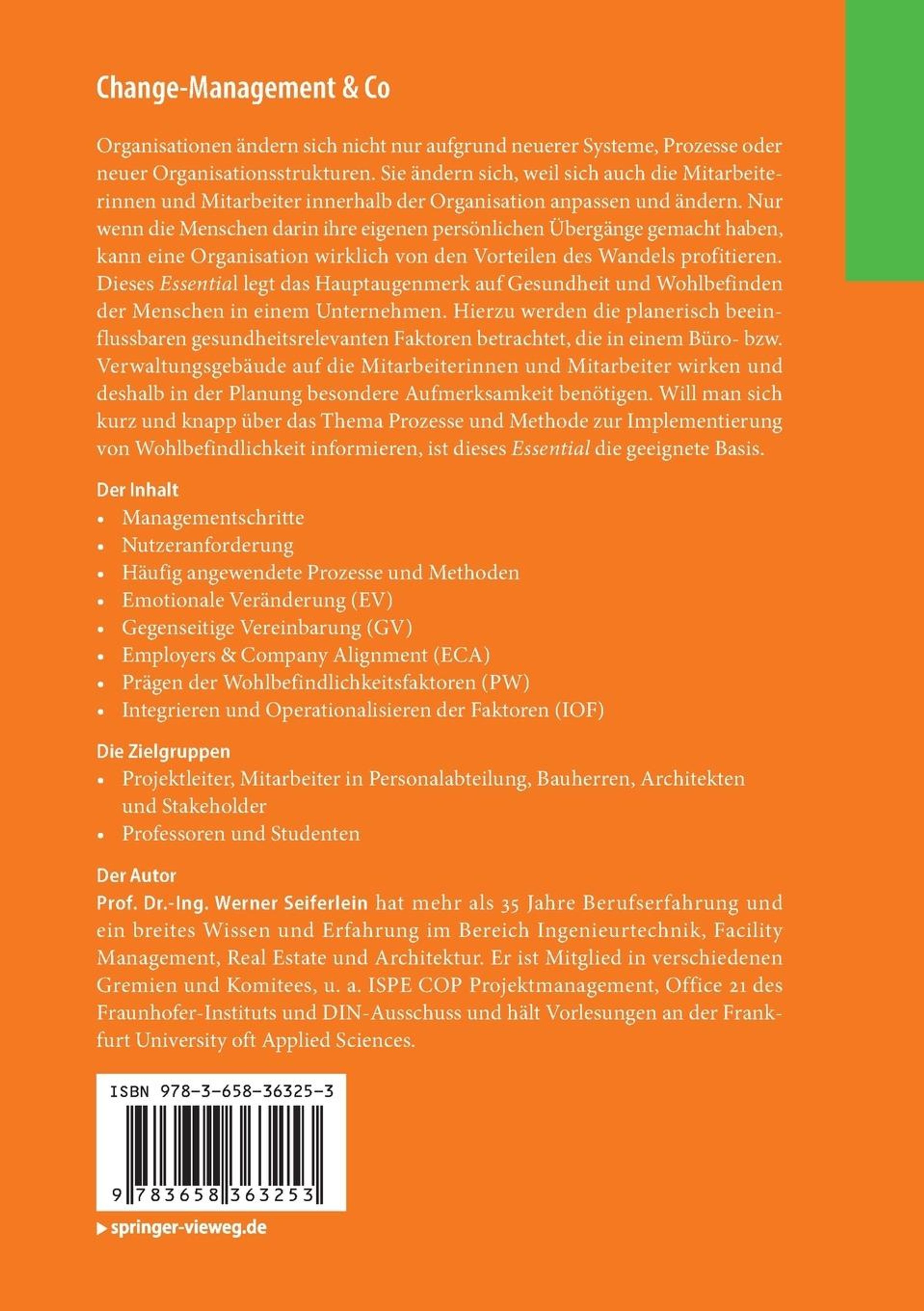 Organisationen ändern sich nicht nur aufgrund neuerer Systeme, Prozesse oder neuer Organisationsstrukturen. Sie ändern sich, weil sich auch die Mitarbeiterinnen und Mitarbeiter innerhalb der Organisation anpassen und ändern. Nur wenn die Menschen darin ihre eigenen persönlichen Übergänge gemacht haben, kann eine Organisation wirklich von den Vorteilen des Wandels profitieren. Dieses Essential legt das Hauptaugenmerk auf Gesundheit und Wohlbefinden der Menschen in einem Unternehmen. Hierzu werden die planerisch beeinflussbaren gesundheitsrelevanten Faktoren betrachtet, die in einem Büro- bzw. Verwaltungsgebäude auf die Mitarbeiterinnen und Mitarbeiter wirken und deshalb in der Planung besondere Aufmerksamkeit benötigen. Will man sich kurz und knapp über das Thema Prozesse und Methode zur Implementierung von Wohlbefindlichkeit informieren, ist dieses Essential die geeignete Basis.