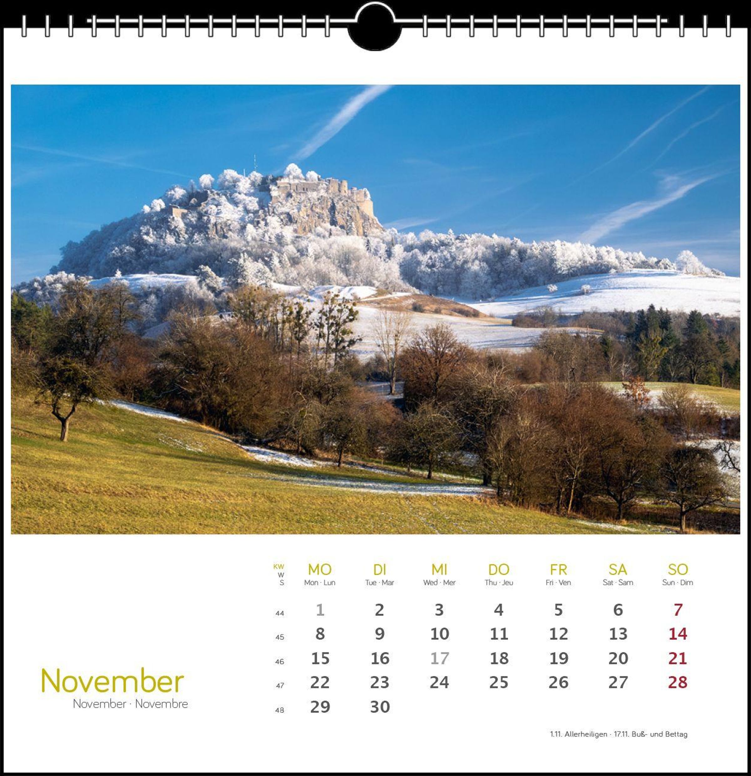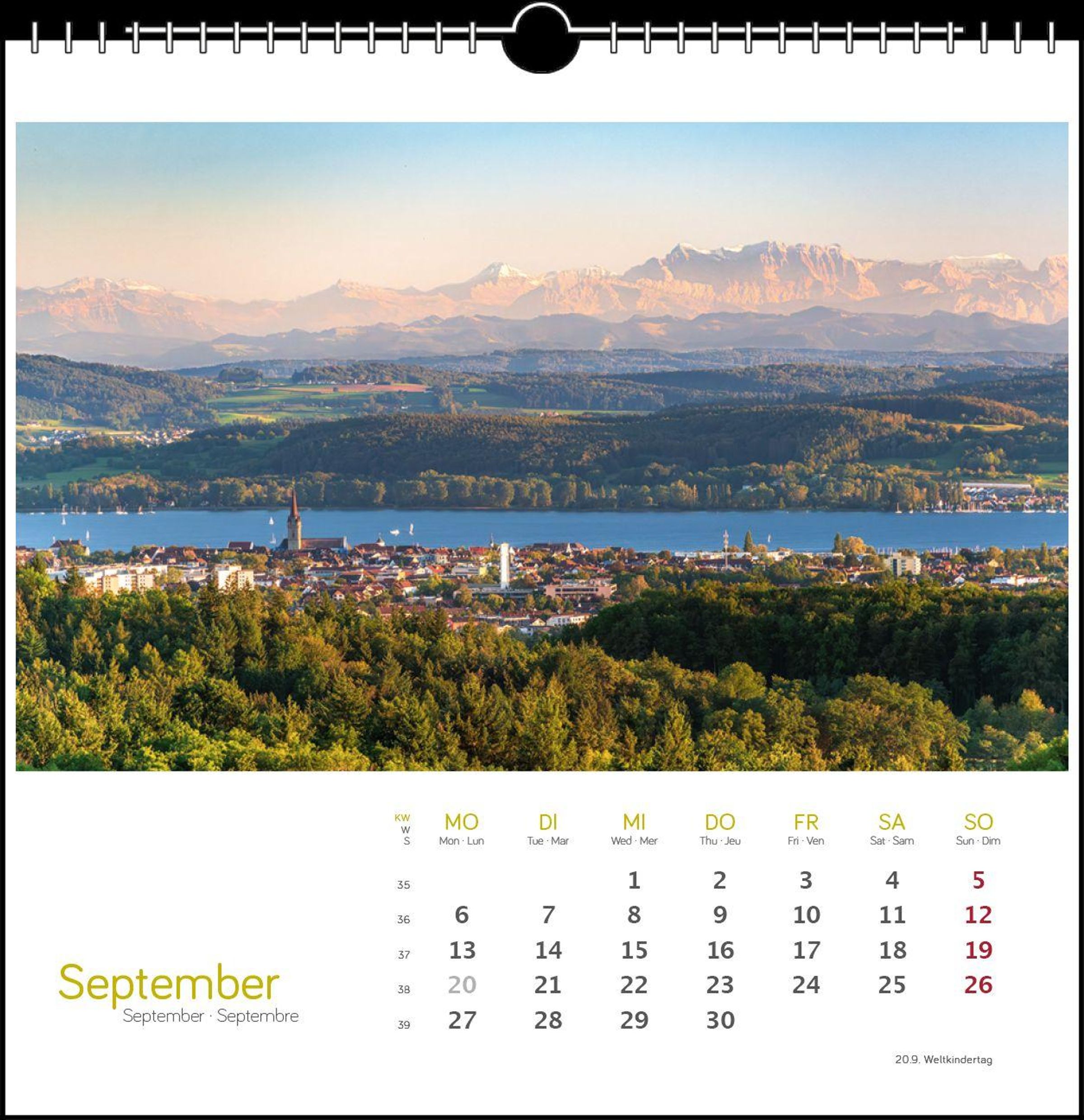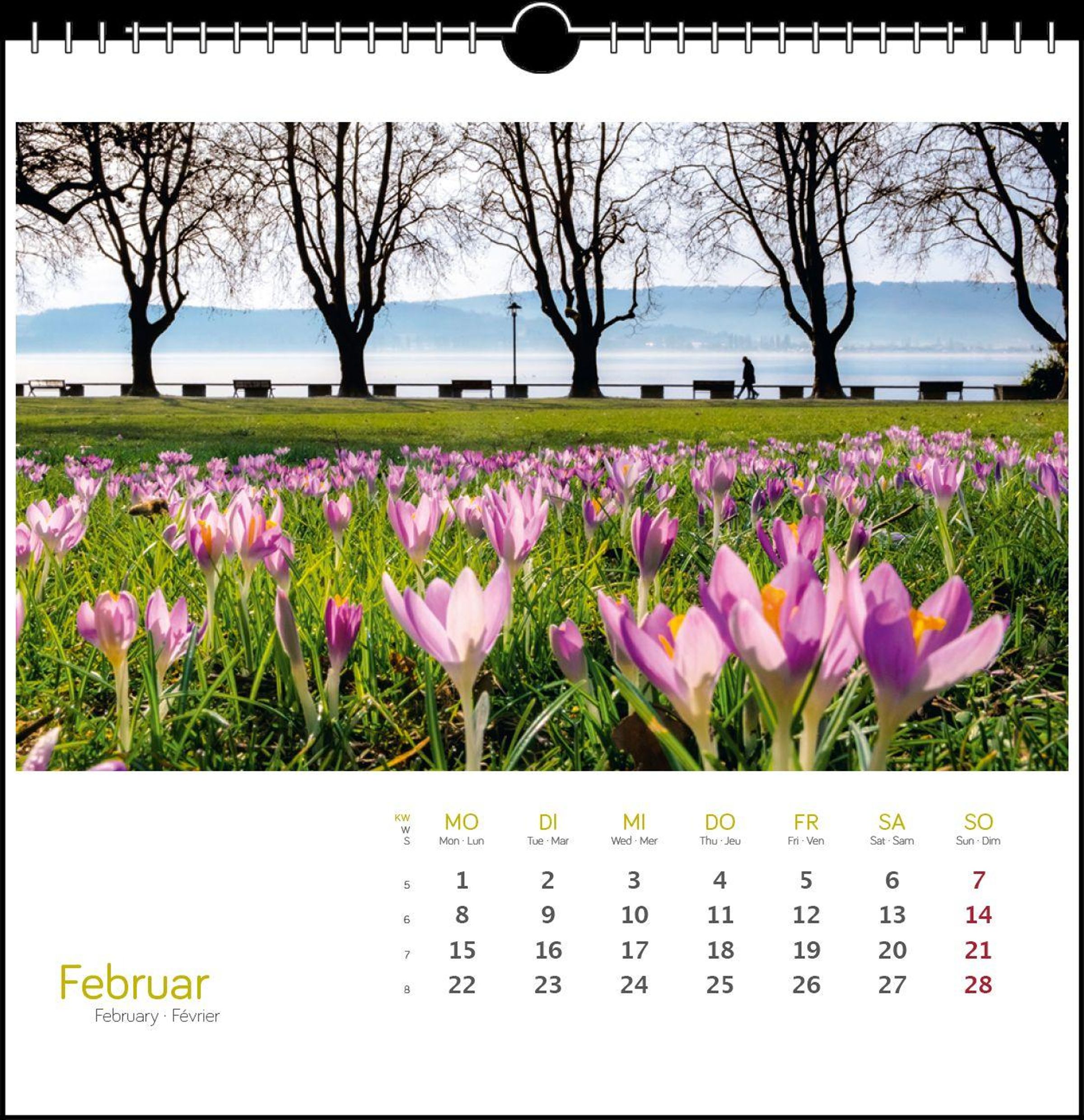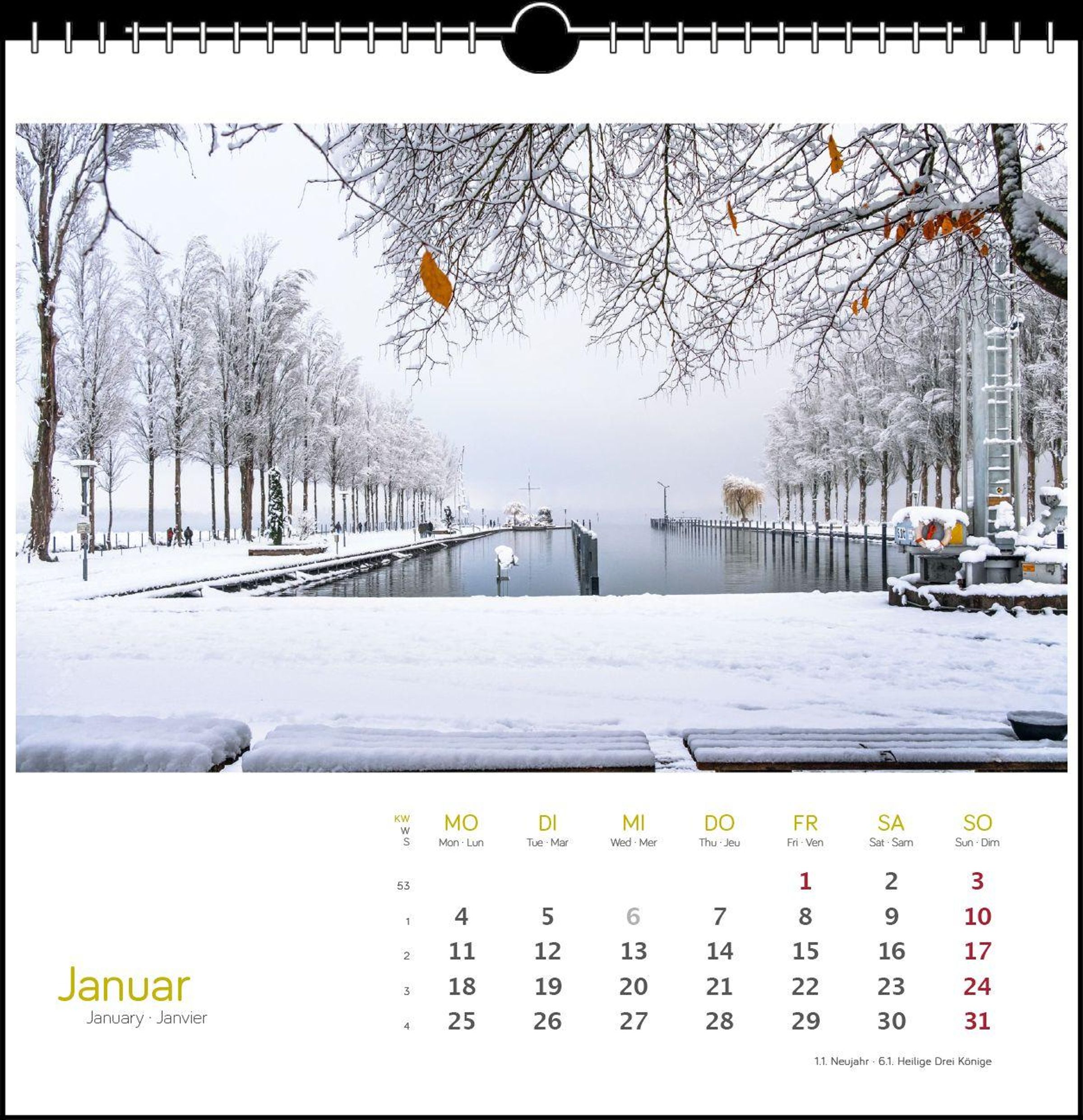 „Westlicher Bodensee 2027“, mit einer idyllischen Landschaft und einem See im Hintergrund, Häuser und ein grüner Hügel., Kalender