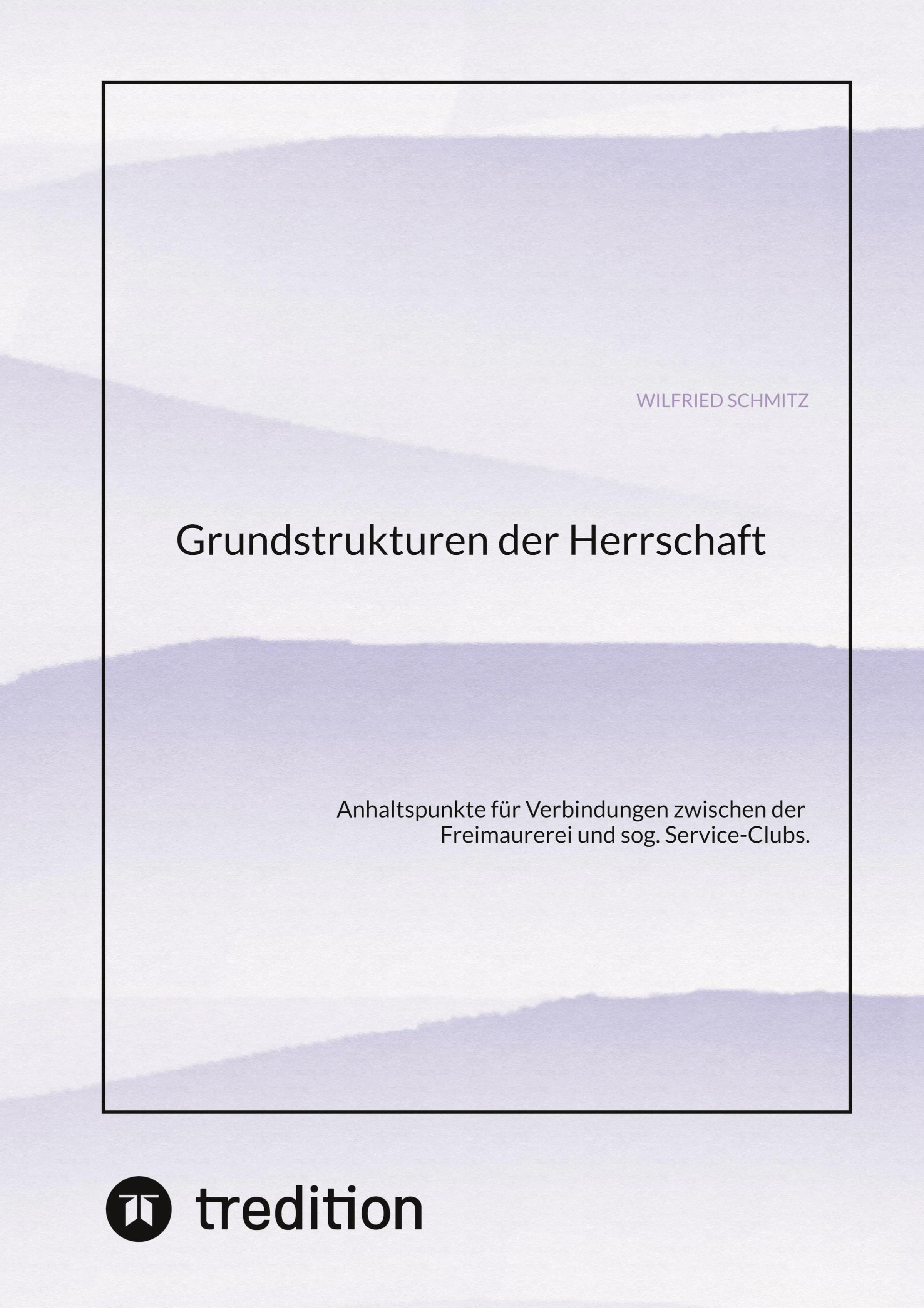"Grundstrukturen der Herrschaft" von Wilfried Schmitz über Freimaurerei. Blasses lila Muster, unten "tredition" Logo., Buch