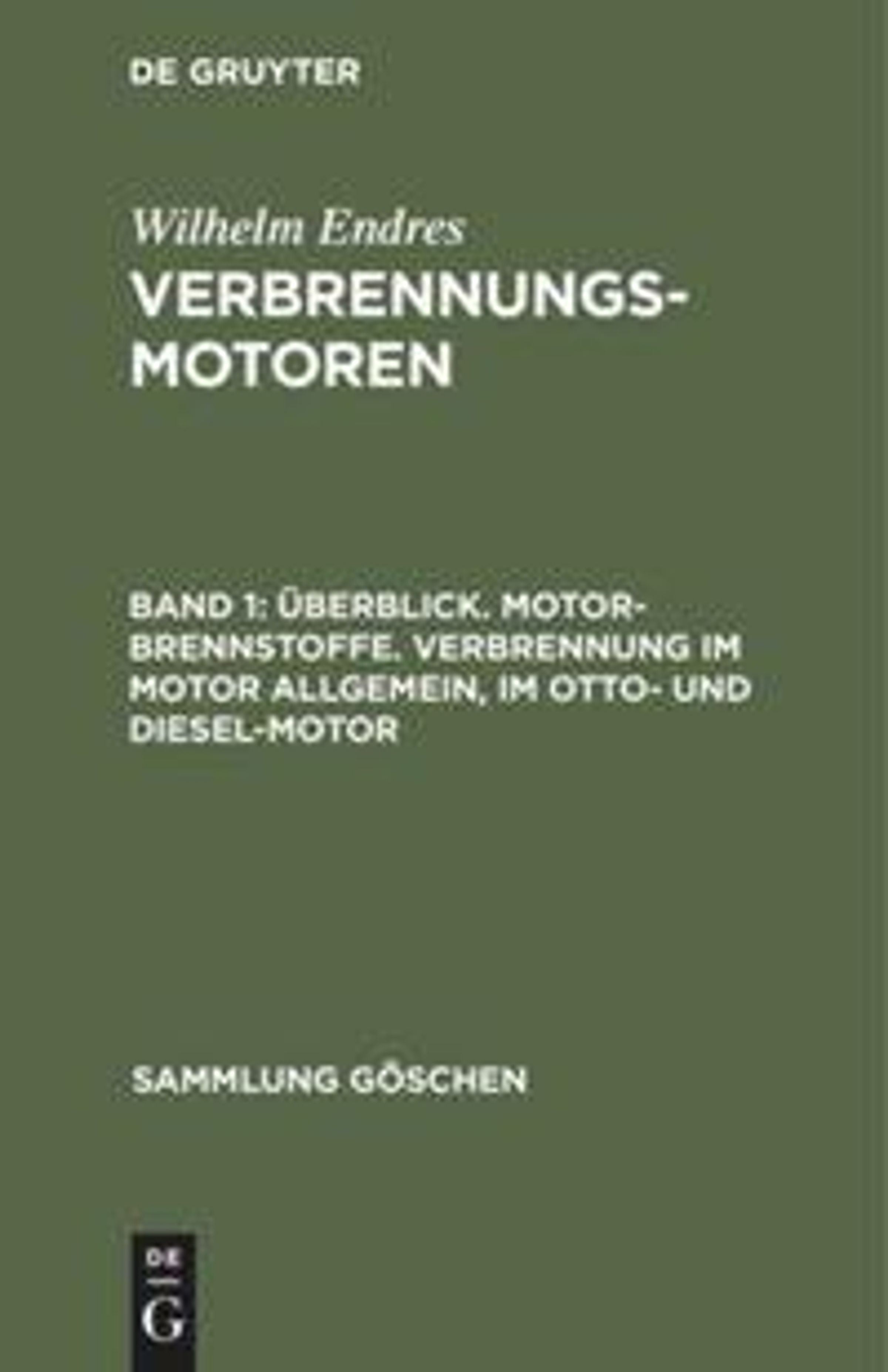 Frontmatter -- Inhaltsverzeichnis -- Ungefährer Inhalt von Band II, III u. IV -- A. Der Verbrennungsmotor. Ein erster Überblick -- B. Die Motorbrennstoffe -- C. Die Verbrennung im Motor allgemein -- D. Die Verbrennung im Ottomotor -- E. Die Verbrennung im Dieselmotor -- Anhang: Einheiten des Drucks -- Schrifttum -- Sachregister -- Front Matter 2 -- Inhaltsübersicht -- Geisteswissenschaften -- Naturwissenschaften -- Technik -- Sammlung Göschen / Bandnummernfolge -- Autorenregister