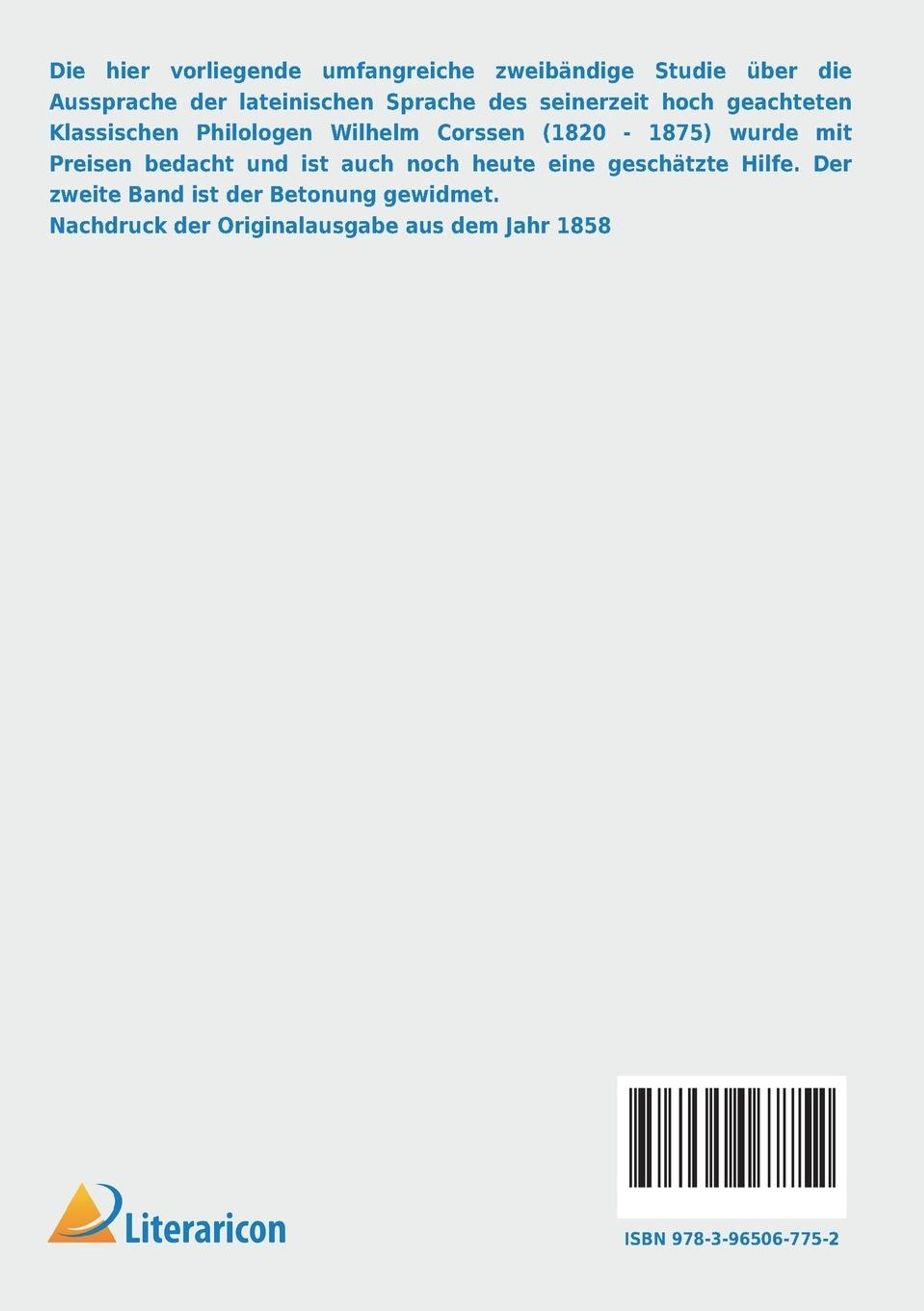 Die hier vorliegende umfangreiche zweibändige Studie über die Aussprache der lateinischen Sprache des seinerzeit hoch geachteten Klassischen Philologen Wilhelm Corssen (1820 - 1875) wurde mit Preisen bedacht und ist auch noch heute eine geschätzte Hilfe. Der zweite Band ist der Betonung gewidmet. Nachdruck der Originalausgabe aus dem Jahr 1858