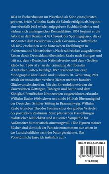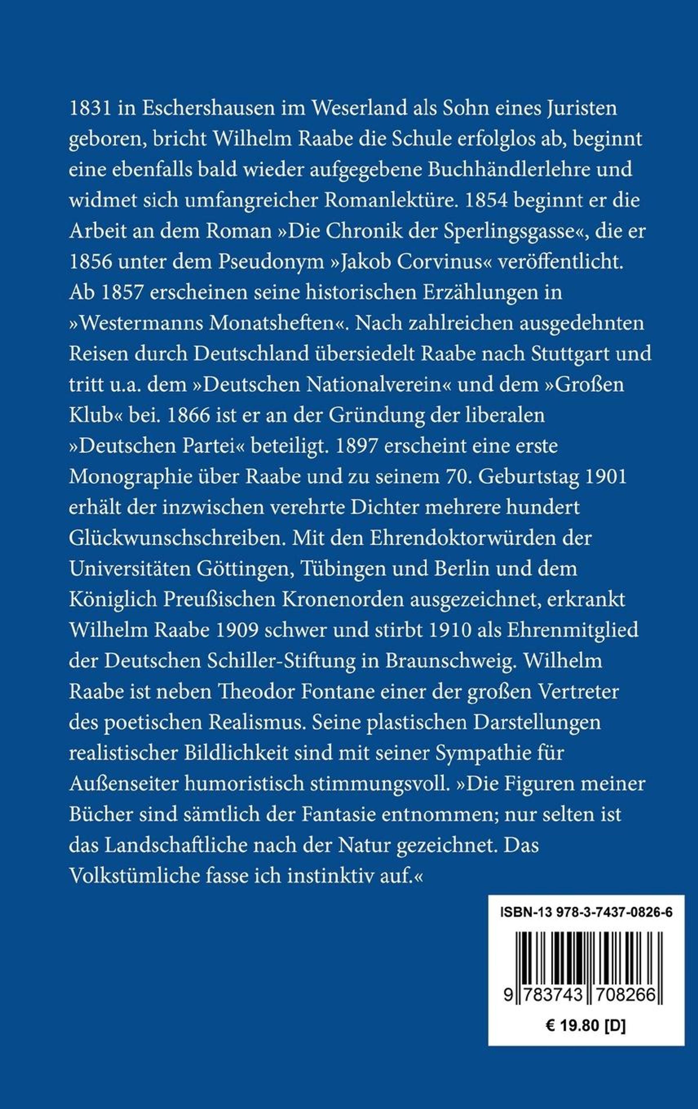 1831 in Eschershausen im Weserland als Sohn eines Juristen geboren, bricht Wilhelm Raabe die Schule erfolglos ab, beginnt eine ebenfalls bald wieder aufgegebene Buchhändlerlehre und widmet sich umfangreicher Romanlektüre. 1854 beginnt er die Arbeit an dem Roman >>Die Chronik der Sperlingsgasse<<, die er 1856 unter dem Pseudonym >>Jakob Corvinus<< veröffentlicht. Ab 1857 erscheinen seine historischen Erzählungen in >>Westermanns Monatsheften<<. Nach zahlreichen ausgedehnten Reisen durch Deutschland übersiedelt Raabe nach Stuttgart und tritt u. a. dem >>Deutschen Nationalverein<< und dem >>Großen Klub<< bei. 1866 ist er an der Gründung der liberalen >>Deutschen Partei<< beteiligt. 1897 erscheint eine erste Monographie über Raabe und zu seinem 70. Geburtstag 1901 erhält der inzwischen verehrte Dichter mehrere hundert Glückwunschschreiben. Mit den Ehrendoktorwürden der Universitäten Göttingen, Tübingen und Berlin und dem Königlich Preußischen Kronenorden ausgezeichnet, erkrankt Wilhelm Raabe 1909 schwer und stirbt 1910 als Ehrenmitglied der Deutschen Schiller-Stiftung in Braunschweig. Wilhelm Raabe ist neben Theodor Fontane einer der großen Vertreter des poetischen Realismus. Seine plastischen Darstellungen realistischer Bildlichkeit sind mit seiner Sympathie für Außenseiter humoristisch stimmungsvoll. >>Die Figuren meiner Bücher sind sämtlich der Fantasie entnommen; nur selten ist das Landschaftliche nach der Natur gezeichnet. Das Volkstümliche fasse ich instinktiv auf.<<