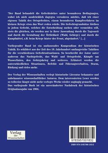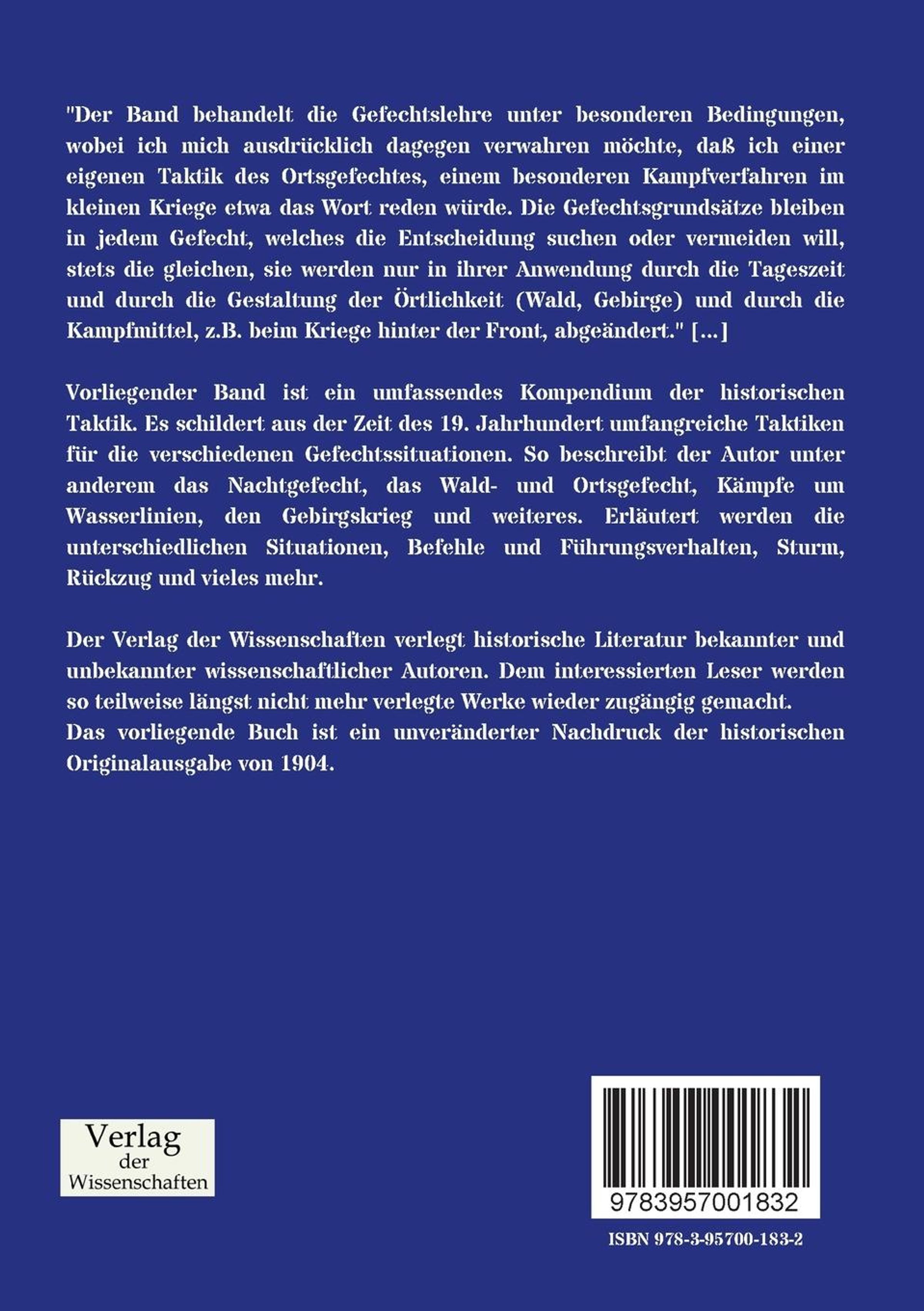 Vorliegender Band ist ein umfassendes Kompendium der historischen Taktik. Es schildert aus der Zeit des 19. Jahrhundert umfangreiche Taktiken für die verschiedenen Gefechtssituationen. So beschreibt der Autor unter anderem das Nachtgefecht, das Wald- und Ortsgefecht, Kämpfe um Wasserlinien, den Gebirgskrieg und weiteres. Erläutert werden die unterschiedlichen Situationen, Befehle und Führungsverhalten, Sturm, Rückzug und vieles mehr.