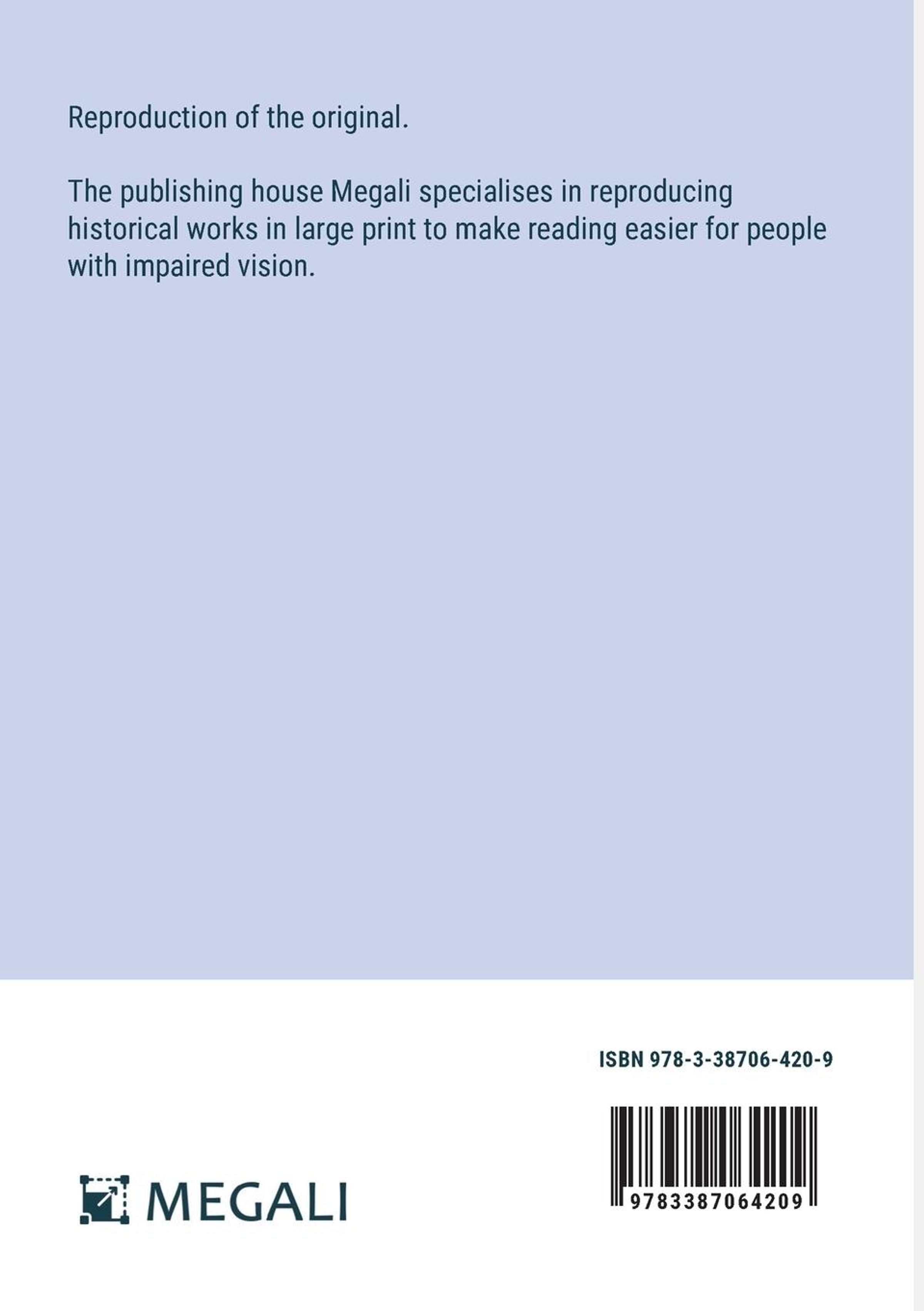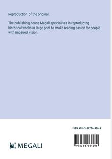 Reproduction of the original. The publishing house Megali specialises in reproducing historical works in large print to make reading easier for people with impaired vision.