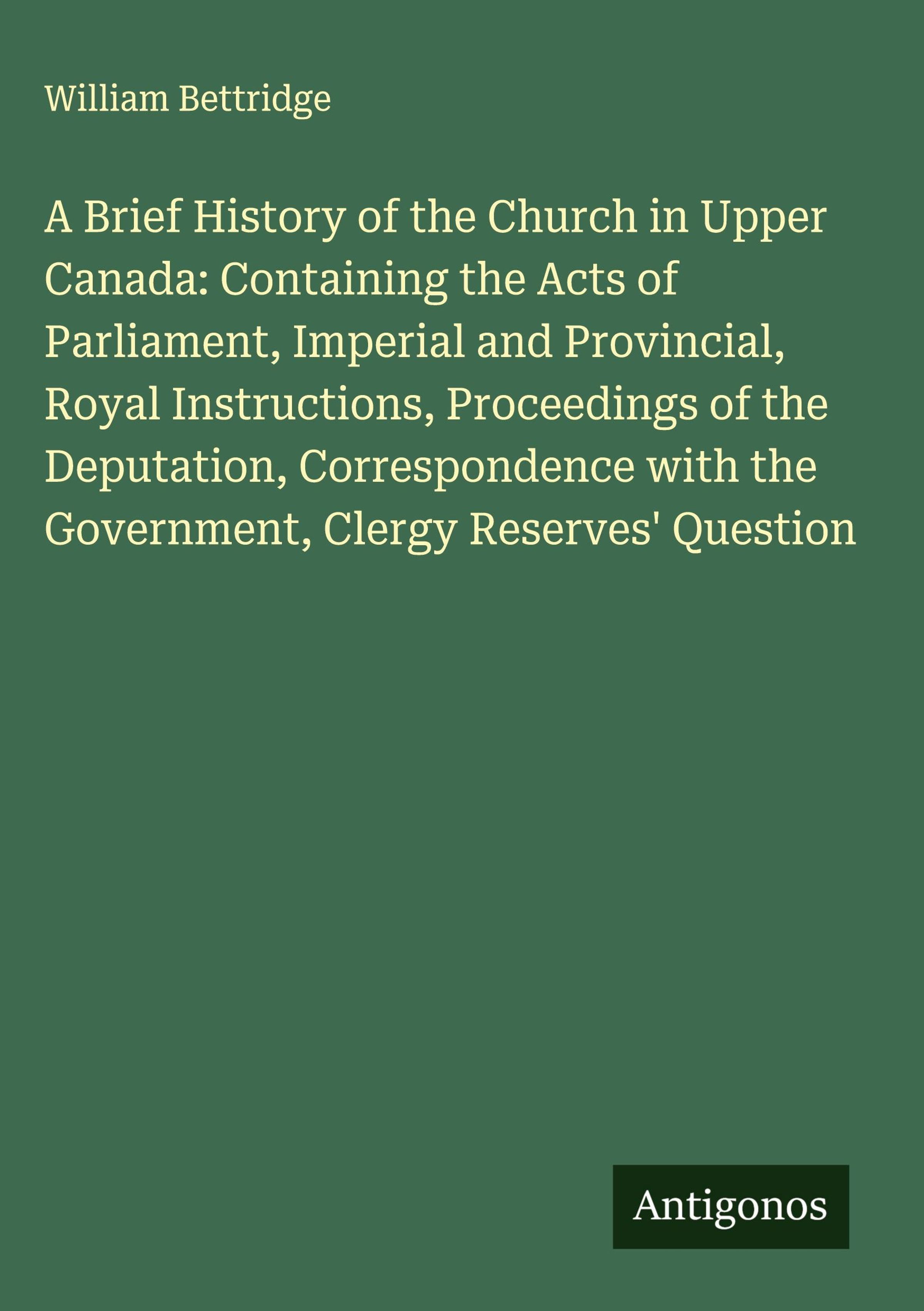 William Bettridge: A Brief History of the Church in Upper Canada: Containing the Acts of Parliament, Imperial..., Gebunden