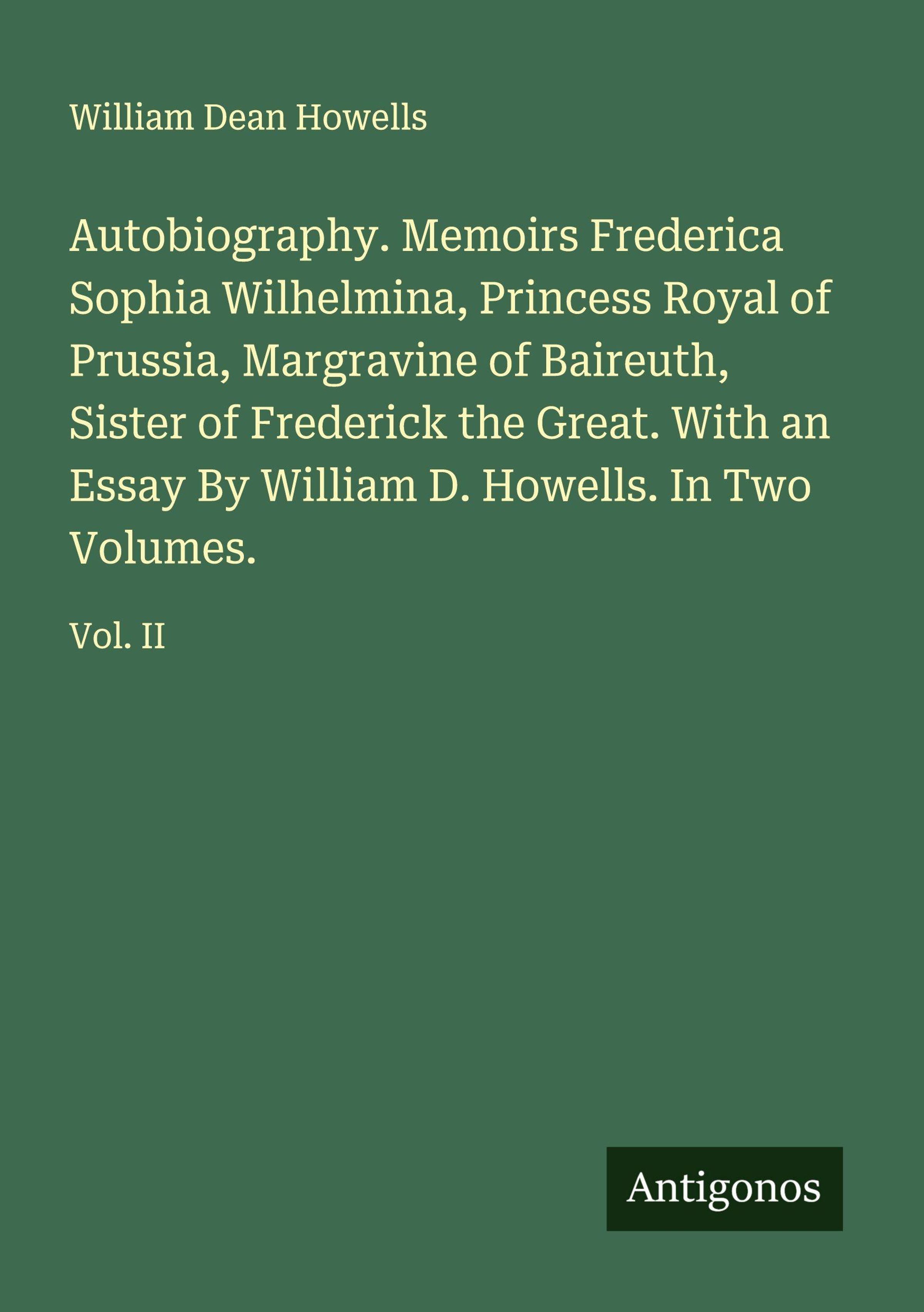 Autobiography. Memoirs Frederica Sophia Wilhelmina, Princess Royal of Prussia, Margravine of Baireuth, Sister of Frederick the Great. With an Essay By William D. Howells. In Two Volumes.