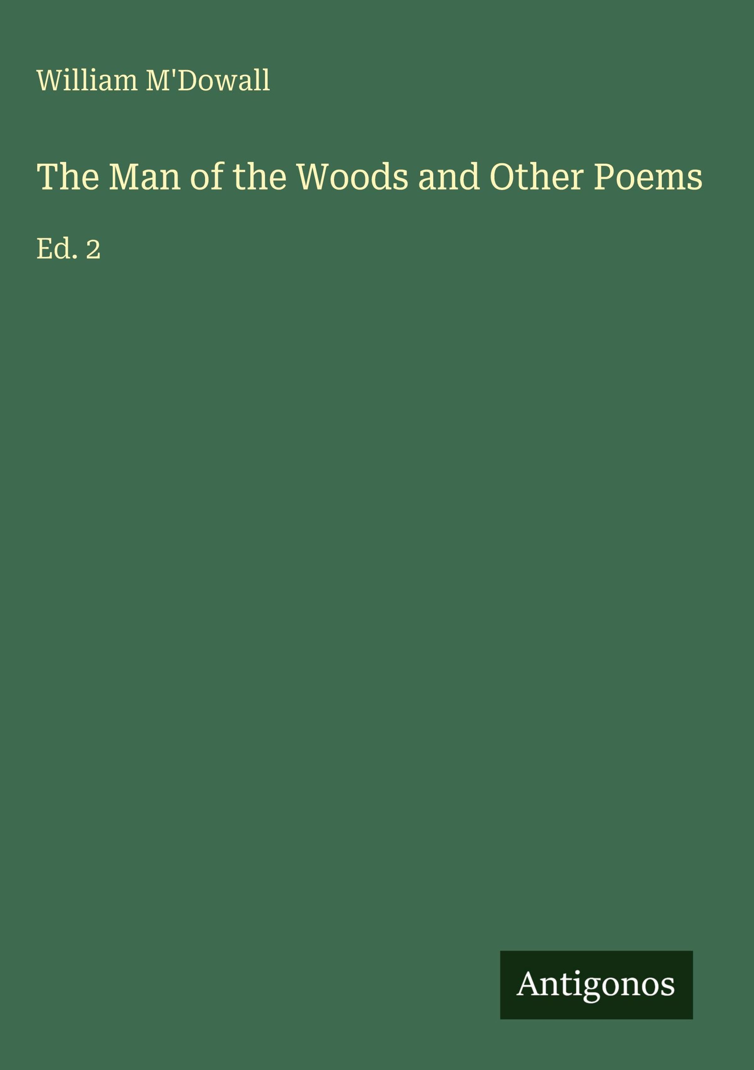 Oben "William M'Dowall". Titel: "The Man of the Woods and Other Poems". Unten rechts "Antigonos". Hintergrund grün., Buch
