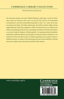 The innovative gardener and writer William Robinson (1838-1935), several of whose other works are reissued in this series, was sent by The Times as its horticultural correspondent to the Paris International Exposition of 1867. As a result of his visit, he produced two books, The Parks, Promenades and Gardens of Paris (1869) and this highly illustrated work (first published in 1868 and reissued here in its 1869 second edition) on gardening trends in France, describing 'such features of French horticulture as are most worthy of adoption in British gardens'. In comparing French horticulture with British, Robinson believes that the gardens of the great houses of Britain are not matched in France, but that in terms of market gardening and its produce, France is definitely superior. He argues in this interesting work that French methods of training fruit such as apples, pears and peaches should be widely adopted.