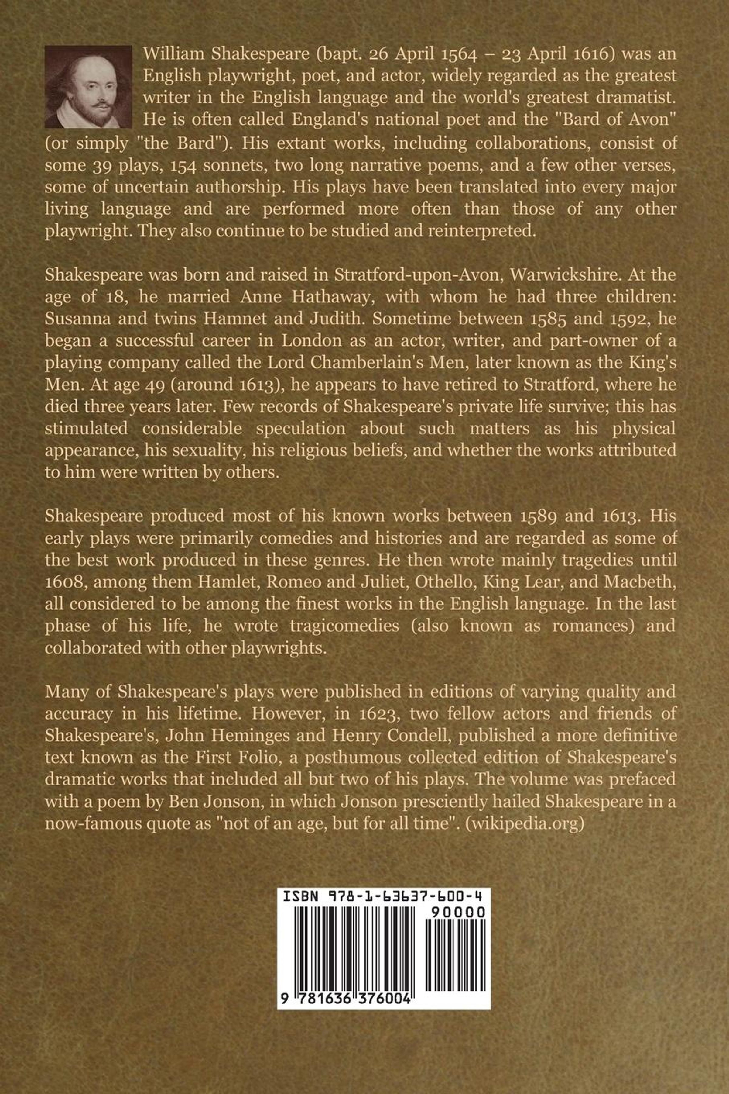 William Shakespeare (1564-1616) gilt als einer der größten Dichter und Dramatiker der Weltgeschichte. Er verfasste zahlreiche Dramen, Tragödien, Komödien und Gedichte, mit denen er schon zu Lebzeiten Anerkennung und Wohlstand errang. Aber erst in den folgenden Jahrhunderten wurde er zum Prototypen des literarischen Genies, ohne den die Entwicklung der neueren Literatur von Goethe über Brecht bis in die Gegenwart hinein undenkbar ist.Mehr von William Shakesp...