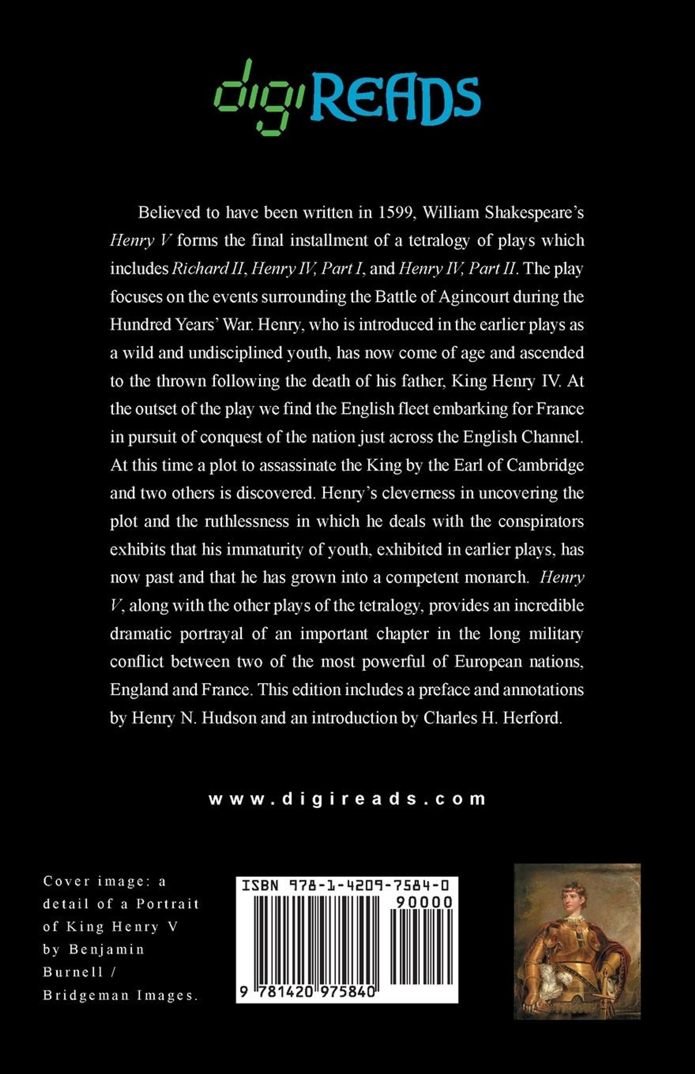Believed to have been written in 1599, William Shakespeare's "Henry V" forms the final installment of a tetralogy of plays which includes "Richard II", "Henry IV, Part I", and "Henry IV, Part II". The play focuses on the events surrounding the Battle of Agincourt during the Hundred Years' War. Henry, who is introduced in the earlier plays as a wild and undisciplined youth, has now come of age and ascended to the thrown following the death of his father, King Henry IV. At the outset of the play we find the English fleet embarking for France in pursuit of conquest of the nation just across the English Channel. At this time a plot to assassinate the King by the Earl of Cambridge and two others is discovered. Henry's cleverness in uncovering the plot and the ruthlessness in which he deals with the conspirators exhibits that his immaturity of youth, exhibited in earlier plays, has now past and that he has grown into a competent monarch. "Henry V", along with the other plays of the tetralogy, provides an incredible dramatic portrayal of an important chapter in the long military conflict between two of the most powerful of European nations, England and France. This edition is printed on premium acid-free paper, includes a preface and annotations by Henry N. Hudson, and an introduction by Charles H. Herford.