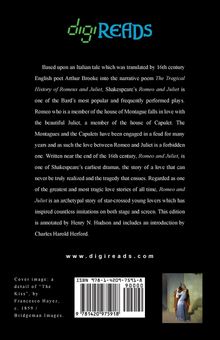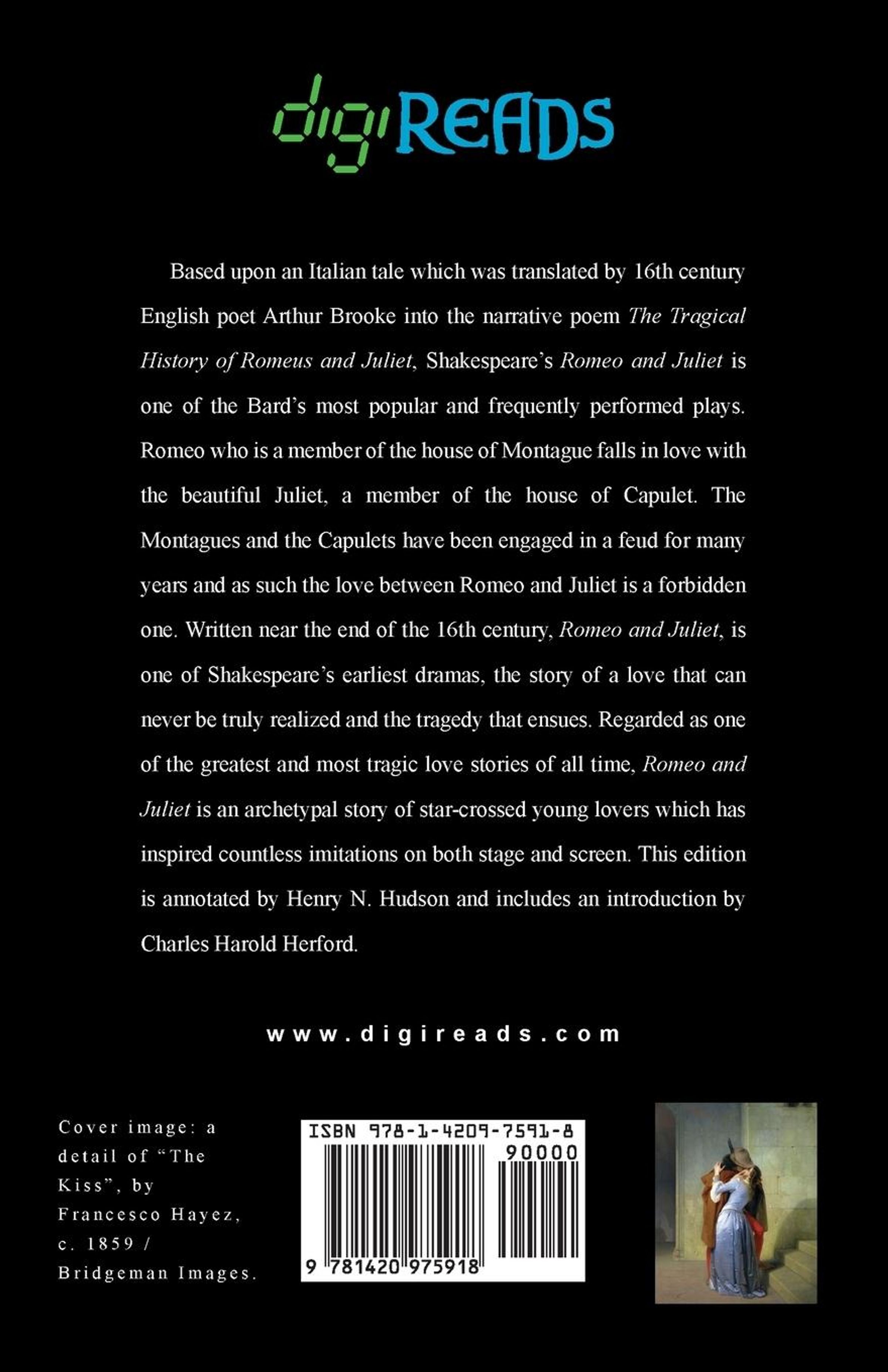 Based upon an Italian tale which was translated by 16th century English poet Arthur Brooke into the narrative poem "The Tragical History of Romeus and Juliet", Shakespeare's "Romeo and Juliet" is one of the Bard's most popular and frequently performed plays. Romeo who is a member of the house of Montague falls in love with the beautiful Juliet, a member of the house of Capulet. The Montagues and the Capulets have been engaged in a feud for many years and as such the love between Romeo and Juliet is a forbidden one. Written near the end of the 16th century, "Romeo and Juliet," is one of Shakespeare's earliest dramas, the story of a love that can never be truly realized and the tragedy that ensues. Regarded as one of the greatest and most tragic love stories of all time, "Romeo and Juliet" is an archetypal story of star-crossed young lovers which has inspired countless imitations on both stage and screen. This edition is printed on premium acid-free paper, is annotated by Henry N. Hudson, and includes an introduction by Charles H. Herford.