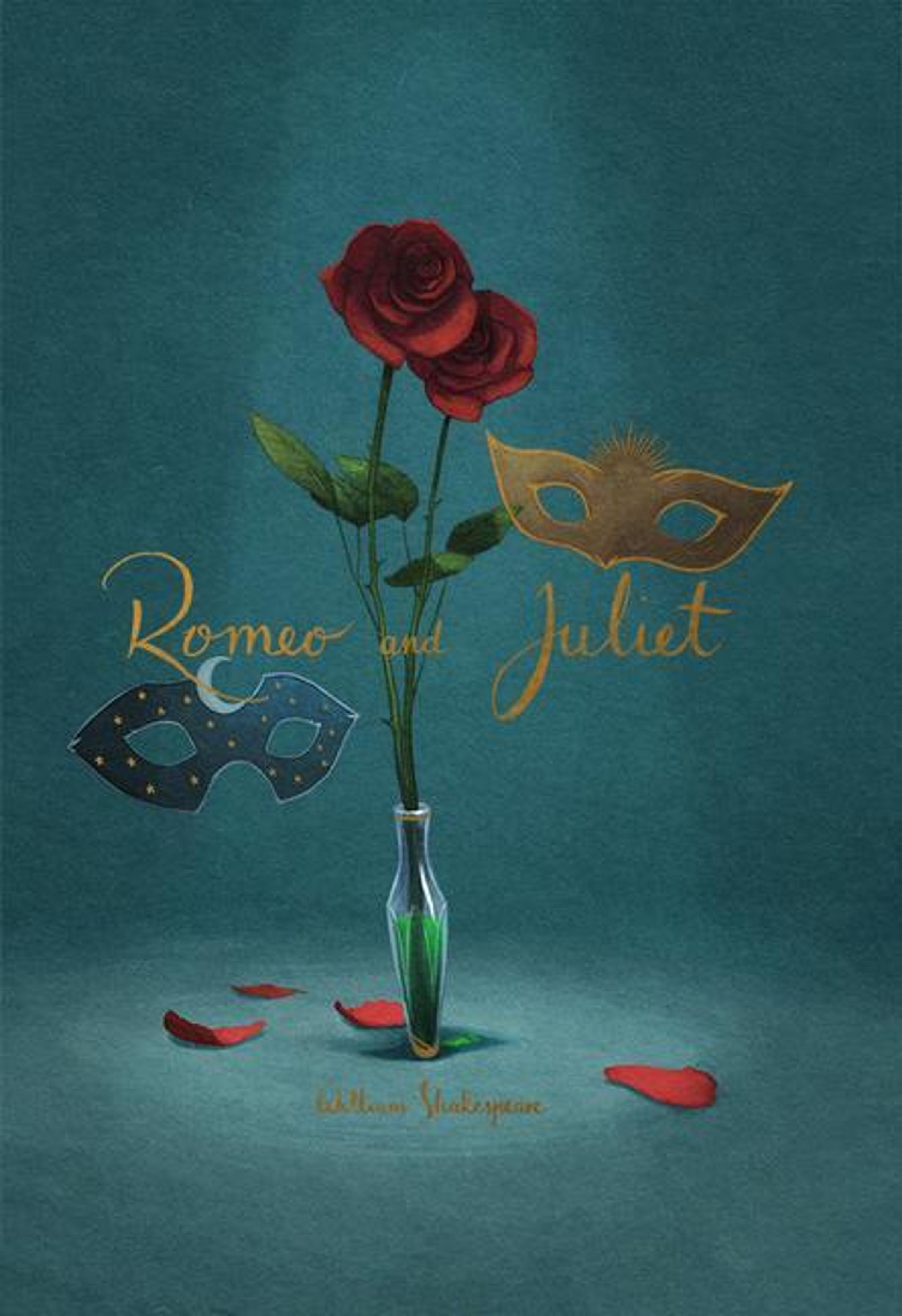 „Romeo and Juliet“, „William Shakespeare“. Illustration: Rose in Vase, zwei Masken, Rosenblätter auf blauen Hintergrund., Buch