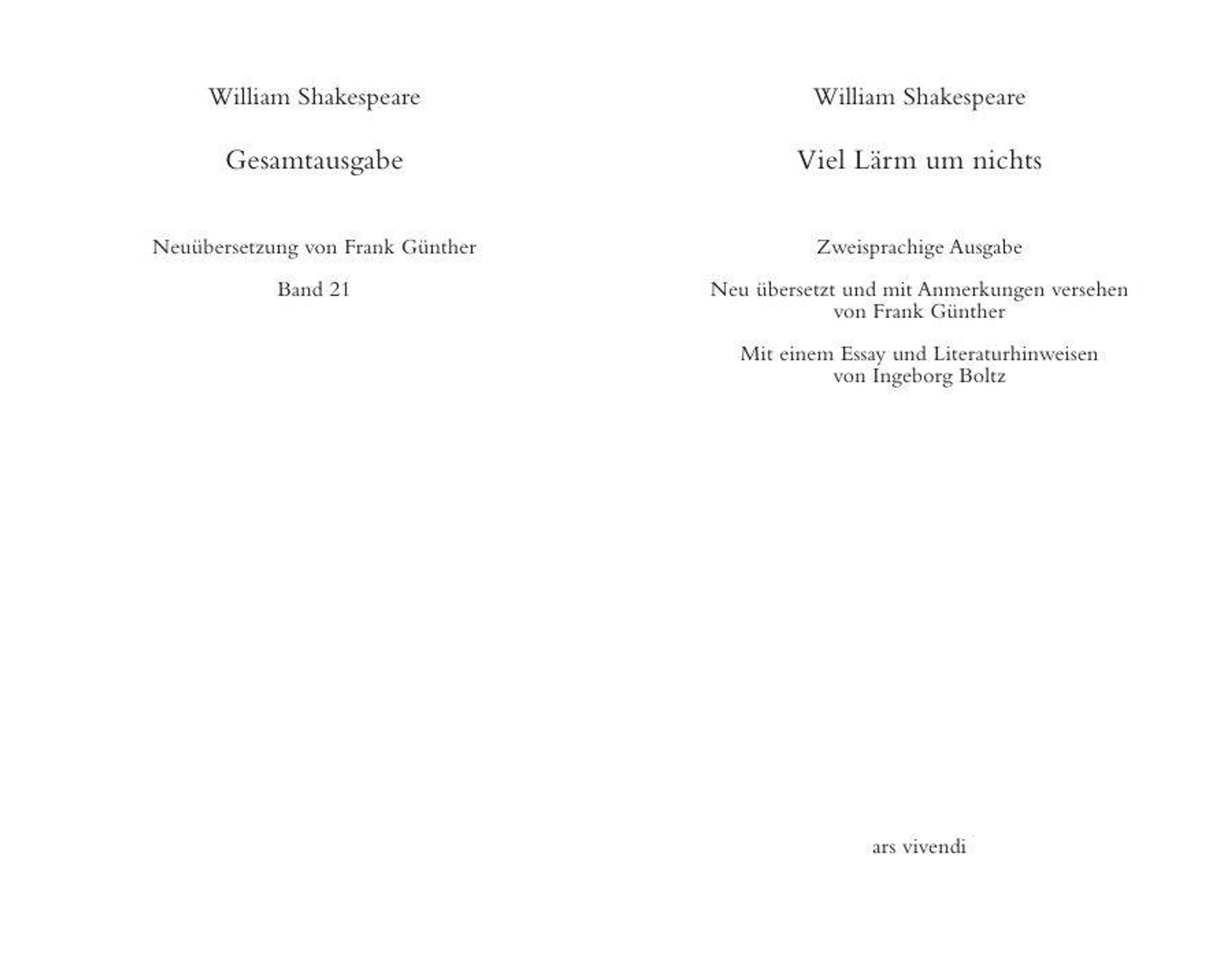 Frank Günther, geboren 1947 in Freiburg, wuchs in Wiesbaden auf. Er studierte Germanistik, Anglistik und Theaterwissenschaft in Mainz und Bochum und erlag dabei den Verlockungen des Theaters. Er war als Regieassistent beim amerikanischen Regisseur Charles Marowitz in Wiesbaden, Bochum und London, wodurch er Kontakt zum englischen off-off-Theater im Dunstkreis von Peter Brook gewann. Dessen Sommernachtstraum war später die Initialzündung für die eigene Theater- und Spracharbeit. Es folgten Regieassistenzen in Bochum und Stuttgart sowie ein Lehrauftrag an der dortigen staatlichen Hochschule für Musik und darstellende Kunst. Anschließend ging er als fester Regisseur nach Heidelberg. Nach zwei Jahren und einem halben Dutzend eigener Inszenierungen machte er sich nach Amerika auf, wo er ein Jahr on the road als Tabakpflücker, Kellner und Tellerwäscher in Kanada und den USA zubrachte. Zurück in Deutschland begann er mit ersten Übersetzungen elisabethanischer Dramatiker und war in Haßliebe zum Theater u.a. in Heidelberg, Bielefeld, Basel und Wiesbaden als Regisseur tätig. Die Shakespeare-Übersetzung, die als Auftragsarbeit begann, wurde im Laufe der Jahre zu seiner Hauptbeschäftigung. Zuletzt erhielt er im Jahr 2006 den Heinrich Maria Ledig-Rowohlt-Preis für seine viel gerühmten und von vielen deutschsprachigen Bühnen gespielten Shakespeare-Übersetzungen, die sich durch ihre sprachliche Genauigkeit und ihre Shakespearsche Lebendigkeit auszeichnen, so die Begründung der Jury. Zum Wintersemester 2007/2008 wurde er zum ersten Inhaber der neuen August Wilhelm von Schlegel-Gastprofessur für Poetik der Übersetzung an der Freien Universität Berlin gewählt. 2011 wurde er von der Deutschen Akademie für Sprache und Dichtung mit dem Johann-Heinrich-Voß-Preis geehrt.Anmerkungen: