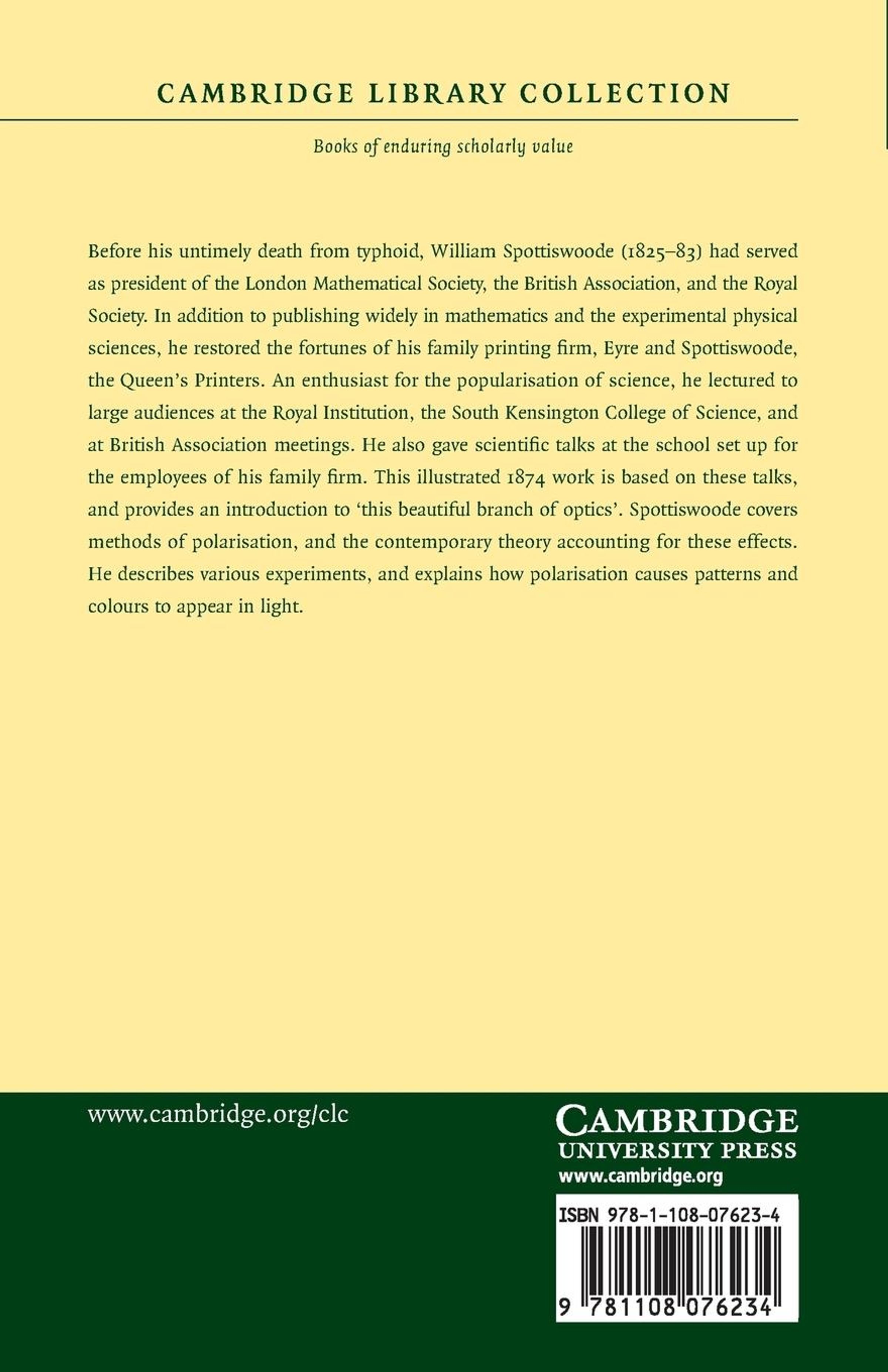 Before his untimely death from typhoid, William Spottiswoode (1825-83) had served as president of the London Mathematical Society, the British Association, and the Royal Society. In addition to publishing widely in mathematics and the experimental physical sciences, he restored the fortunes of his family printing firm, Eyre and Spottiswoode, the Queen's printers. An enthusiast for the popularisation of science, he lectured to large audiences at the Royal Institution, the South Kensington College of Science, and at British Association meetings. He also gave scientific talks at the school set up for the employees of his family firm. This illustrated 1874 work is based on these talks, and provides an introduction to 'this beautiful branch of optics'. Spottiswoode covers methods of polarisation, and the contemporary theory accounting for these effects. He describes various experiments, and explains how polarisation causes patterns and colours to appear in light.