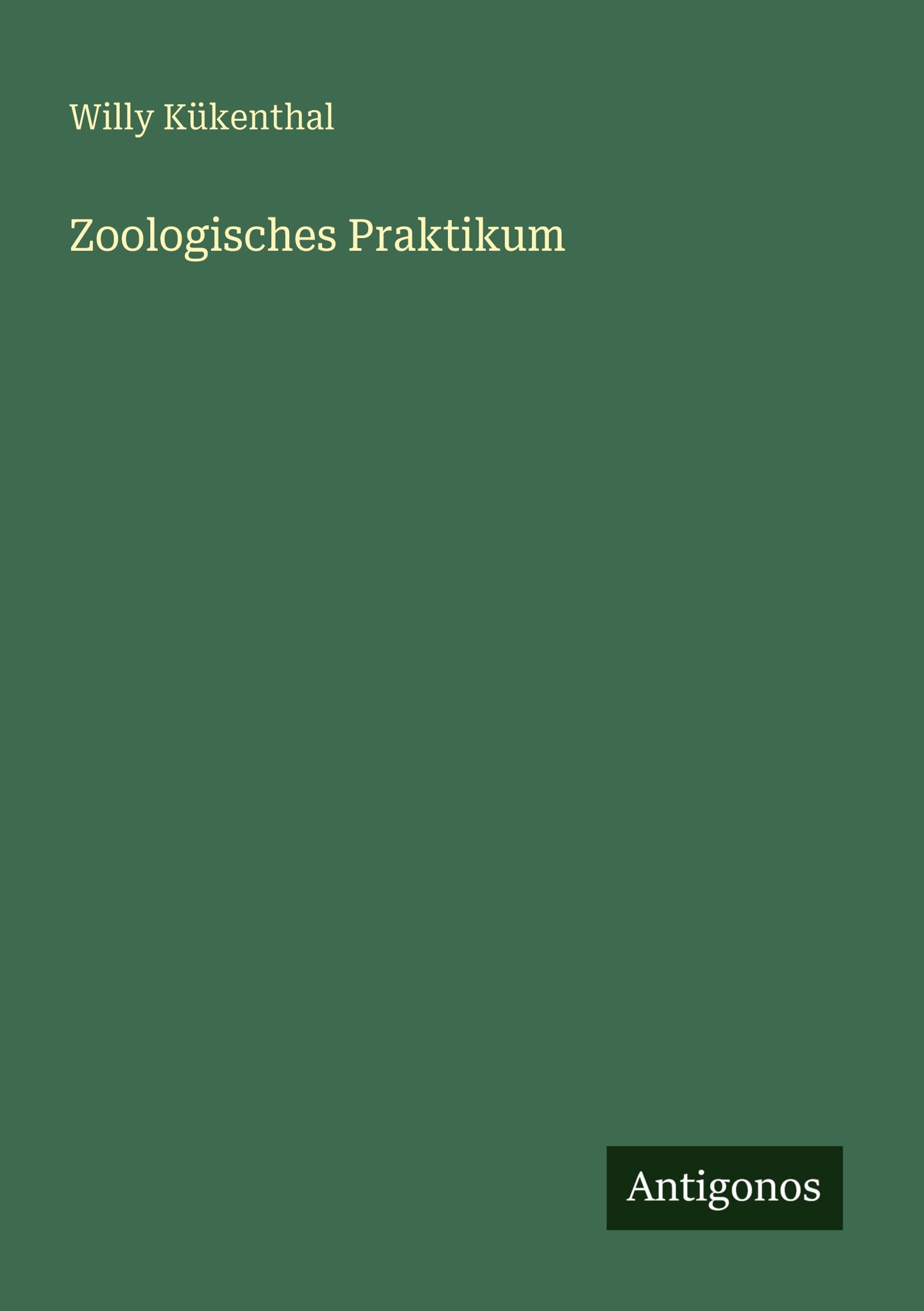 Buchtitel: "Zoologisches Praktikum" von Willy Kükenthal. Unten rechts steht "Antigonos". Der Hintergrund ist grün., Buch