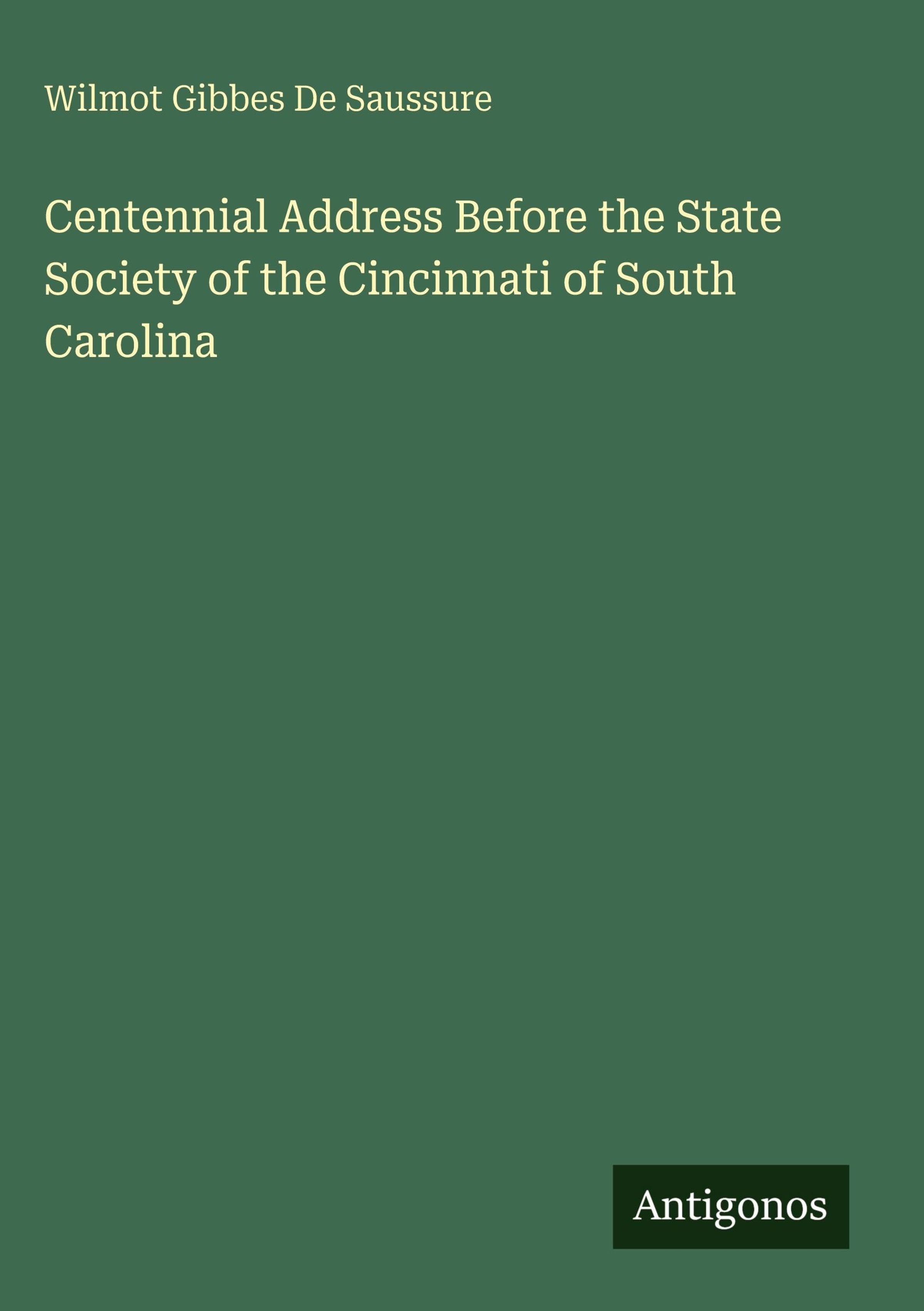 Wilmot Gibbes De Saussure: Centennial Address Before the State Society of the Cincinnati of South Carolina, Gebunden