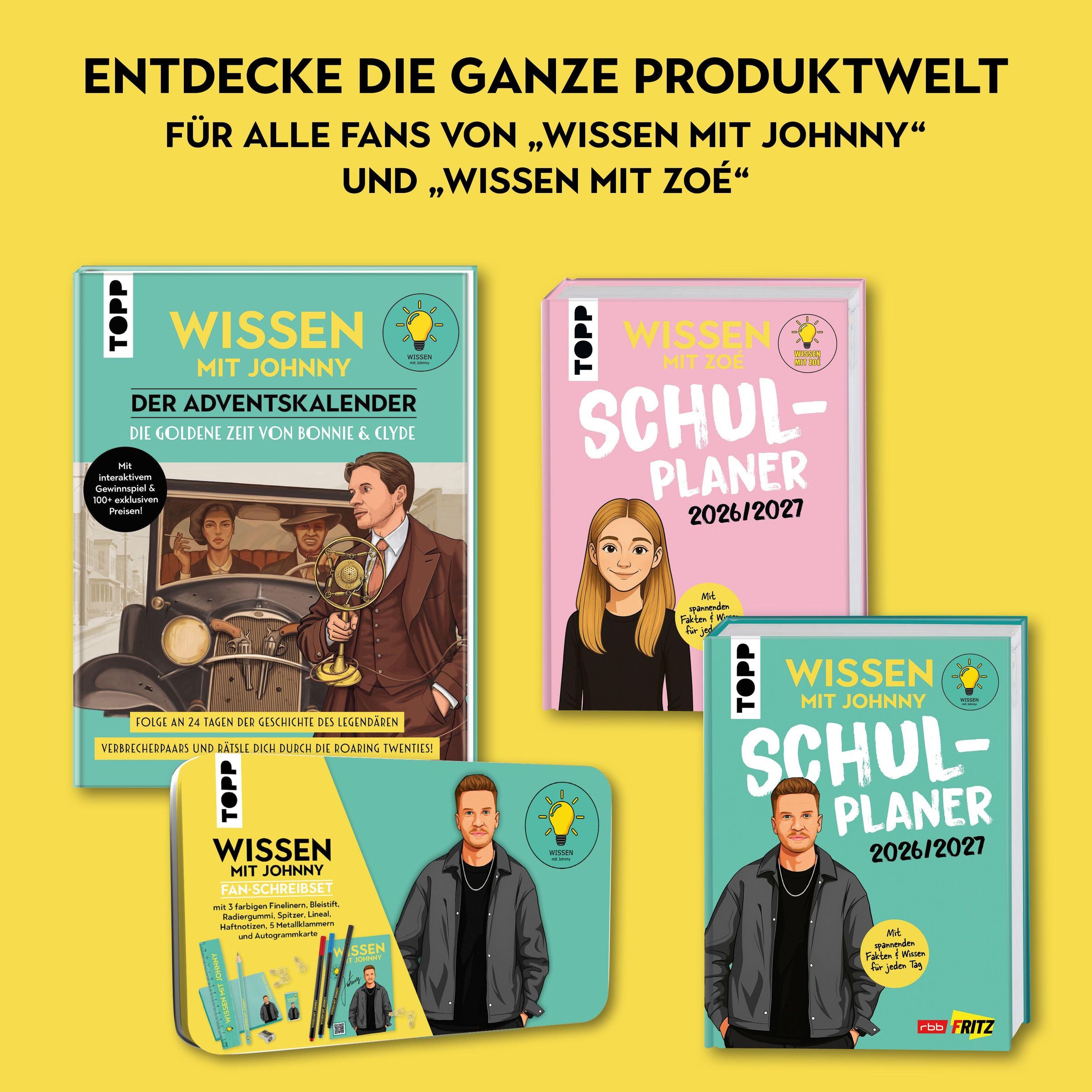 Mit dem ersten Schulplaner von Johnny, dem kreativen Kopf hinter dem erfolgreichen Podcast "Wissen mit Johnny" , wird der Schulalltag nicht nur perfekt organisiert, sondern auch richtig unterhaltsam! Dieser Kalender begleitet dich durchs Schuljahr 2026 / 2027 und verbindet cleveres Planen mit spannendem Wissen - so wird jeder Tag abwechslungsreich und motivierend.