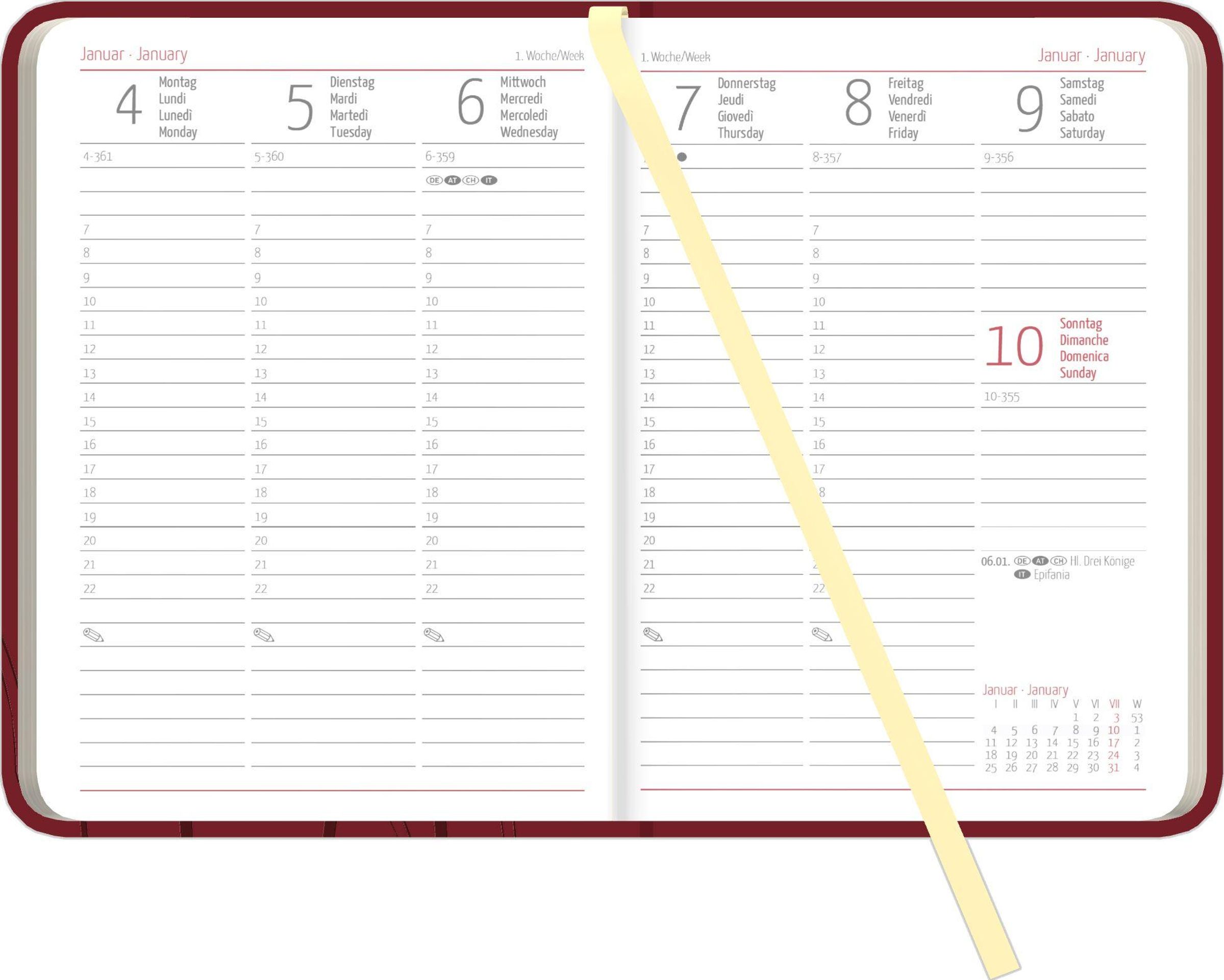 - Gebunden, Lesebändchen, 1 Woche = 2 Seite, gerundete Ecken am Block und Einband