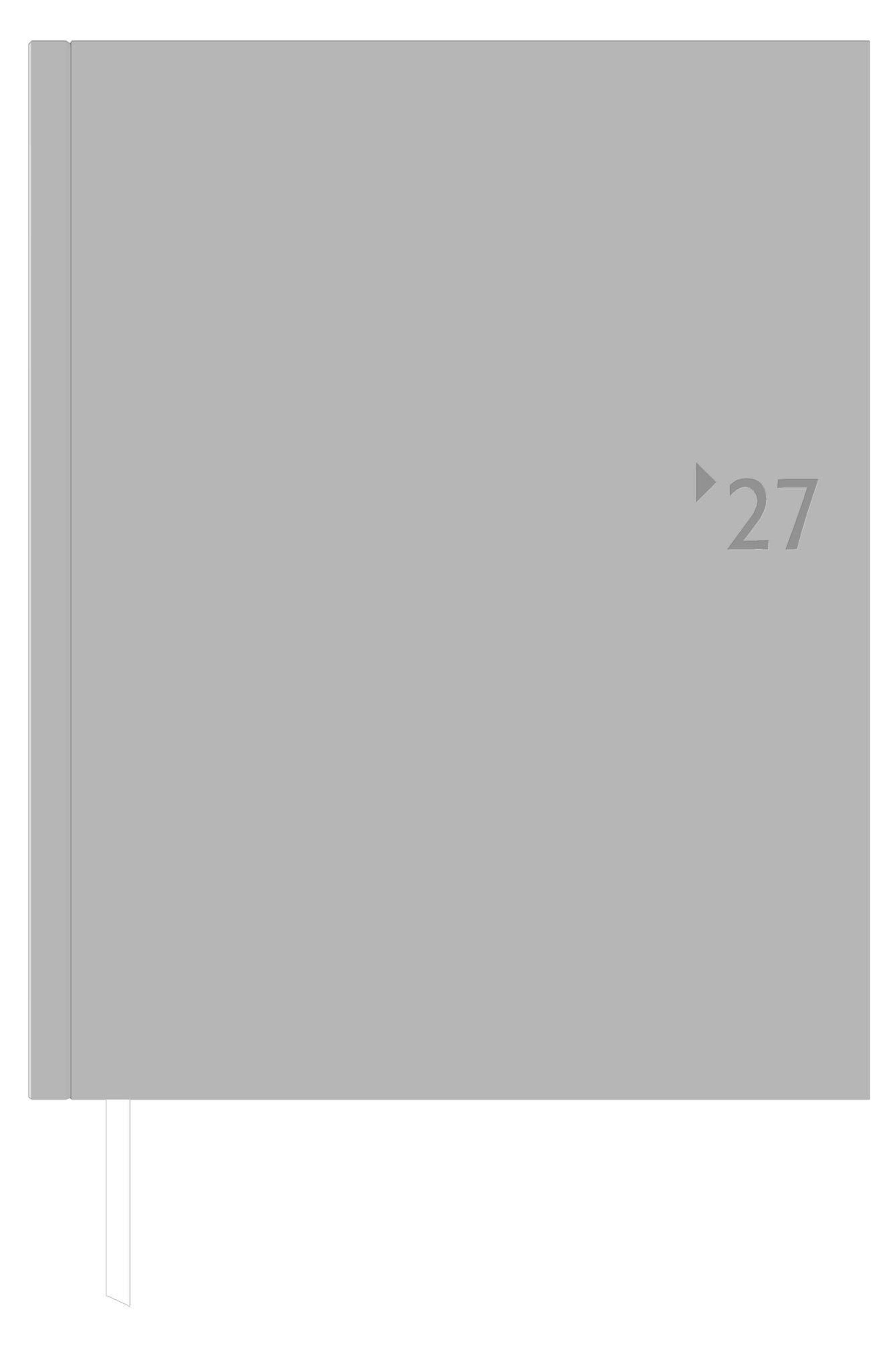 Die Zahl „27“ steht in der rechten unteren Ecke. Ein schlichtes, graues Notizbuch mit Lesezeichen., Kalender