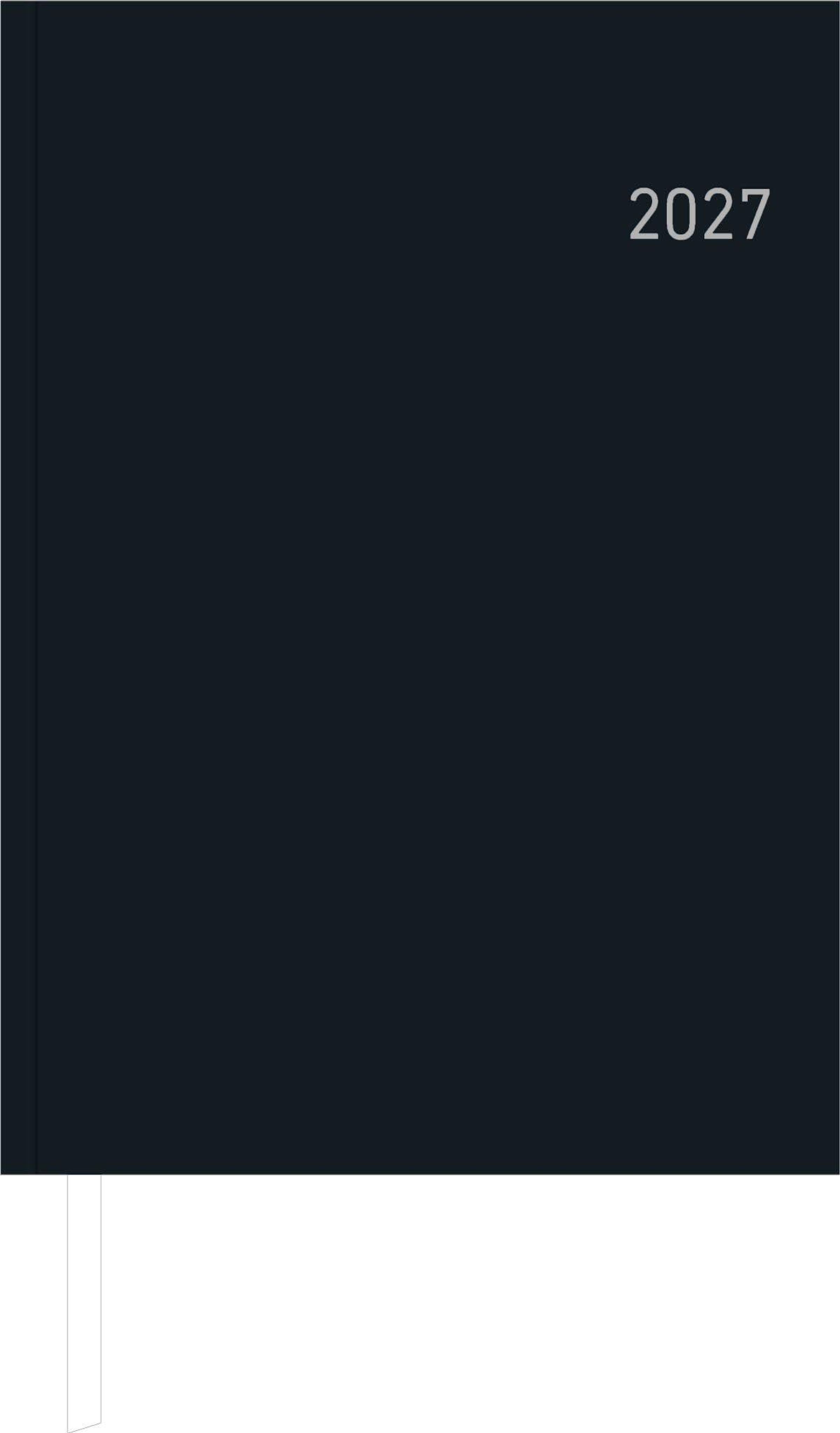 Text "2027" in der oberen rechten Ecke, dunkler Einband, schlichtes Design., Kalender