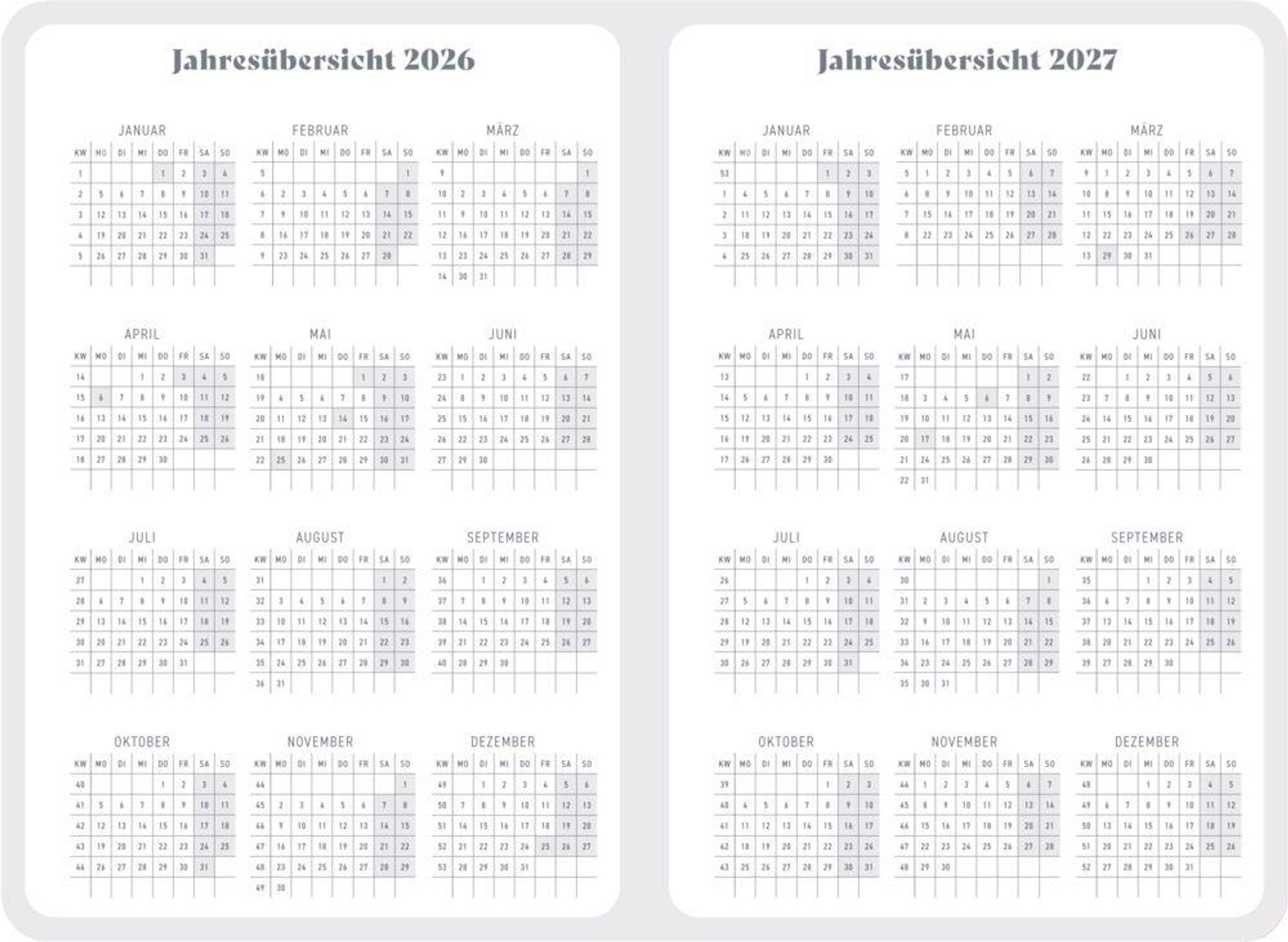 TERMINPLANER 2027: 112 Seiten im handlichen Format HOCHWERTIGE QUALITÄT: Gut aufklappbares Hardcover, Gummiband, Leseband, farbig gestaltete Innenseiten sowie Cover mit Goldfolie DEIN GLÜCKSTAGEBUCH: Auf den modern gestalteten Wochenseiten kannst du täglich deine Stimmung sowie deinen Glücksmoment festhalten und deine Woche reflektieren EXKLUSIVER INHALT: Mit Sternzeichen, Mondphasen und einer Auswahl an Feiertagen verschiedener Religionen BESONDERES GESCHENK: Durch die hochwertige Ausstattung ist dieser Tagesplaner das perfekte Geschenk für mehr Achtsamkeit im Alltag