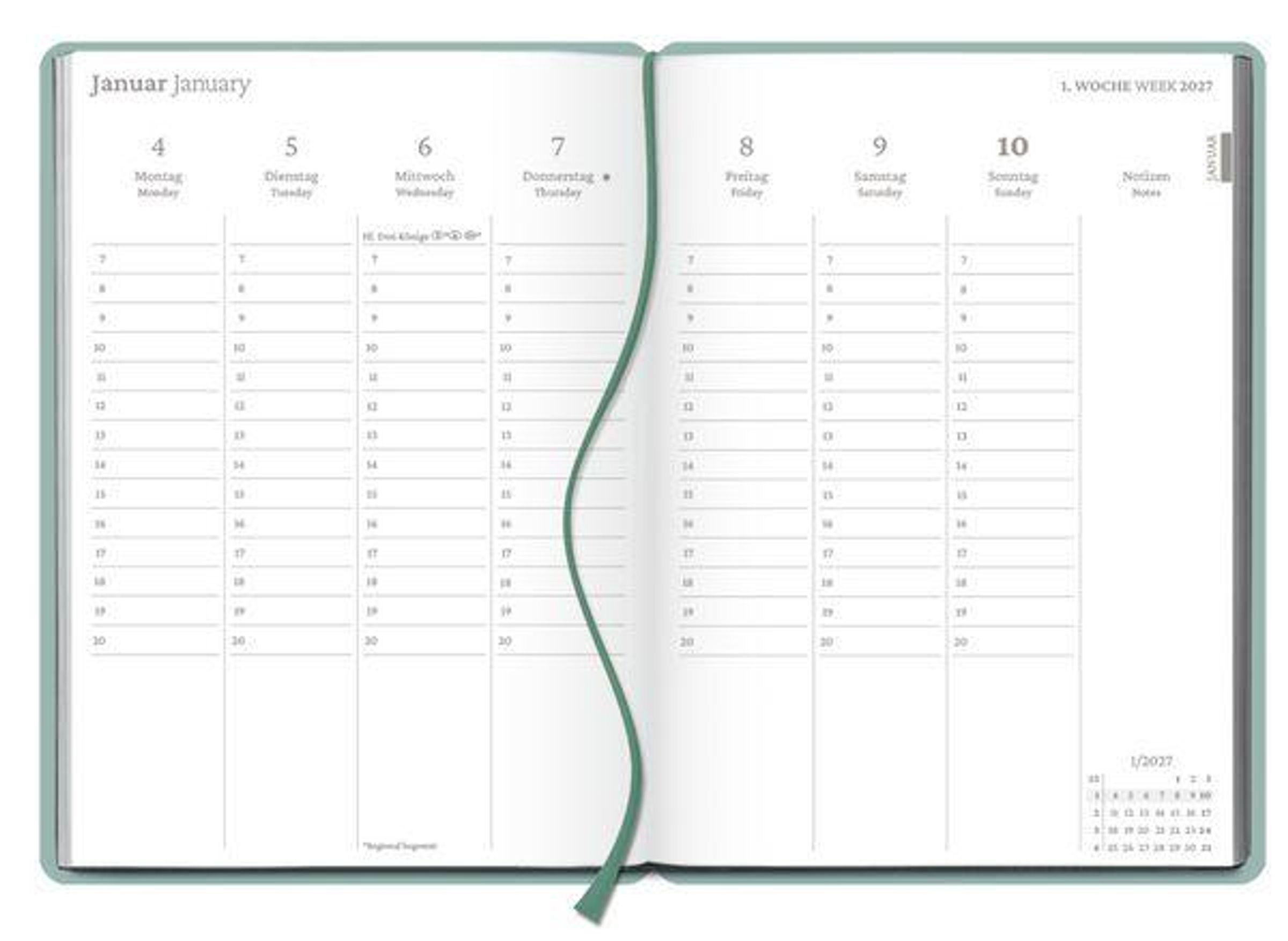 - Pro Woche zwei Seiten, vertikales Kalendarium mit Stundeneinteilung