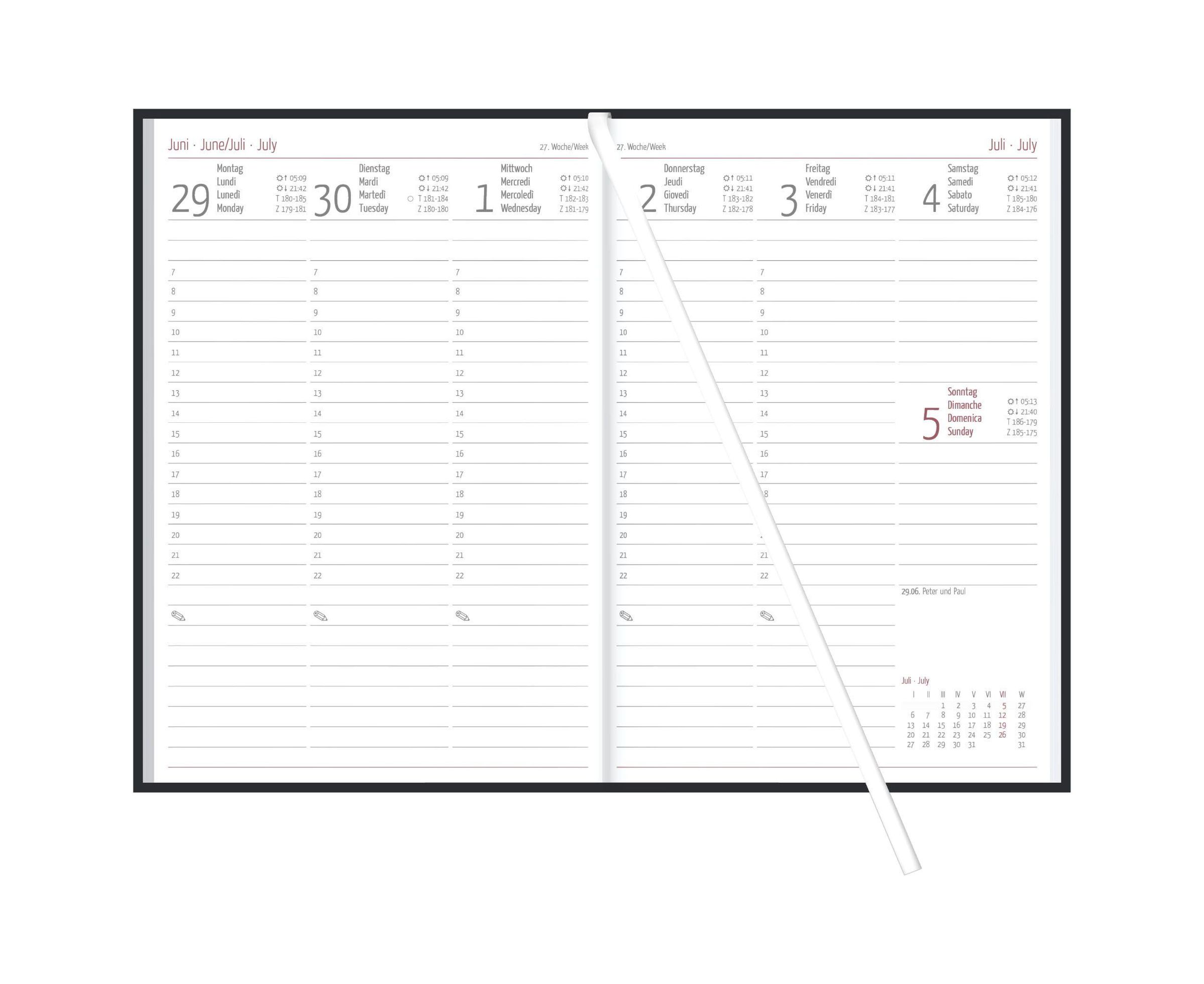 Übersichtliches Kalendarium: 1 Woche auf 2 Seiten mit Zeiteinteilung 7--22 Uhr und Platz für Notizen