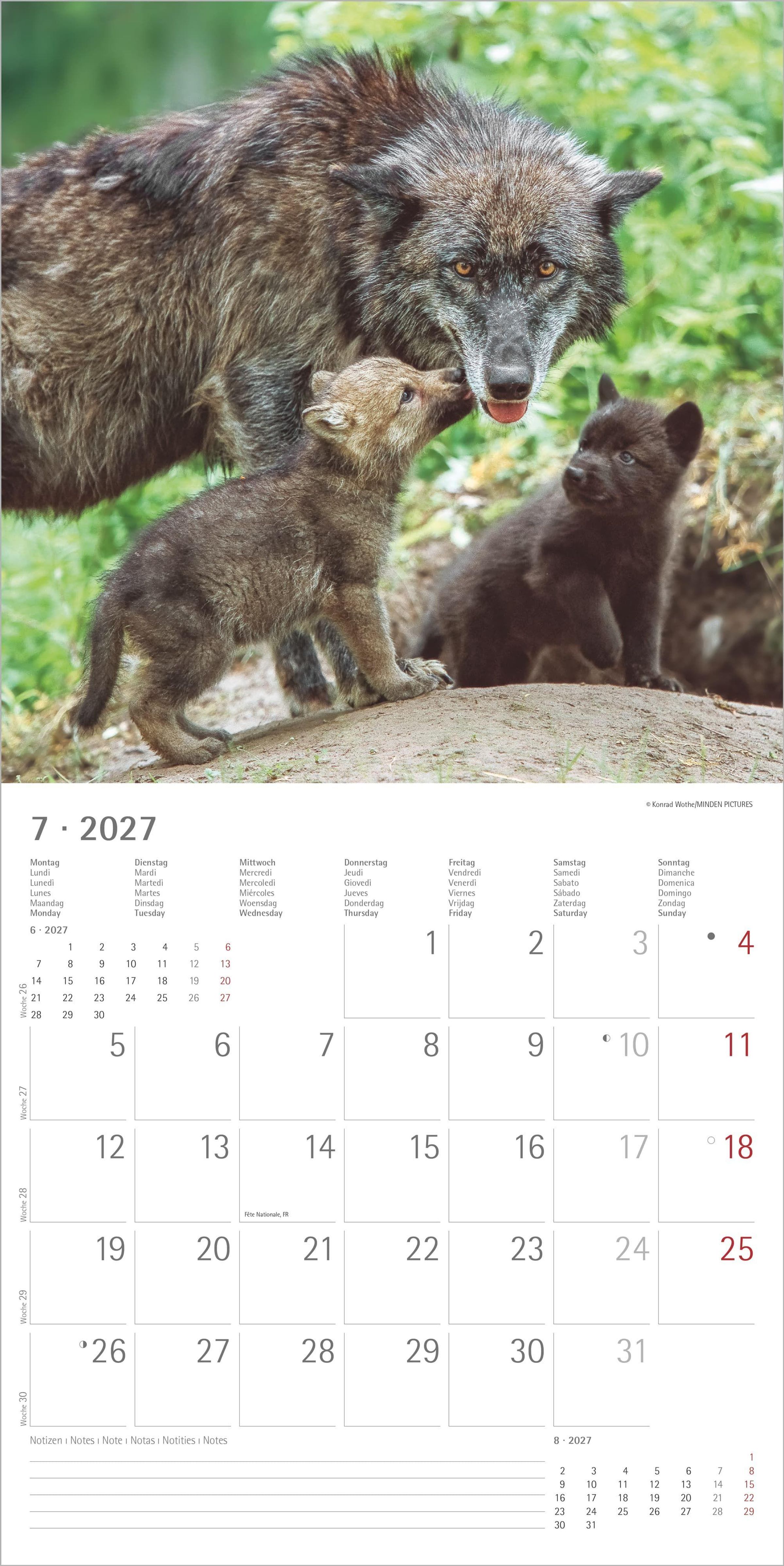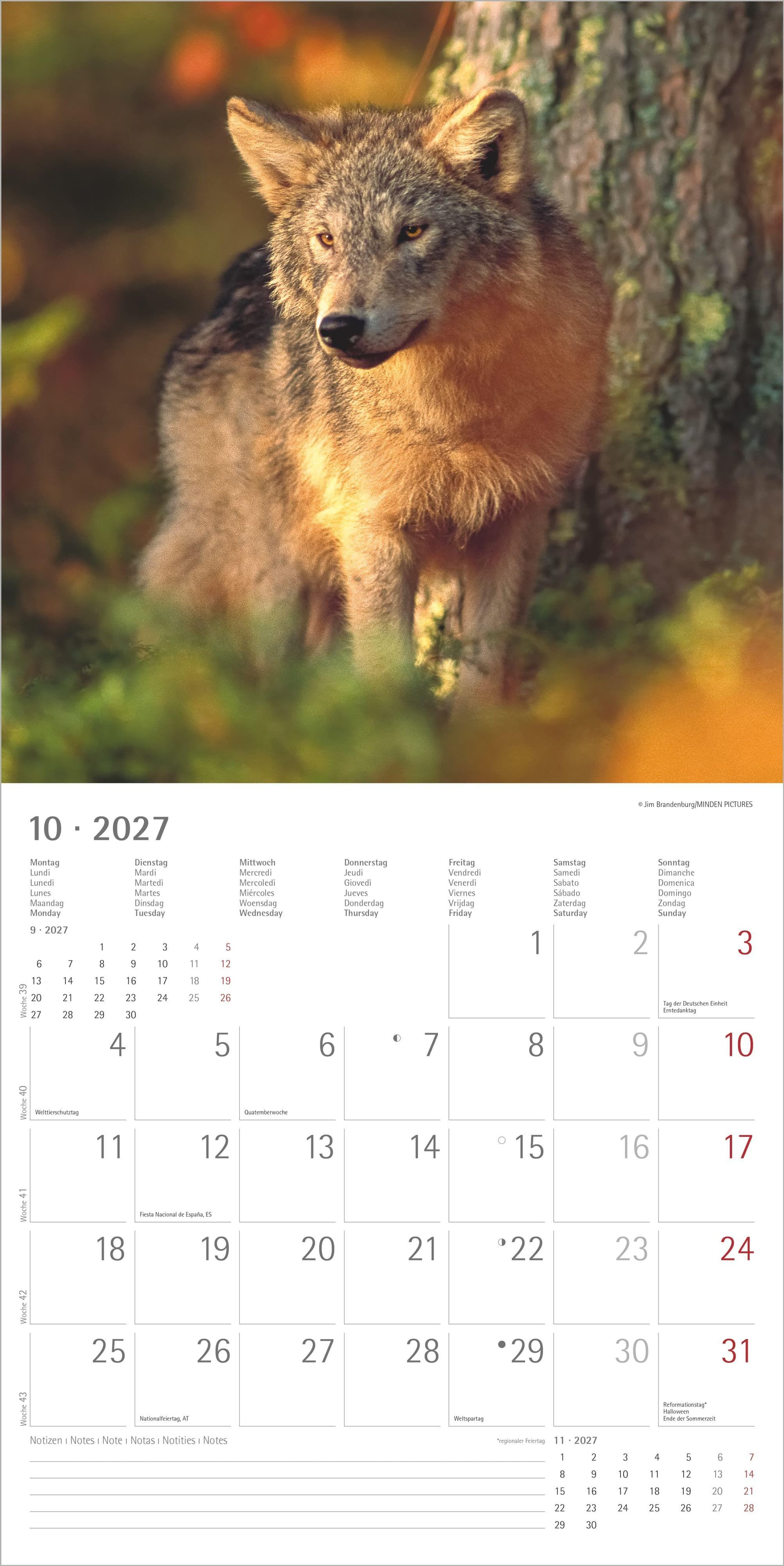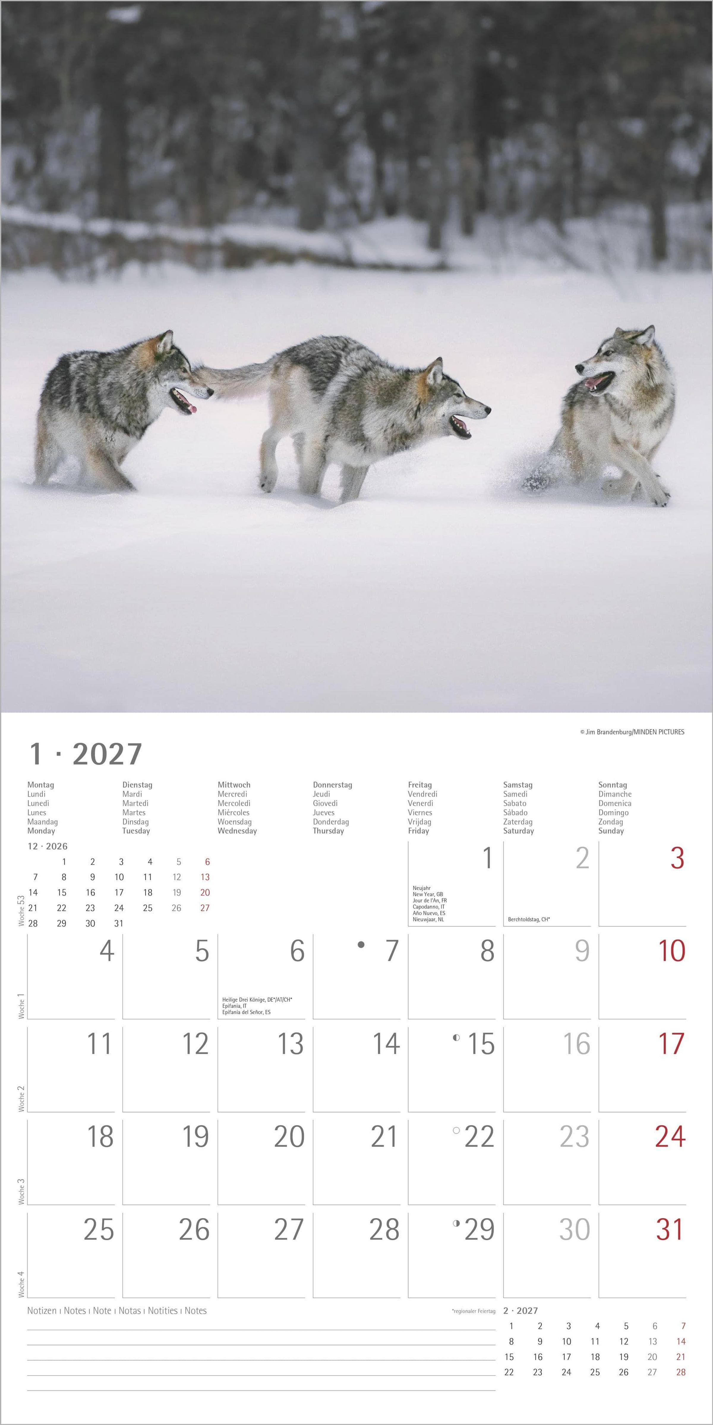 Im großzügigen Format von 30 x 30 cm (geöffnet 30 x 60 cm) kommen die detailreichen Wolfsporträts besonders gut zur Geltung. Das übersichtliche, 6-sprachige Kalendarium enthält Feiertage für zahlreiche Länder, Ferientermine für Deutschland, Österreich und die Schweiz sowie eine Monatsübersicht vom Vor- und Folgemonat. Der große Notizbereich macht den Kalender nicht nur zu einem dekorativen Blickfang, sondern auch zu einem praktischen Planer.