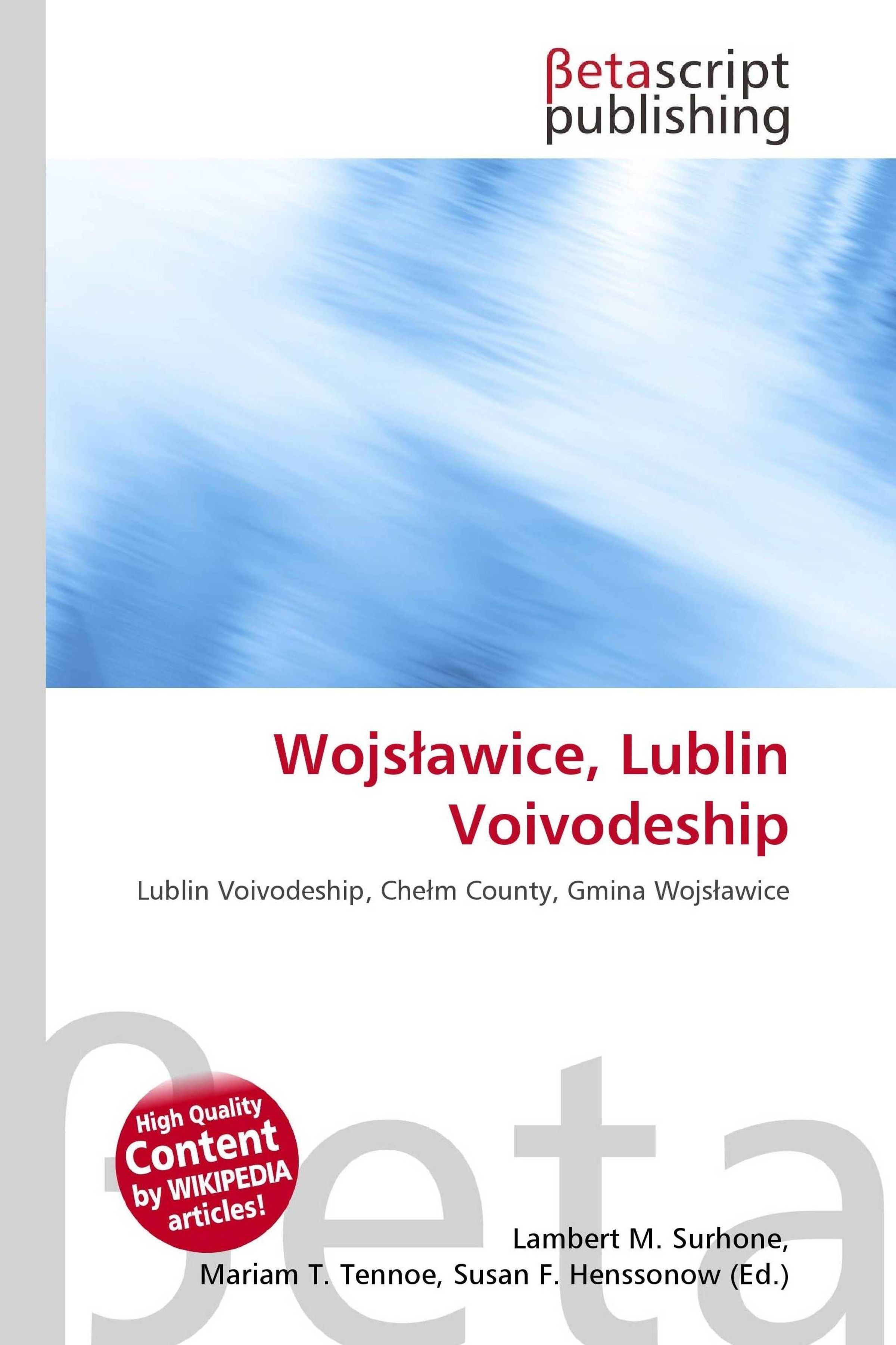 Please note that the content of this book primarily consists of articles available from Wikipedia or other free sources online. Wojsawice is a village in Chem County, Lublin Voivodeship, in eastern Poland. It is the seat of the gmina (administrative district) called Gmina Wojsawice. It lies approximately 26 kilometres (16 mi) south of Chem and 78 km (48 mi) south-east of the regional capital Lublin. The village has an approximate population of 1, 600. Lublin Voivodeship is bordered by Subcarpathian Voivodeship to the south, witokrzyskie Voivodeship to the south-west, Masovian Voivodeship to the west and north, Podlaskie Voivodeship along a short boundary to the north, and Belarus and Ukraine to the east.