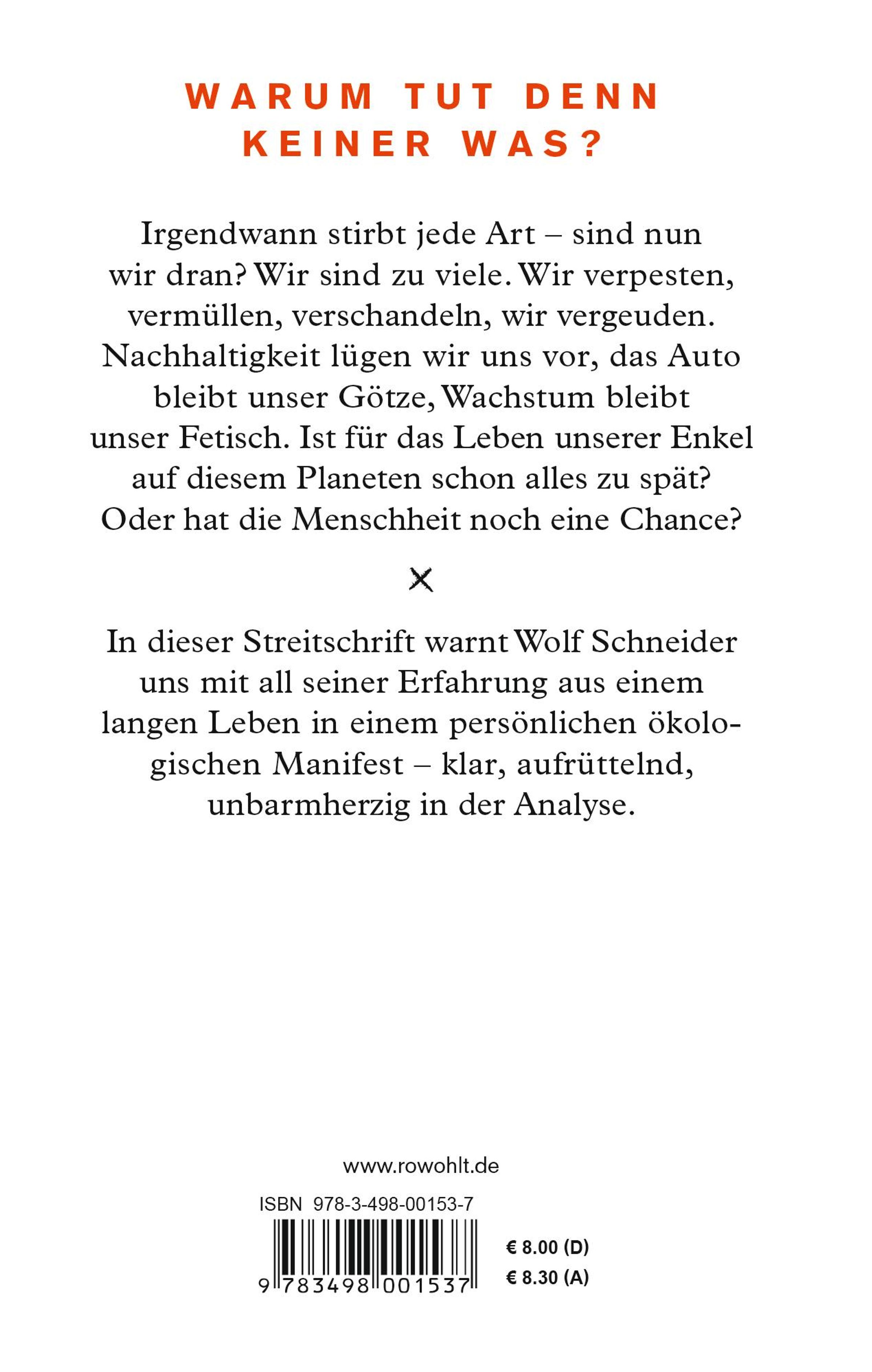 "Warum tut denn keiner was? Irgendwann stirbt jede Art - sind nun wir dran? Wir sind zu viele. Wir verpesten, vermüllen, verschandeln, wir vergeuden. Nachhaltigkeit lügen wir uns vor, das Auto bleibt unser Götze, Wachstum bleibt unser Fetisch." Haben wir noch eine Chance? Oder ist für das Leben unserer Enkel schon alles zu spät? Die Frage nach dem Schicksal und der Menschheit hat Wolf Schneider nie losgelassen. Schon 1966 hat er in der Süddeutschen Zeitung das Ende des Verbrennungsmotors gefordert. In dieser Streitschrift warnt er mit all seiner Erfahrung aus einem langen Leben die Nachgeboren mit einem persönlichen ökologischen Manifest - direkt, aufrüttelnd, unbarmherzig in der Analyse.