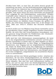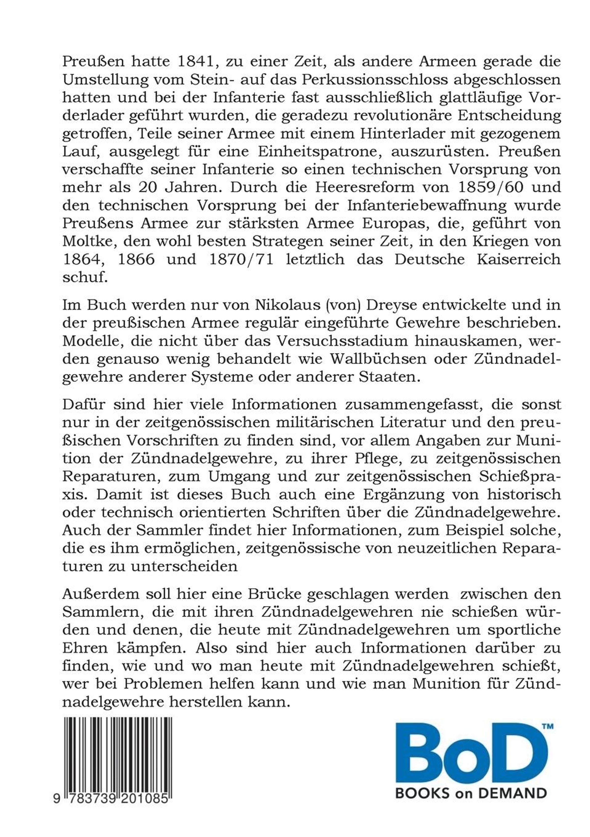 Preußen hatte 1841, zu einer Zeit, als andere Armeen gerade die Umstellung vom Stein- auf das Perkussionsschloss abgeschlossen hatten und bei der Infanterie fast ausschließlich glattläufige Vorderlader geführt wurden, die geradezu revolutionäre Entscheidung getroffen, Teile seiner Armee mit einem Hinterlader mit gezogenem Lauf, ausgelegt für eine Einheitspatrone, auszurüsten. Preußen verschaffte seiner Infanterie so einen technischen Vorsprung von mehr als 20 Jahren. Durch die Heeresreform von 1859 / 60 und den technischen Vorsprung bei der Infanteriebewaffnung wurde Preußens Armee zur stärksten Armee Europas, die, geführt von Moltke, den wohl besten Strategen seiner Zeit, in den Kriegen von 1864, 1866 und 1870 / 71 letztlich das Deutsche Kaiserreich schuf. Im Buch werden nur von Nikolaus (von) Dreyse entwickelte und in der preußischen Armee regulär eingeführte Gewehre beschrieben. Modelle, die nicht über das Versuchsstadium hinauskamen, werden genauso wenig behandelt wie Wallbüchsen oder Zündnadelgewehre anderer Systeme oder anderer Staaten. Dafür sind hier viele Informationen zusammengefasst, die sonst nur in der zeitgenössischen militärischen Literatur und den preußischen Vorschriften zu finden sind, vor allem Angaben zur Munition der Zündnadelgewehre, zu ihrer Pflege, zu zeitgenössischen Reparaturen, zum Umgang und zur zeitgenössischen Schießpraxis. Damit ist dieses Buch auch eine Ergänzung von historisch oder technisch orientierten Schriften über die Zündnadelgewehre. Auch der Sammler findet hier Informationen, zum Beispiel solche, die es ihm ermöglichen, zeitgenössische von neuzeitlichen Reparaturen zu unterscheiden. Außerdem soll hier eine Brücke geschlagen werden zwischen den Sammlern, die mit ihren Zündnadelgewehren nie schießen würden und denen, die heute mit Zündnadelgewehren um sportliche Ehren kämpfen. Also sind hier auch Informationen darüber zu finden, wie und wo man heute mit Zündnadelgewehren schießt, wer bei Problemen helfen kann und wie man Munition für Zündnadelgewehre herstellen kann.