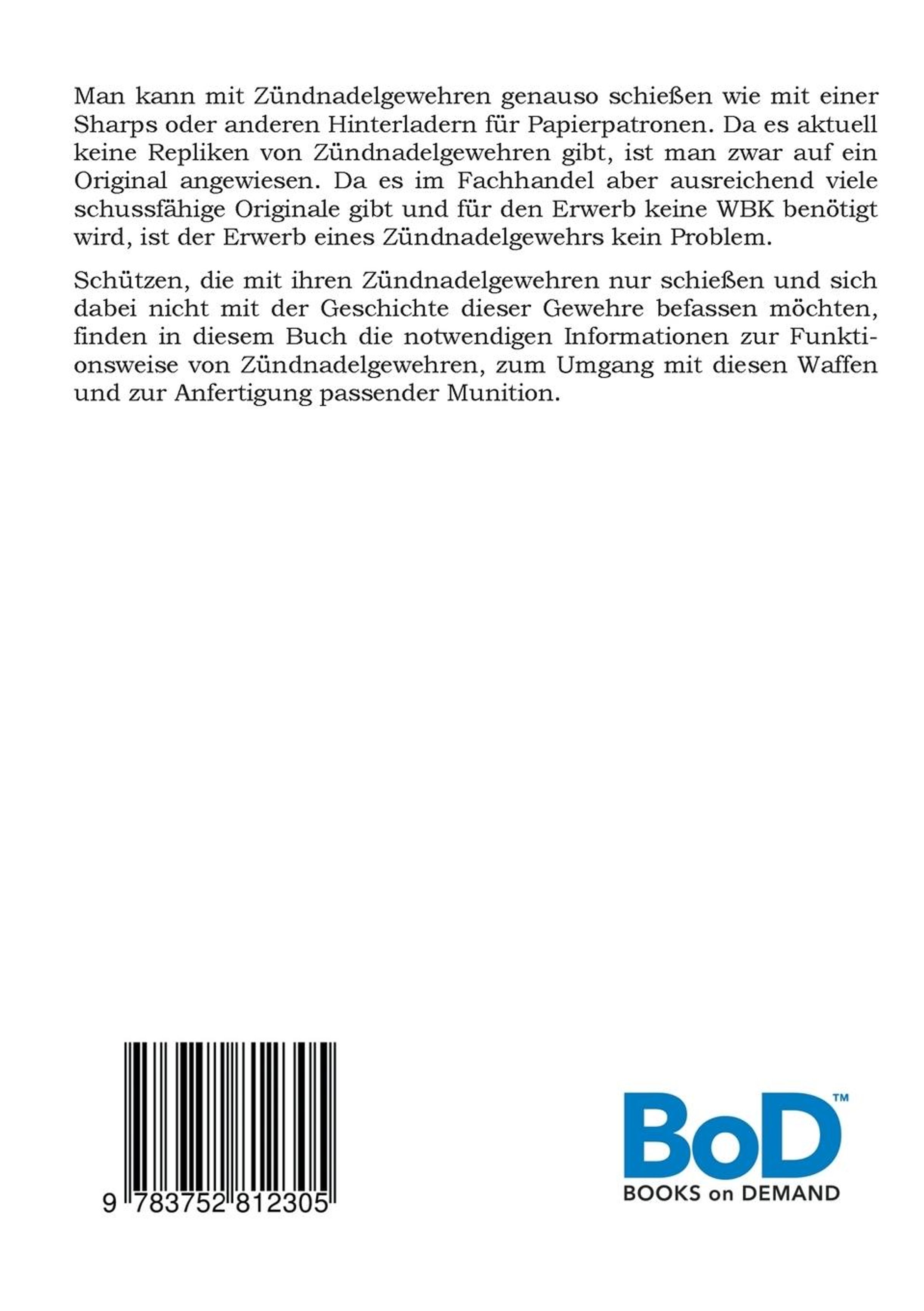 Man kann mit Zündnadelgewehren genauso schießen wie mit einer Sharps oder anderen Hinterladern für Papierpatronen. Da es aktuell keine Repliken von Zündnadelgewehren gibt, ist man dafür auf ein Original angewiesen. Da es im Fachhandel aber ausreichend viele schussfähige Originale gibt und für den Erwerb keine WBK benötigt wird, ist der Erwerb eines Zündnadelgewehrs kein Problem. Schützen, die mit ihren Zündnadelgewehren nur schießen und sich dabei nicht mit der Geschichte befassen möchten, finden in diesem Buch die notwendigen Informationen zur Funktionsweise von Zündnadelgewehren, zum Umgang mit diesen Waffen und zur Anfertigung passender Munition.