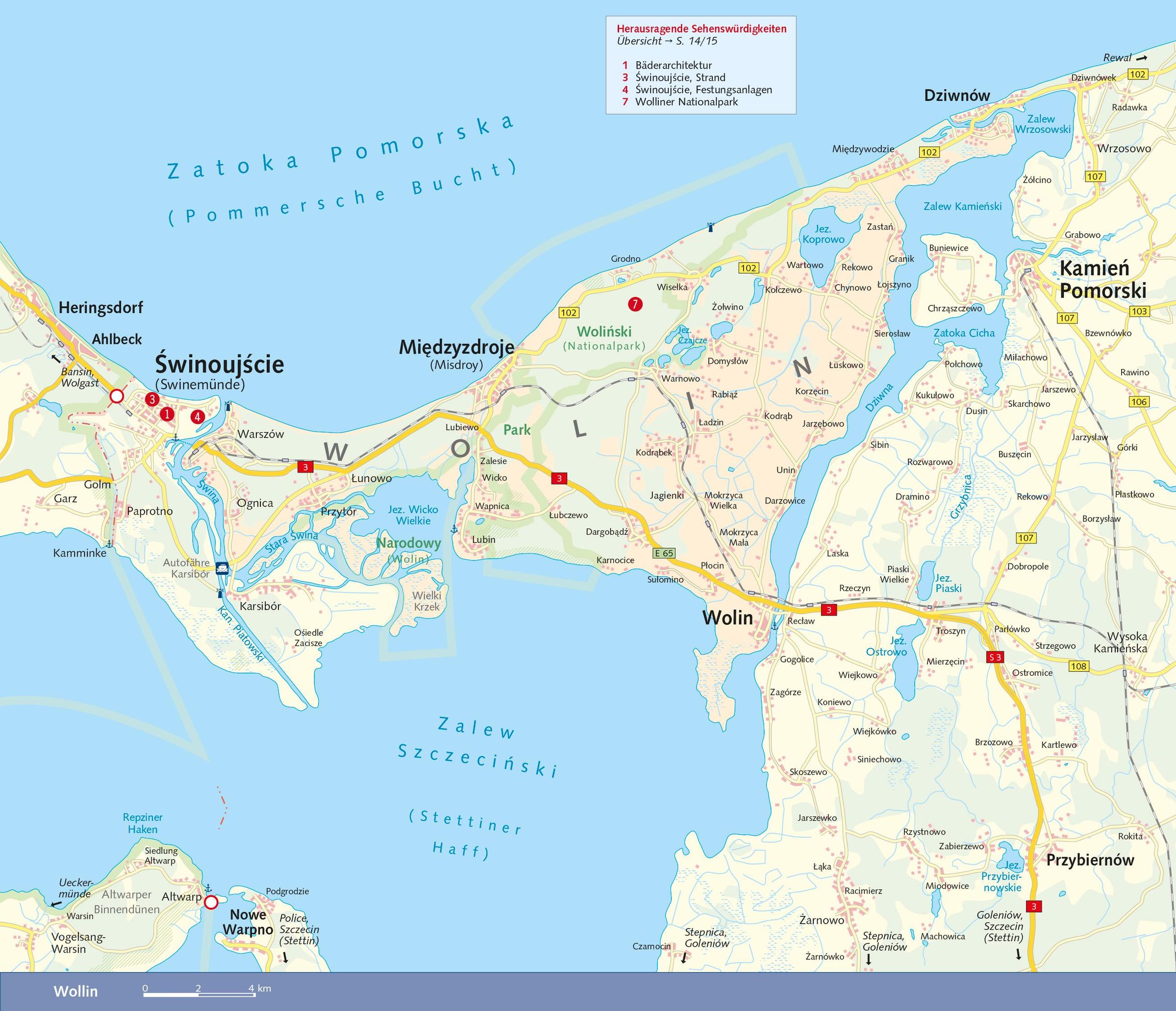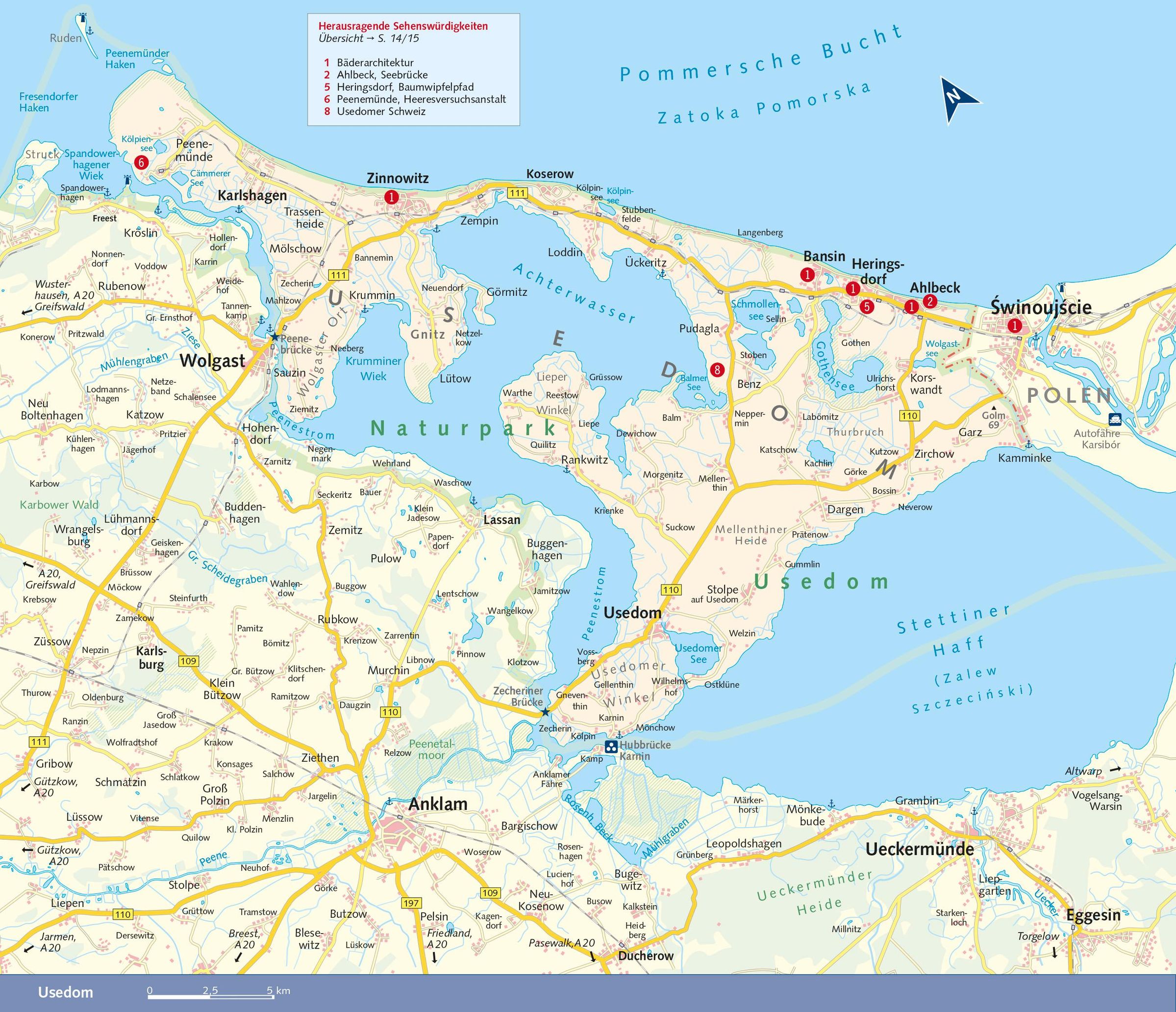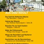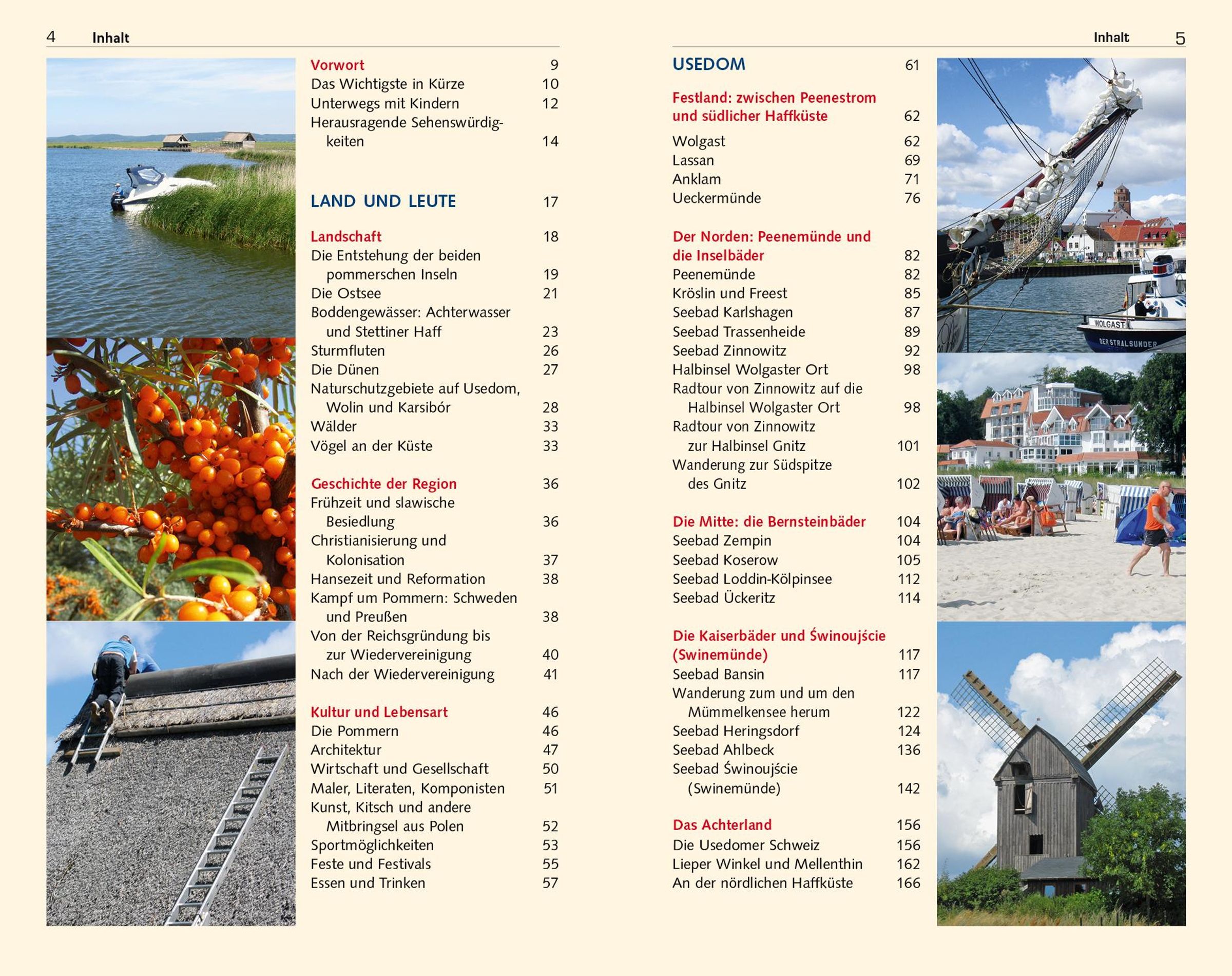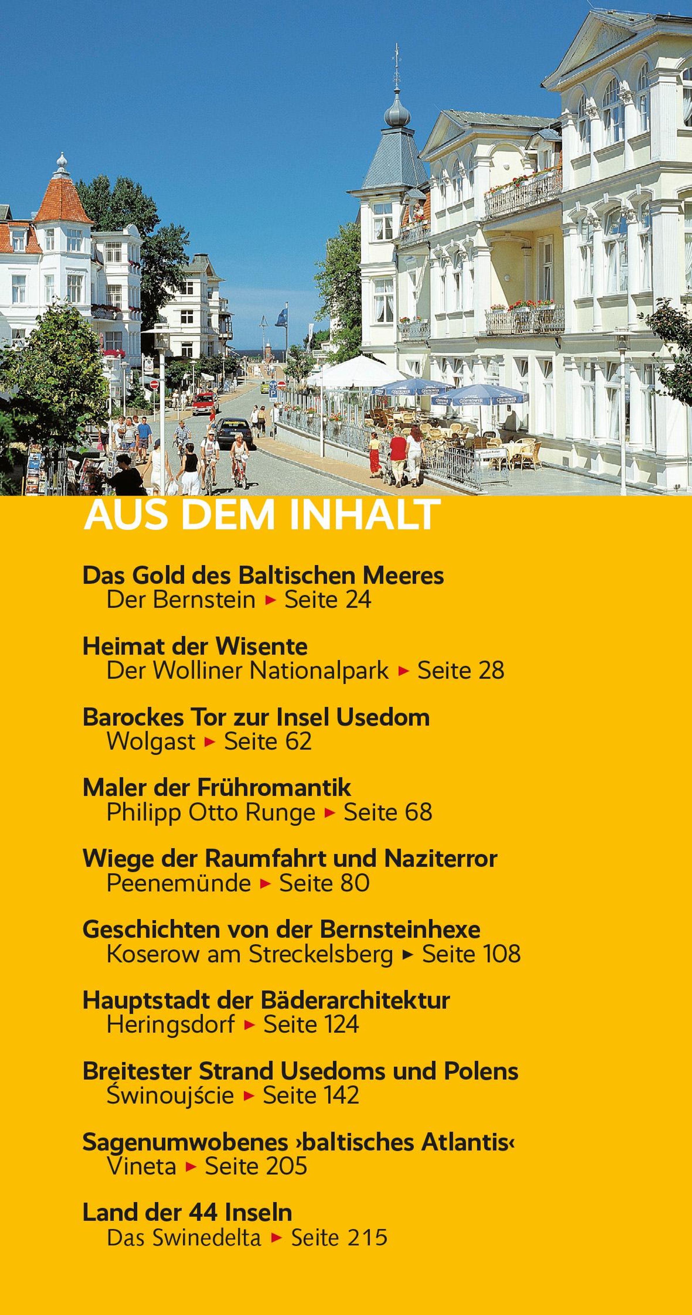 DAS GOLD DES BALTISCHEN MEERES Der Bernstein > Seite 24 HEIMAT DER WISENTE Der Wolliner Nationalpark > Seite 28 BAROCKES TOR ZUR INSEL USEDOM Wolgast > Seite 62 MALER DER FRÜHROMANTIK Philipp Otto Runge > Seite 68 WIEGE DER RAUMFAHRT UND NAZITERROR Peenemünde > Seite 80 GESCHICHTEN VON DER BERNSTEINHEXE Koserow am Streckelsberg > Seite 108 HAUPTSTADT DER BÄDERARCHITEKTUR Heringsdorf > Seite 124 BREITESTER STRAND USEDOMS UND POLENS ¿winouj¿cie > Seite 142 SAGENUMWOBENES "BALTISCHES ATLANTIS" Vineta > Seite 205 LAND DER 44 INSELN Das Swinedelta > Seite 215