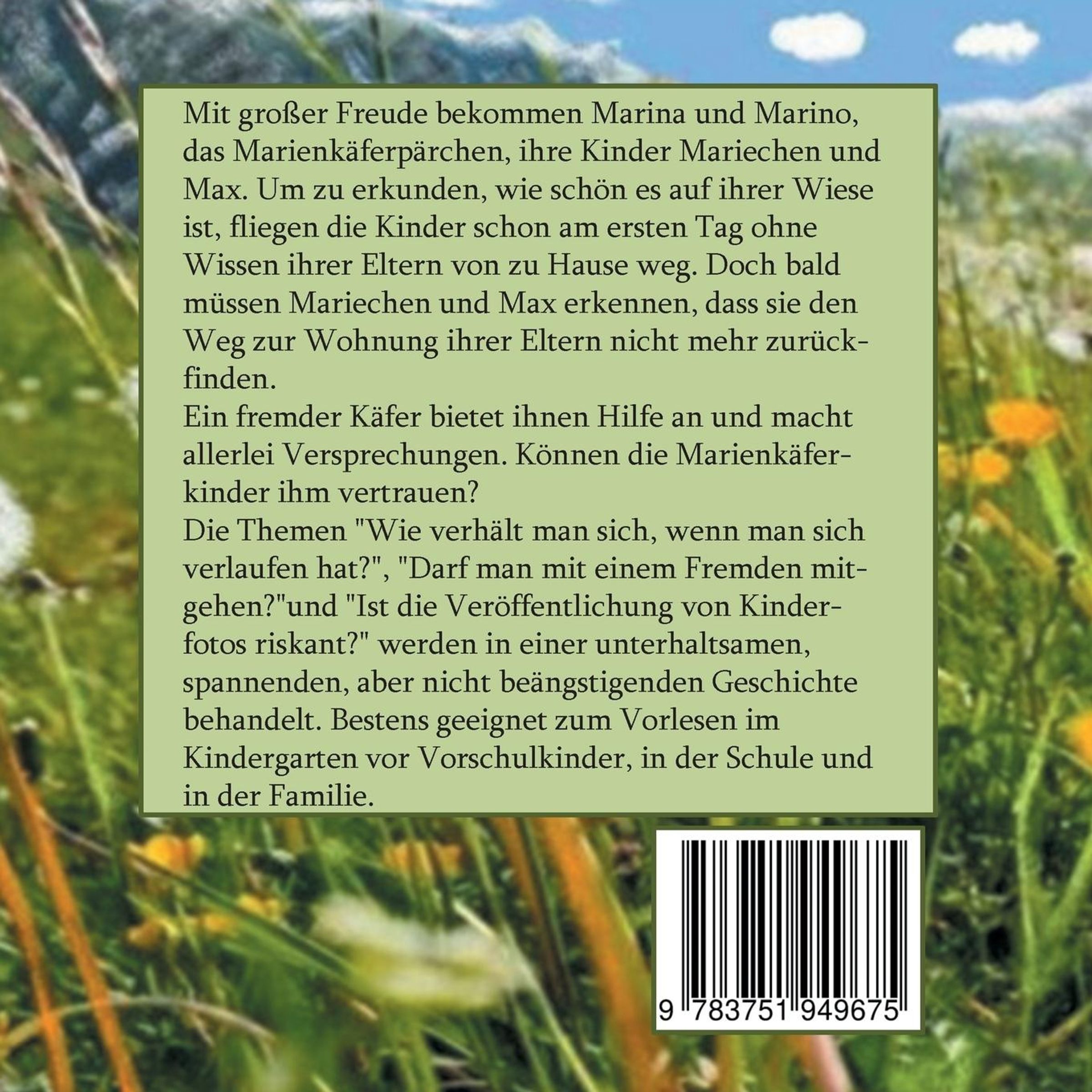 Mit großer Freude bekommen Marina und Marino, das Marienkäferpärchen, ihre Kinder Mariechen und Max. Um zu erkunden, wie schön es auf ihrer Wiese ist, fliegen die Kinder schon am ersten Tag ohne Wissen ihrer Eltern von zu Hause weg. Doch bald müssen Mariechen und Max erkennen, dass sie den Weg zur Wohnung ihrer Eltern nicht mehr zurückfinden. Ein fremder Käfer bietet ihnen Hilfe an und macht allerlei Versprechungen. Können die Marienkäferkinder ihm vertrauen? Die Themen "Wie verhält man sich, wenn man sich verlaufen hat?", "Darf man mit einem Fremden mitgehen?"und "Ist die Veröffentlichung von Kinderfotos riskant?" werden in einer unterhaltsamen, spannenden, aber nicht beängstigenden Geschichte behandelt. Bestens geeignet zum Vorlesen im Kindergarten vor Vorschulkinder, in der Schule und in der Familie.