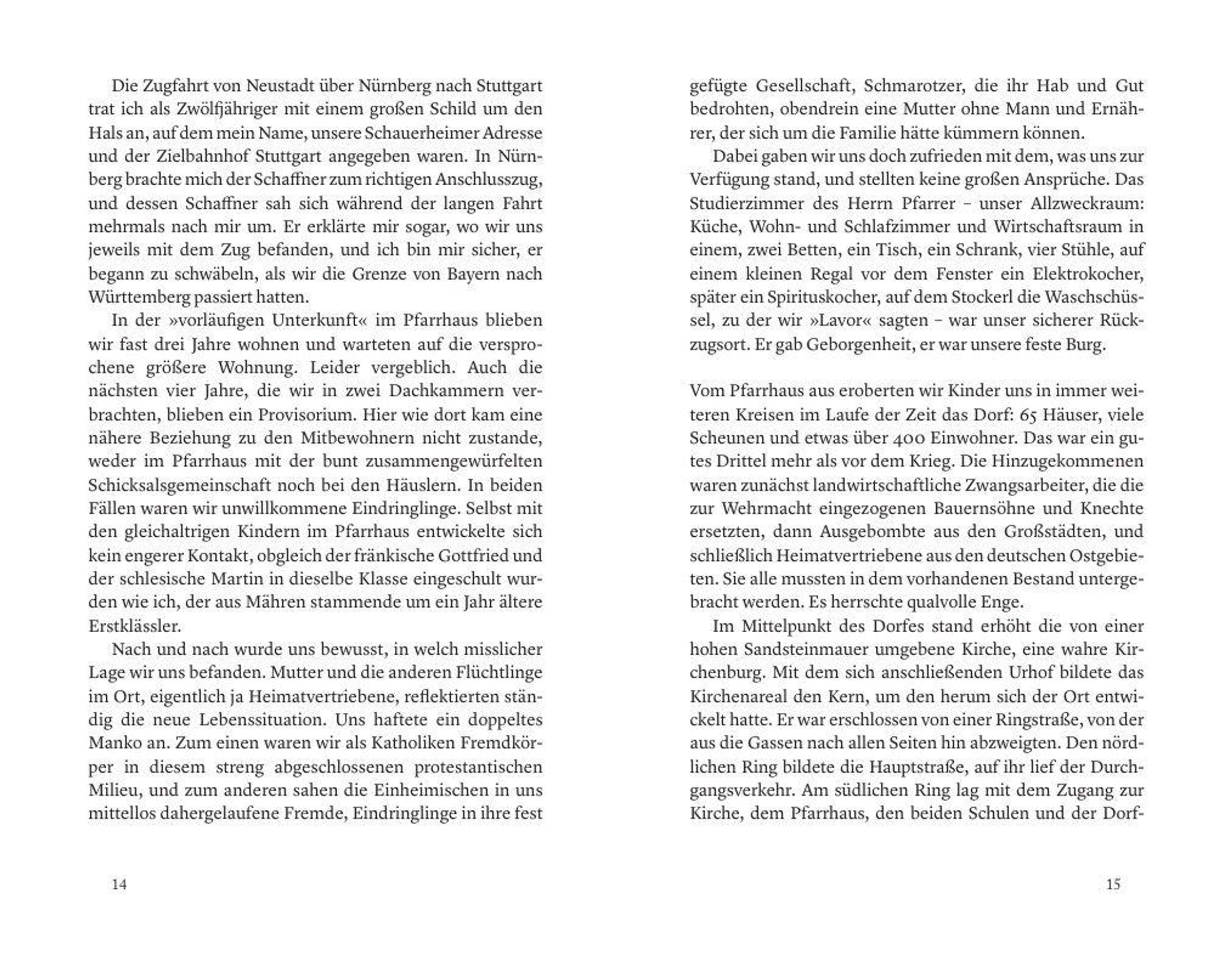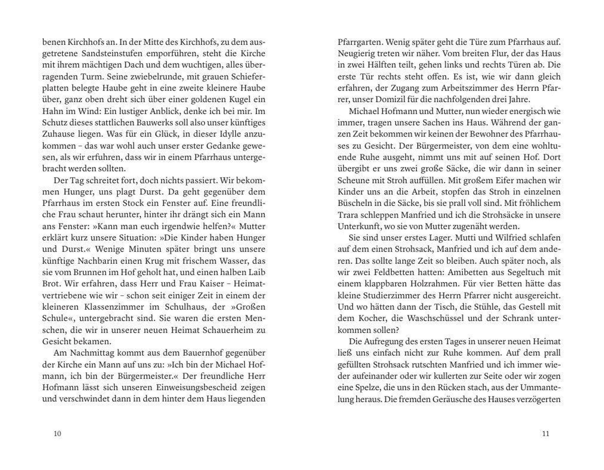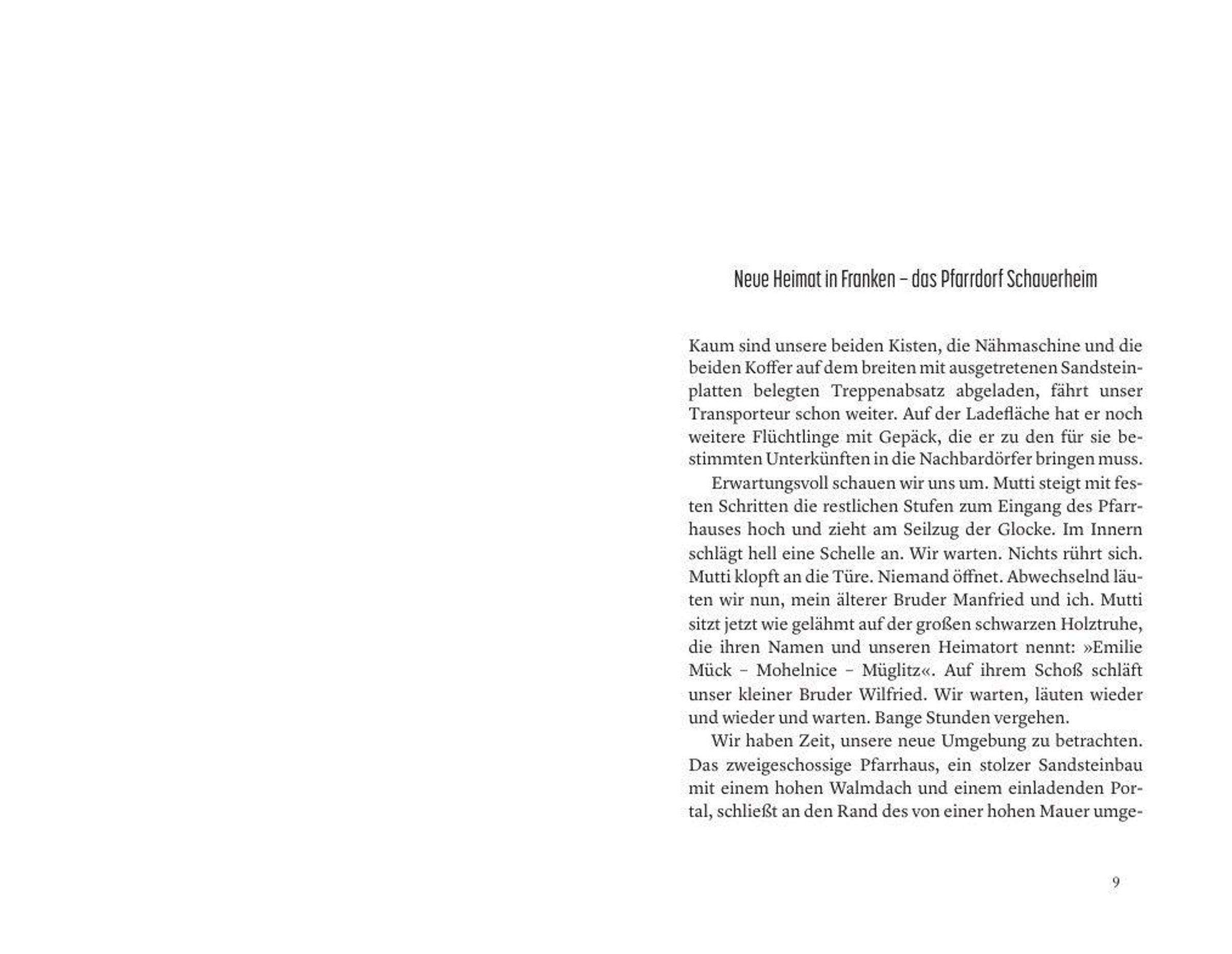 Der siebenjährige Wolfgang kommt im Jahr 1946 mit seiner Mutter und seinen zwei Brüdern nach der Vertreibung aus Mähren im fränkischen Dorf Schauerheim an und muss für einige Jahre ein provisorisches Notquartier im Pfarrhaus beziehen. Schritt für Schritt lebt sich die Familie in die festgefügte Dorfgemeinschaft ein, stößt teils auf freundliche Unterstützung, teils aber auch auf strikte Ablehnung und heftige Ressentiments gegen die sogenannten >>Rucksackdeutschen<<.