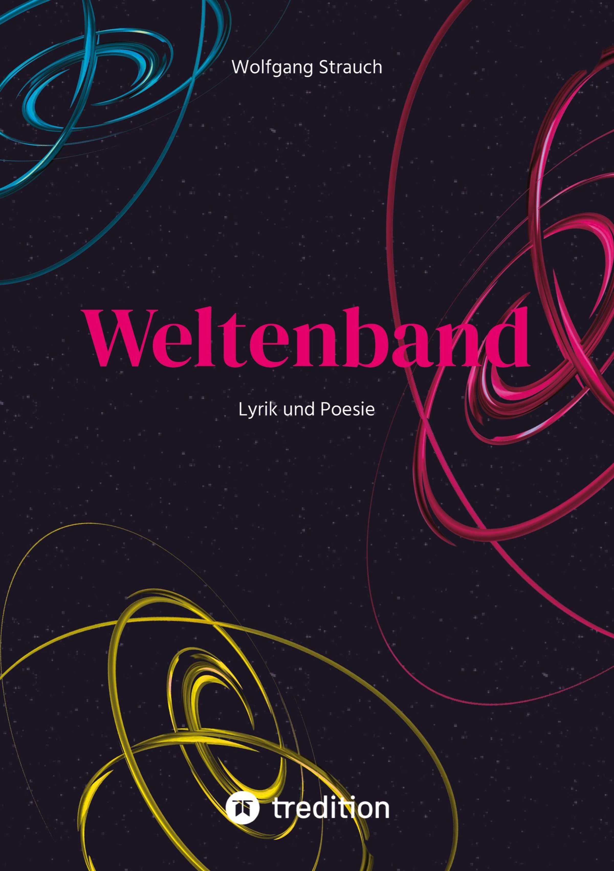 "Weltenband: Lyrik und Poesie" von Wolfgang Strauch. Bunte, dynamische Spiralen vor einem dunklen Hintergrund., Buch