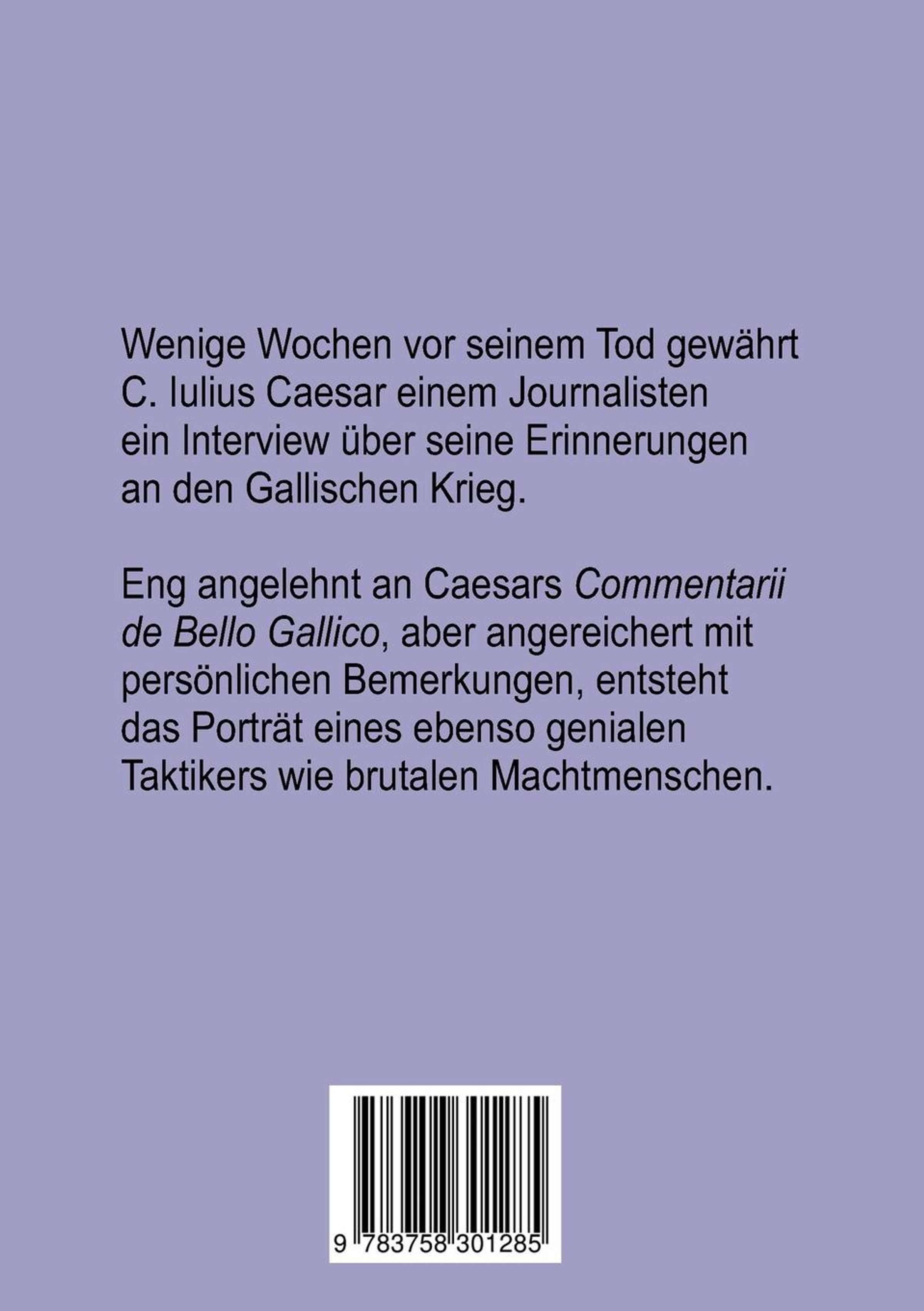 Wenige Wochen vor seiner Ermordung gewährt Caesar einem Journalisten ein Interview über seine Erinnerungen an den Gallischen Krieg. Eng angelehnt an Caesars "Commentarii de bello Gallico", aber angereichert mit persönlichen Bemerkungen, entsteht das Porträt eines genialen Taktikers und brutalen Machtmenschen.