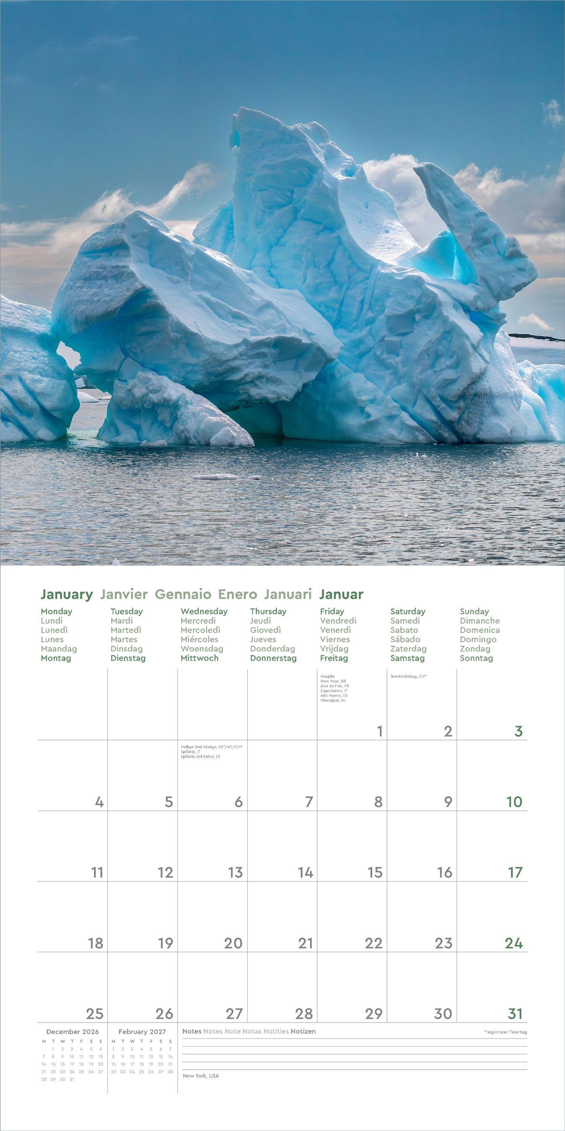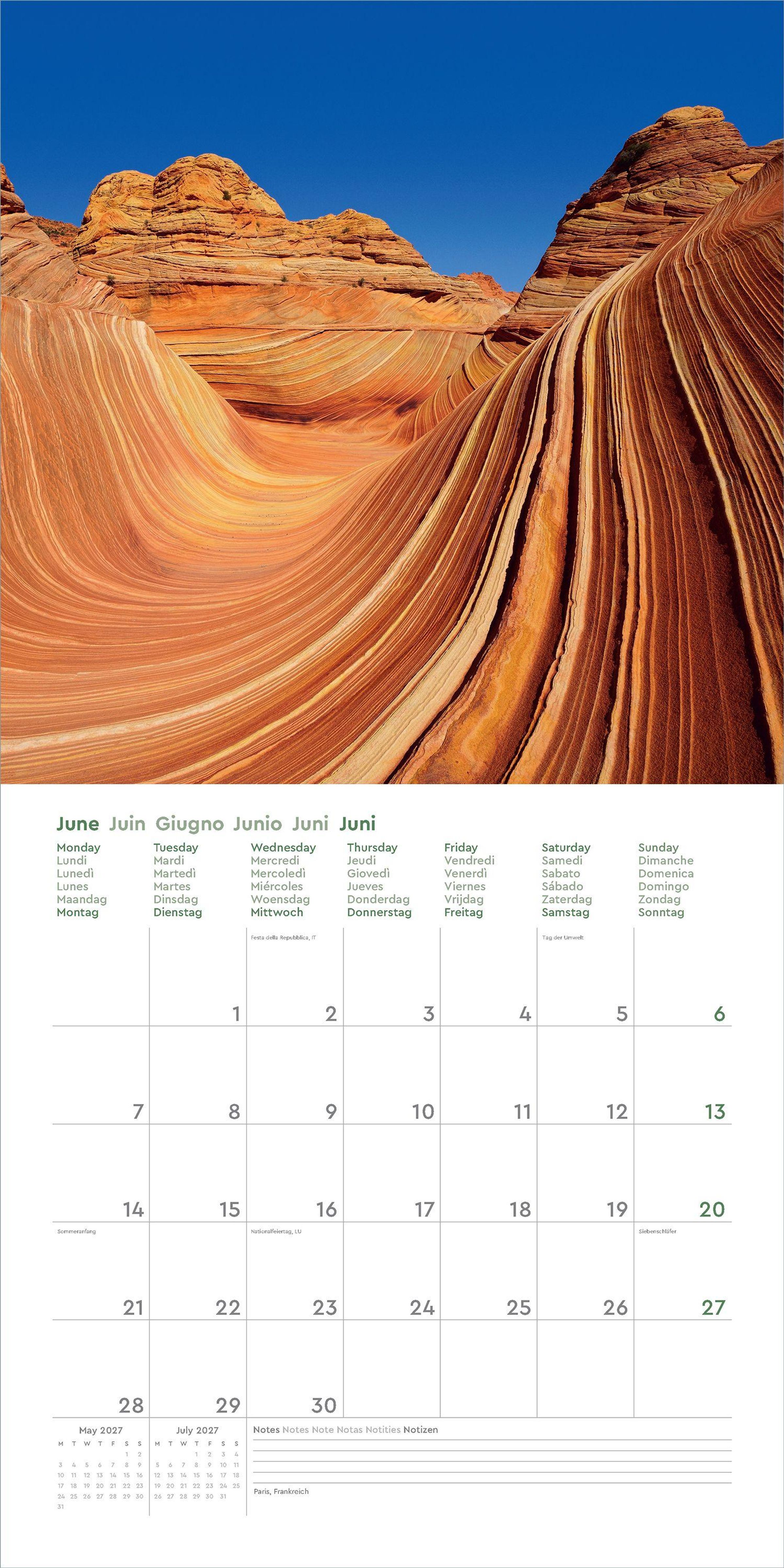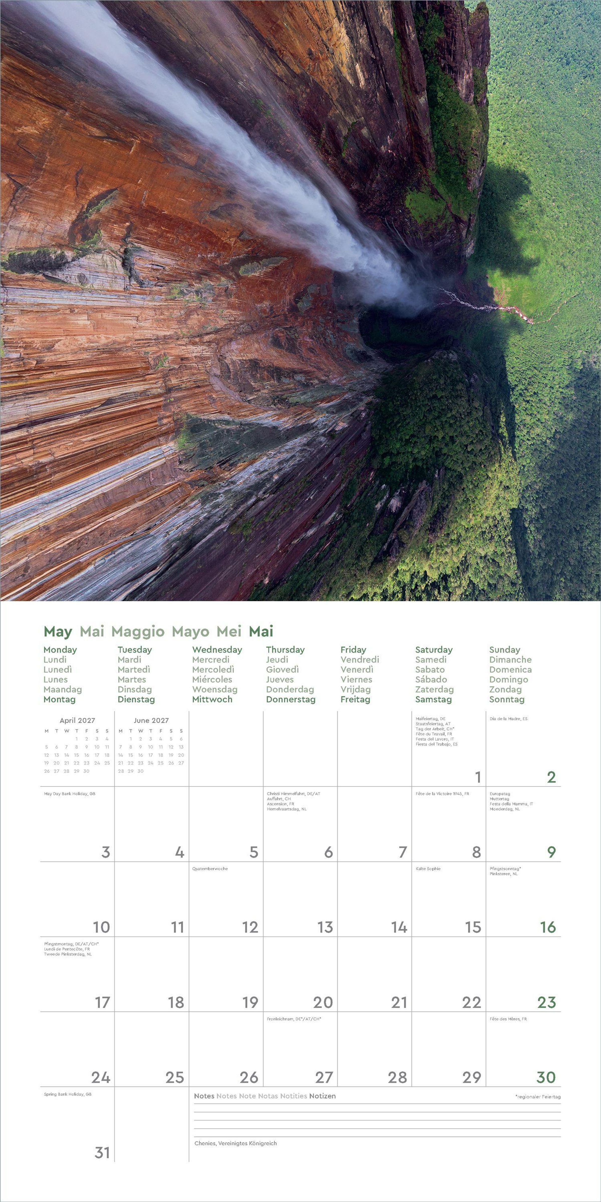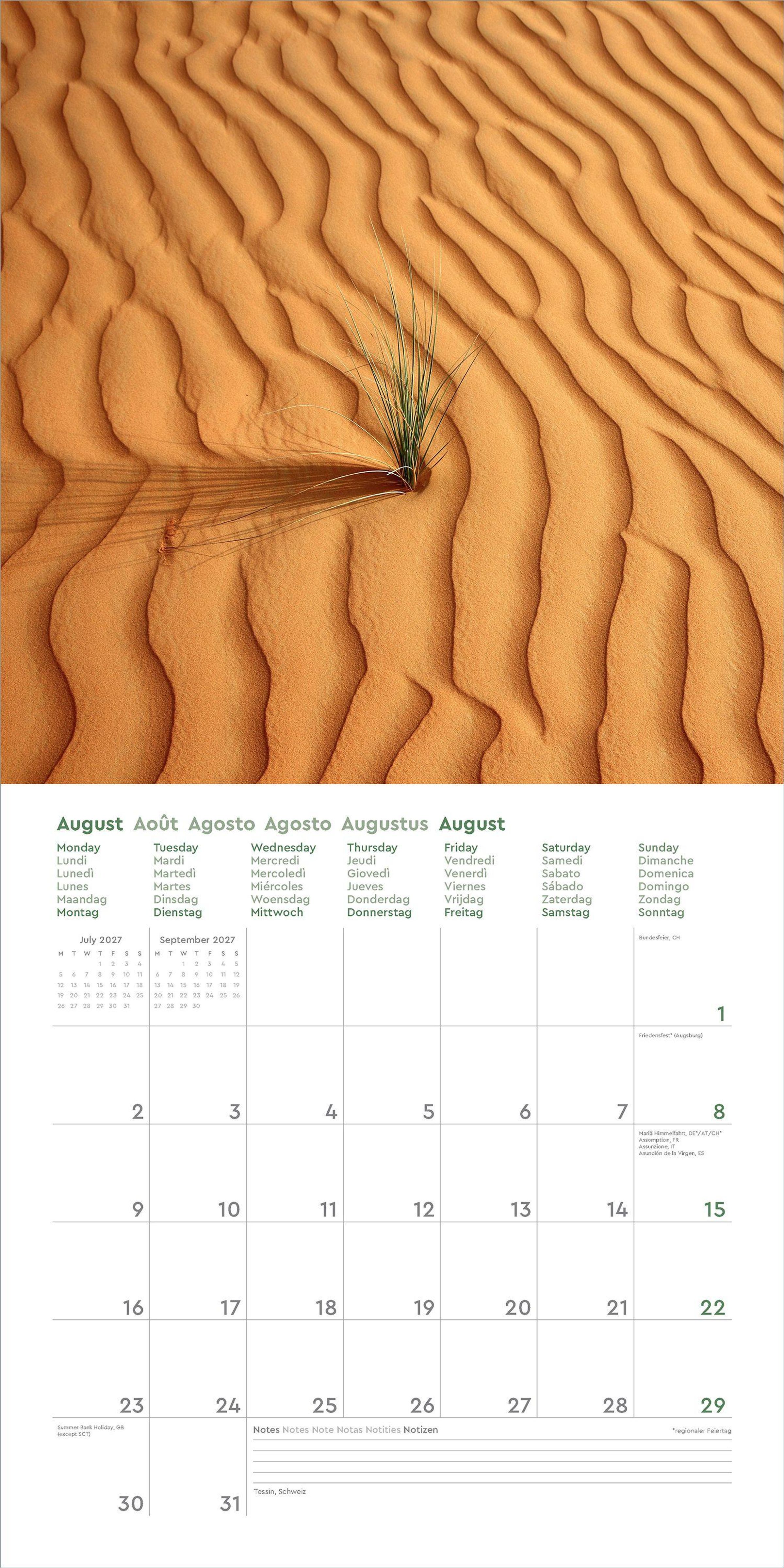 Aufgeklappt zeigt der Broschürenkalender Fotografien zum Wegträumen und bietet gleichzeitig viel Raum für Notizen Tag um Tag. Auch nach dem Jahr eignen sich die 30 x 30 cm großen Bilder als Poster.