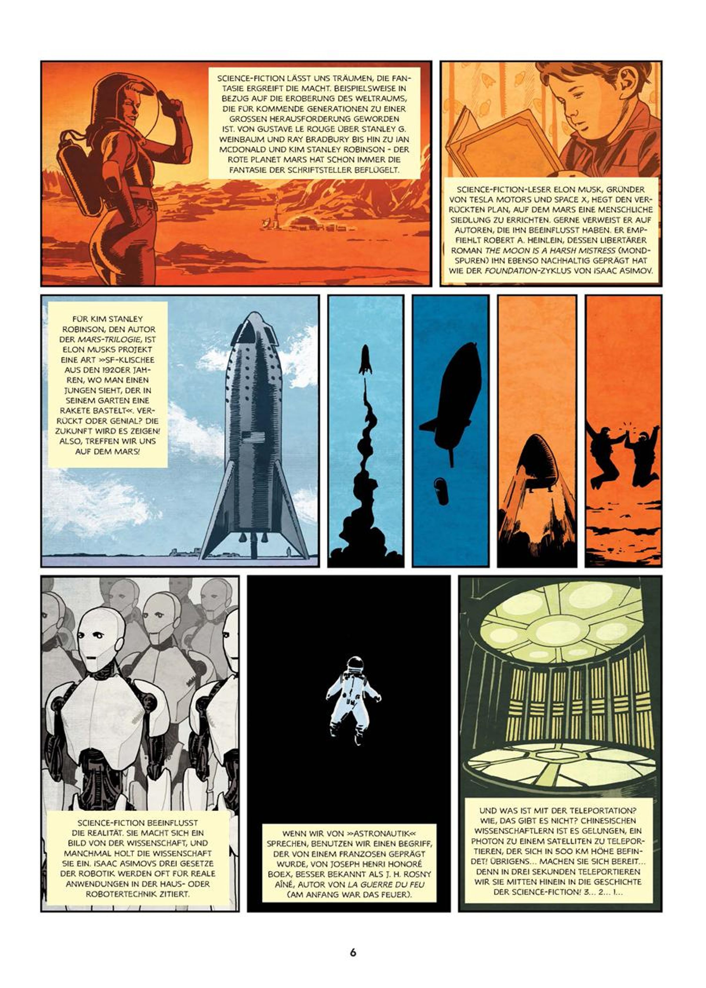 Von Asimov bis Verne (und noch darüber hinaus), vom Buchclub mit Ray Bradbury bis zur Anatomiestunde mit Mary Shelley, von der atomaren bis zur Zombieapokalypse - kurzum, die volle Bandbreite der Science-Fiction wird in diesem einzigartigen Band abgedeckt. Mehr als ein bloßer Zeitstrahl, ist >>Die Geschichte der Science-Fiction<< reich an Anekdoten, die überraschende Facetten eines ehrwürdigen Genres zutage fördern. Und natürlich wirft diese Graphic Novel auch ein Schlaglicht auf den Einfluss von SF auf die großen Projekte unserer Zukunft. Denn wenn die Menschheit eines Tages auf dem Mars lebt, ist die Science-Fiction schon längst dort gewesen.