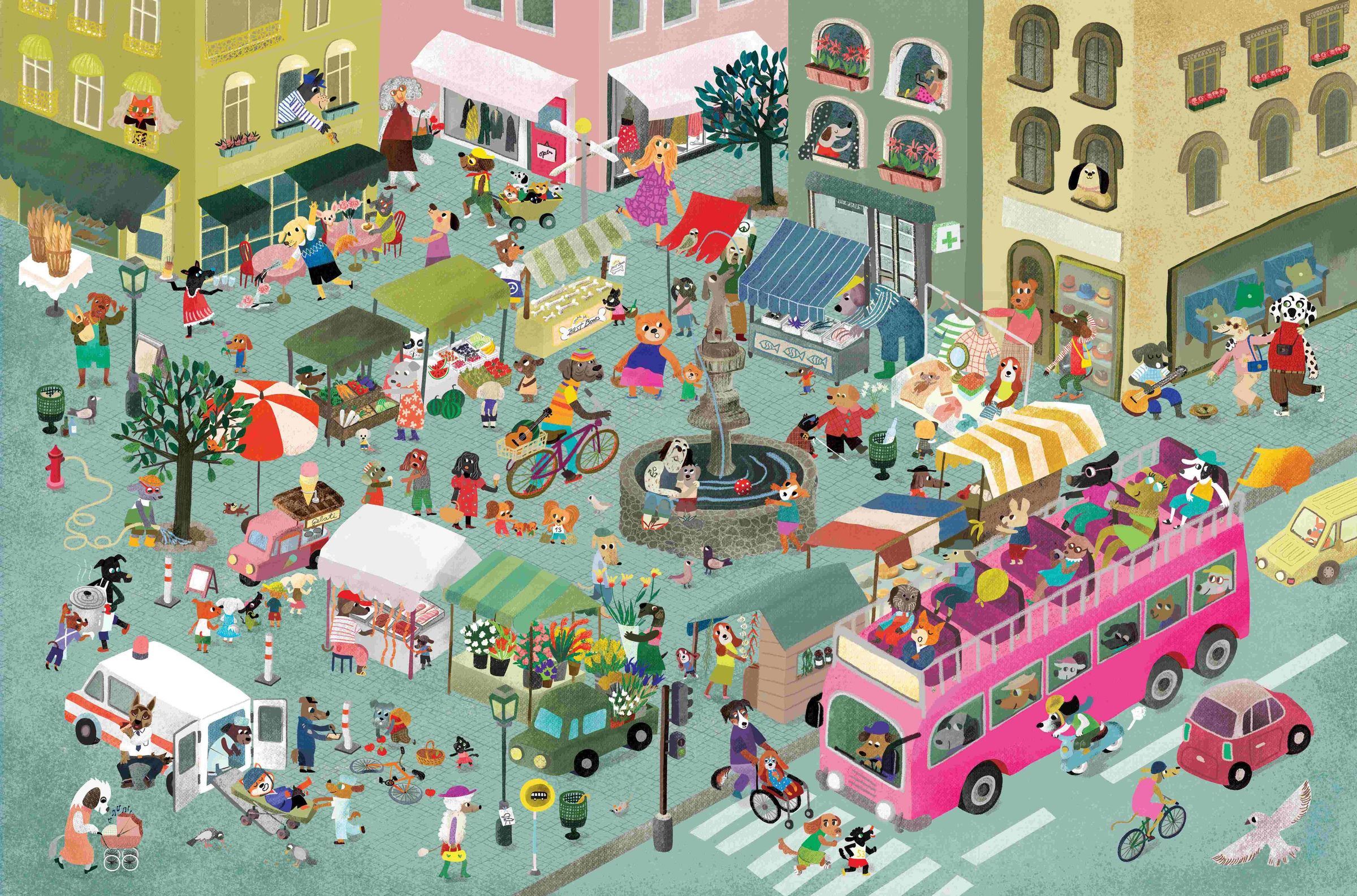 Die Stadt der Hunde hält hinter jeder Ecke Überraschungen bereit: Vom Terrier, der anderen gerne etwas beibringt, bis zum schachspielenden Schnauzer erinnern uns all diese Hundecharaktere immer wieder an Menschen, die wir kennen. Liebe- und humorvoll zeichnet Yayo Kawamura in ihren Figuren eine Vielfalt menschlicher Charaktereigenschaften nach und lässt sie unzählige kleine Geschichten erleben. Kinder können sich nicht sattsehen an dem Gewimmel auf dem Markt, dem Spielplatz oder beim Eislaufen in der kleinen Stadt und entdecken immer wieder etwas Neues. Und selbst die Erwachsenen amüsieren sich herrlich über die modebewusste Afghanische Windhunddame, die charmante Dackelfamilie, die kulturbeflissene Dalmatinerin oder den konservativen Cockerspaniel... Jeder Charakter hat hier eine ganz eigene Persönlichkeit und gemeinsam schaffen sie **eine Stadt, die so lebendig und vielfältig ist wie das echte Leben.**Mit Humor, Herzlichkeit und Witz illustriert, bieten diese farbenfrohen Bilder ein inspirierendes Porträt des urbanen Lebens. Ein kleines "Who is Who" auf der Rückseite stellt etliche Charaktere mit Namen vor und lädt dazu ein, ihnen durch die Stadt zu folgen. Dieses Buch ist ein unentbehrlicher Begleiter für Hundeliebhaber*innen und perfekt für Kinder, die lernen, die Welt um sich herum zu beobachten.