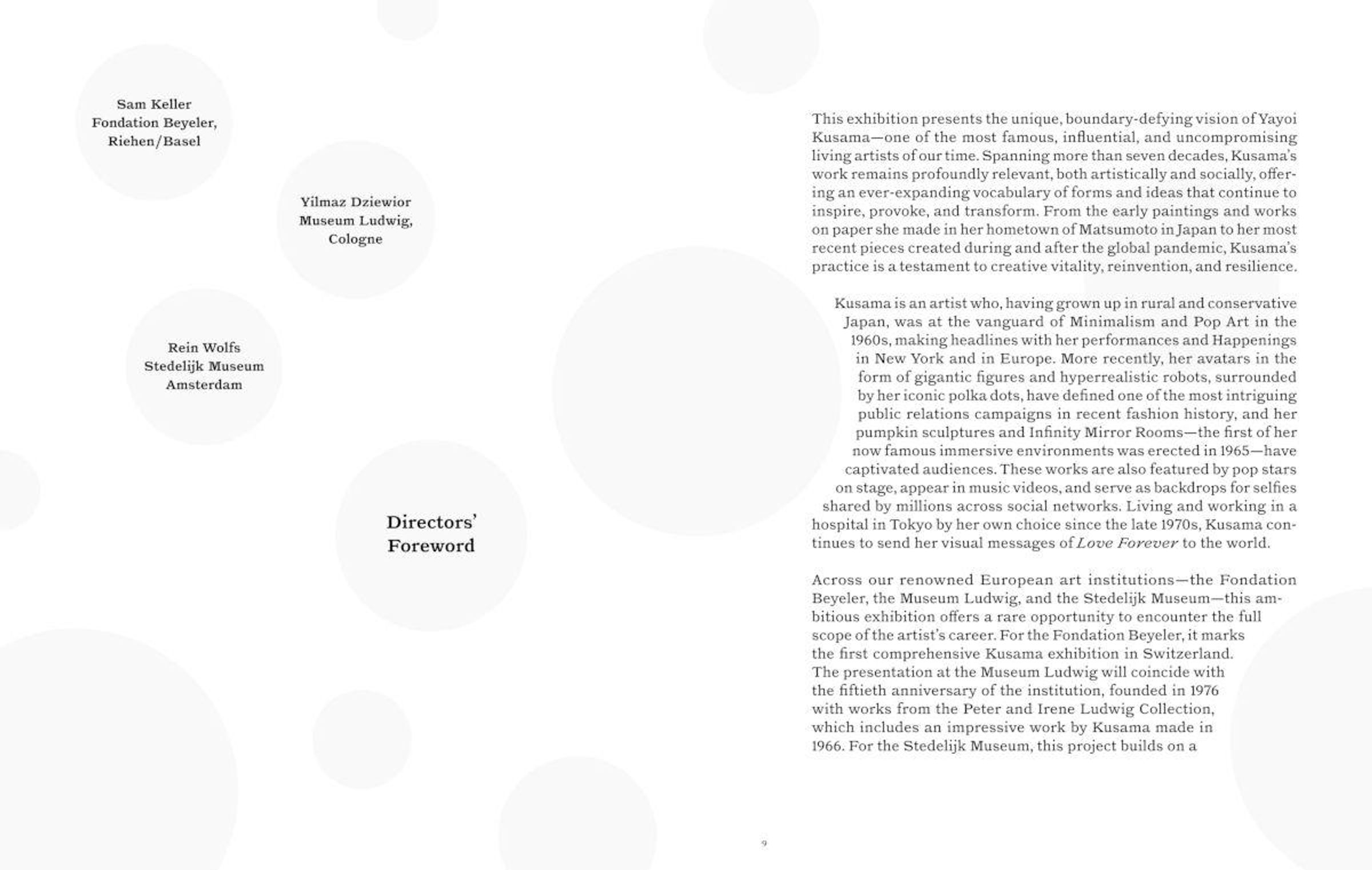Recognized as one of contemporary art's most influential figures, Yayoi Kusama has gained cult status through her exploration of repetitive patterns and structures- especially her signature polka dots and mirror rooms, which immerse viewers in seemingly infinite worlds. This catalogue, accompanying Kusama's retrospective in Riehen / Basel, Cologne, and Amsterdam, showcases the broad spectrum of media she has engaged with over the years, spanning painting, sculpture, installations, drawing, collage, happenings, live performances, fashion, and literature. Organized in close collaboration with the artist and her studio, the exhibition provides a comprehensive overview of Kusama's more than seven- decade career. In addition to some of her most iconic works, exhibition and catalogue include early pieces never before seen in Europe, as well as new productions.