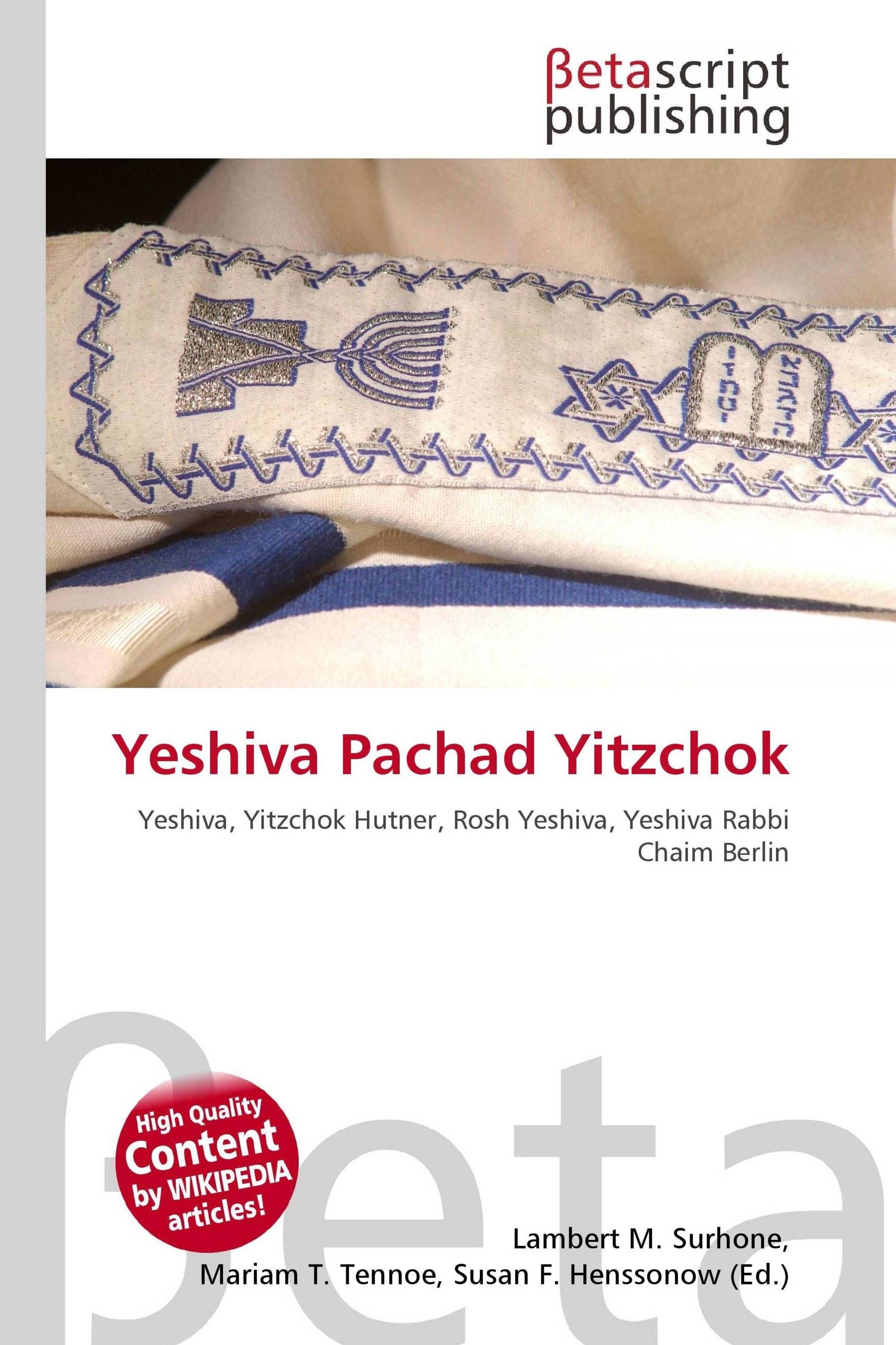 Please note that the content of this book primarily consists of articles available from Wikipedia or other free sources online. Yeshiva Pachad Yitzchok is a yeshiva that was established in Jerusalem, Israel in the late 1970s by Rabbi Yitzchok Hutner. It is located in the Har Nof neighborhood. Rabbi Hutner had previously been the long-standing Rosh yeshiva of Yeshiva Rabbi Chaim Berlin and Kollel Gur Aryeh in Brooklyn, New York City. Upon the passing of Rabbi Hutner in 1980, leadership of the yeshiva passed to his son-in-law, Rabbi Yonasan David who then became its sole rosh yeshiva. Rabbi David is married to Rabbi Hutner's only daughter Rebbetzin Dr. Bruria Hutner David. The name Pachad Yitzchok means "fear of Isaac" and is derived from a verse in Genesis and is used as an allusion to God. It was chosen to honor Rabbi Hutner's ten volume work on Jewish thought and philosophy that is also known as Sefer Pachad Yitzchok. The name "Yitzchok" is "Isaac" in Hebrew.