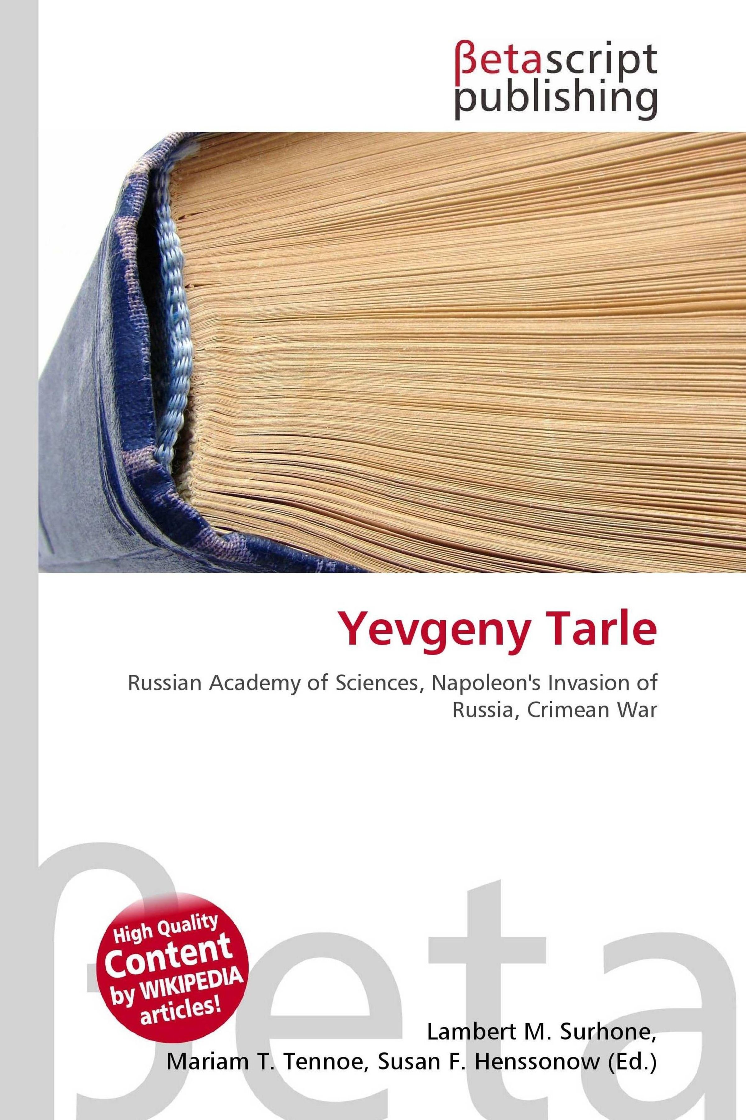 Please note that the content of this book primarily consists of articles available from Wikipedia or other free sources online. Yevgeny Viktorovich Tarle (Russian: ) (27 October 1874 in Kiev - 6 January 1955 in Moscow) was a Soviet historian and academician of the Russian Academy of Sciences. He is known for his books about Napoleon's invasion of Russia and on the Crimean War, and many other works. Yevgeny Tarle was one of the founders of the Moscow State Institute of International Relations-Russia's diplomatic university. Tarle was a historian who lived and worked both under Tsarist and Soviet Regimes. He witnessed the whole period in which Stalin remained in power as the "General Secretary of the Communist Party of the Soviet Union's Central Committee". The Stalinist era was remarkable with exceedingly strict ideological pressure on scholarly research in the Soviet Union in science, together with art, literature, education, and all other domains of human culture.