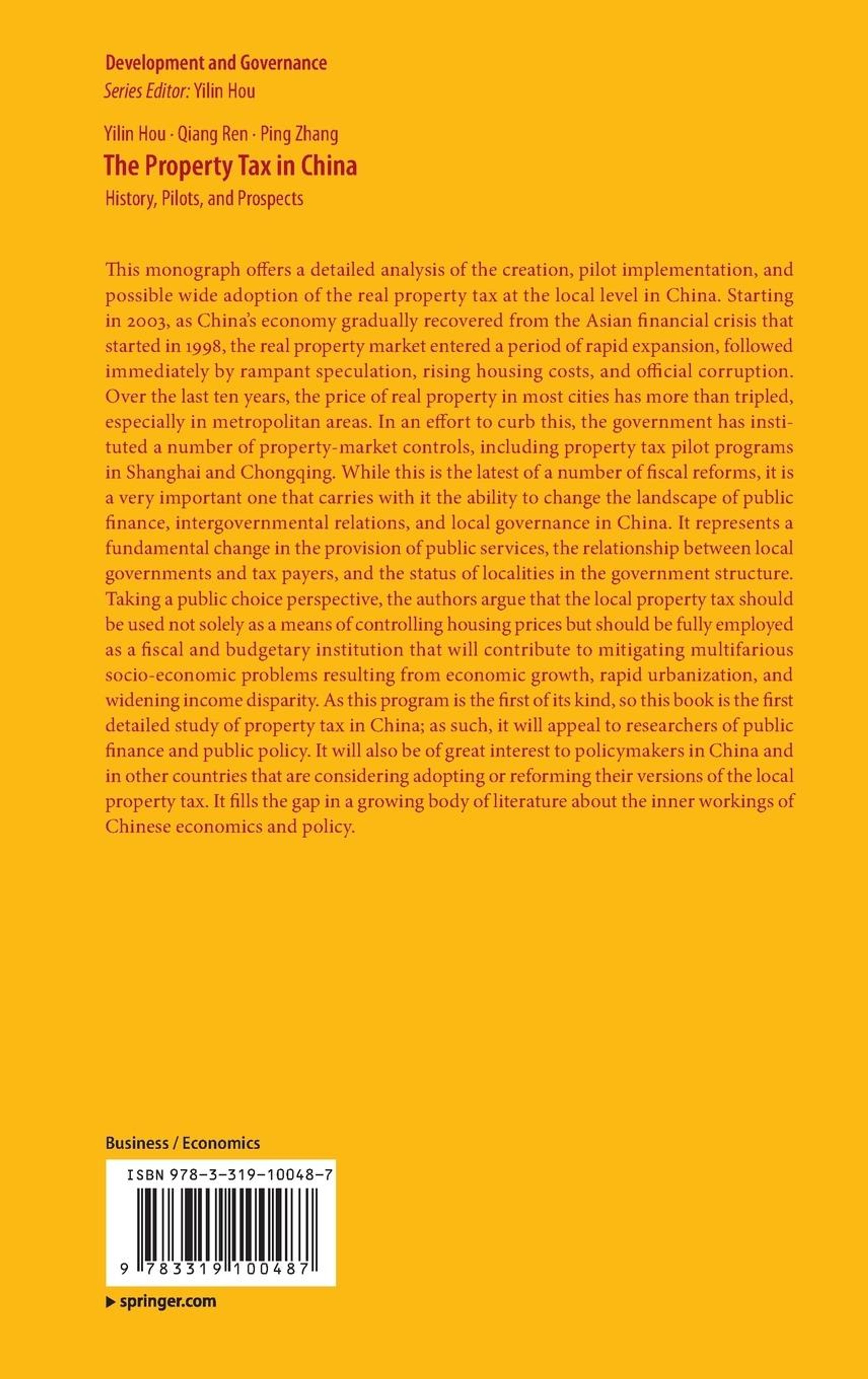 This monograph offers a detailed analysis of the creation, pilot implementation, and possible wide adoption of the real property tax at the local level in China. Starting in 2003, as Chinäs economy gradually recovered from the Asian financial crisis that started in 1998, the real property market entered a period of rapid expansion, followed immediately by rampant speculation, rising housing costs, and official corruption. Over the last ten years, the price of real property in most cities has more than tripled, especially in metropolitan areas. In an effort to curb this, the government has instituted a number of property-market controls, including property tax pilot programs in Shanghai and Chongqing. While this is the latest of a number of fiscal reforms, it is a very important one that carries with it the ability to change the landscape of public finance, intergovernmental relations, and local governance in China. It represents a fundamental change in the provision of public services, the relationship between local governments and tax payers, and the status of localities in the government structure. Taking a public choice perspective, the authors argue that the local property tax should be used not solely as a means of controlling housing prices but should be fully employed as a fiscal and budgetary institution that will contribute to mitigating multifarious socio-economic problems resulting from economic growth, rapid urbanization, and widening income disparity. As this program is the first of its kind, so this book is the first detailed study of property tax in China; as such, it will appeal to researchers of public finance and public policy. It will also be of great interest to policymakers in China and in other countries that are considering adopting or reforming their versions of the local property tax. It fills the gap in a growing body of literature about the inner workings of Chinese economics and policy.