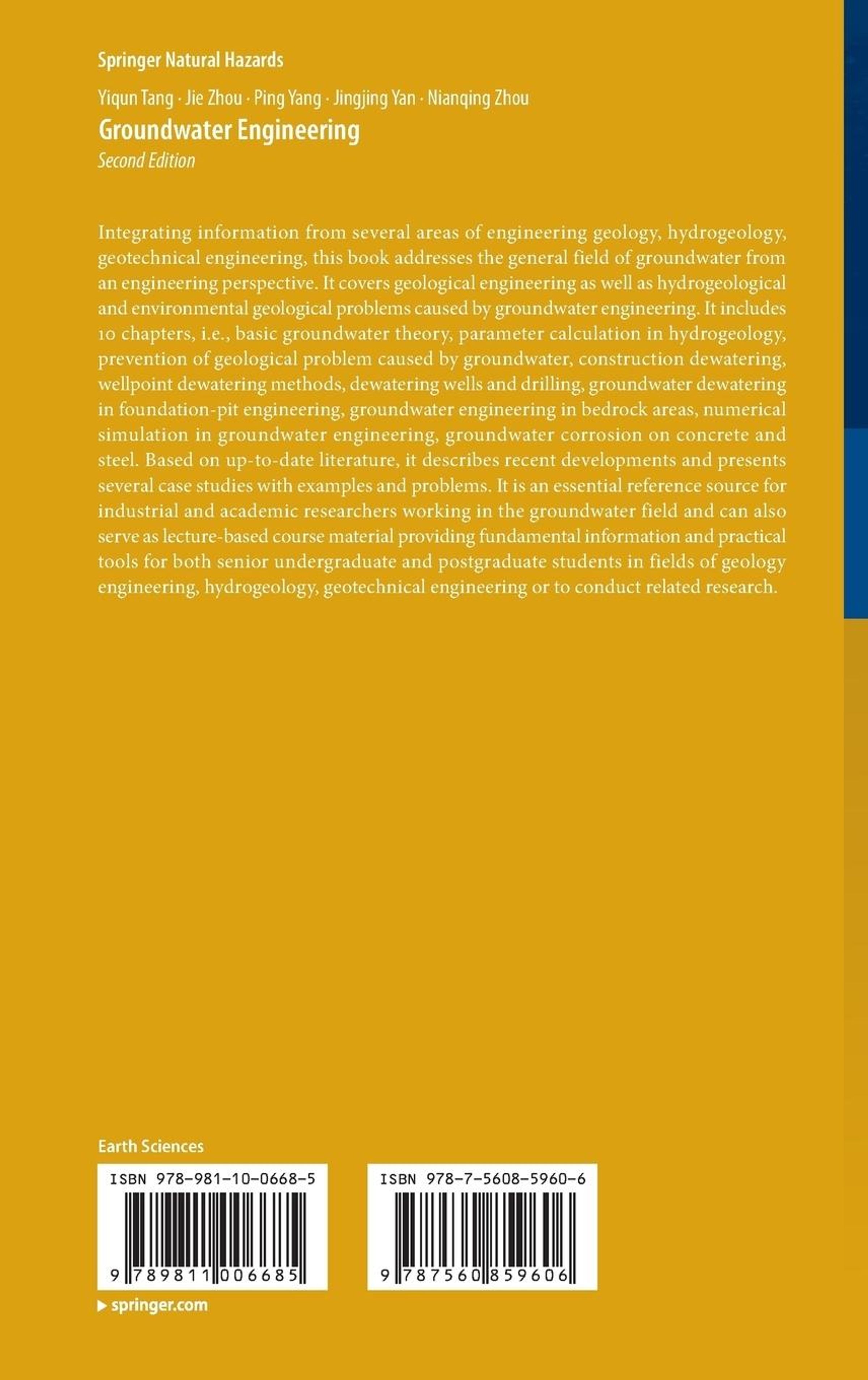 Integrating information from several areas of engineering geology, hydrogeology, geotechnical engineering, this book addresses the general field of groundwater from an engineering perspective. It covers geological engineering as well as hydrogeological and environmental geological problems caused by groundwater engineering. It includes 10 chapters, i. e., basic groundwater theory, parameter calculation in hydrogeology, prevention of geological problem caused by groundwater, construction dewatering, wellpoint dewatering methods, dewatering wells and drilling, groundwater dewatering in foundation-pit engineering, groundwater engineering in bedrock areas, numerical simulation in groundwater engineering, groundwater corrosion on concrete and steel. Based on up-to-date literature, it describes recent developments and presents several case studies with examples and problems. It is an essential reference source for industrial and academic researchers working in the groundwater field and canalso serve as lecture-based course material providing fundamental information and practical tools for both senior undergraduate and postgraduate students in fields of geology engineering, hydrogeology, geotechnical engineering or to conduct related research.