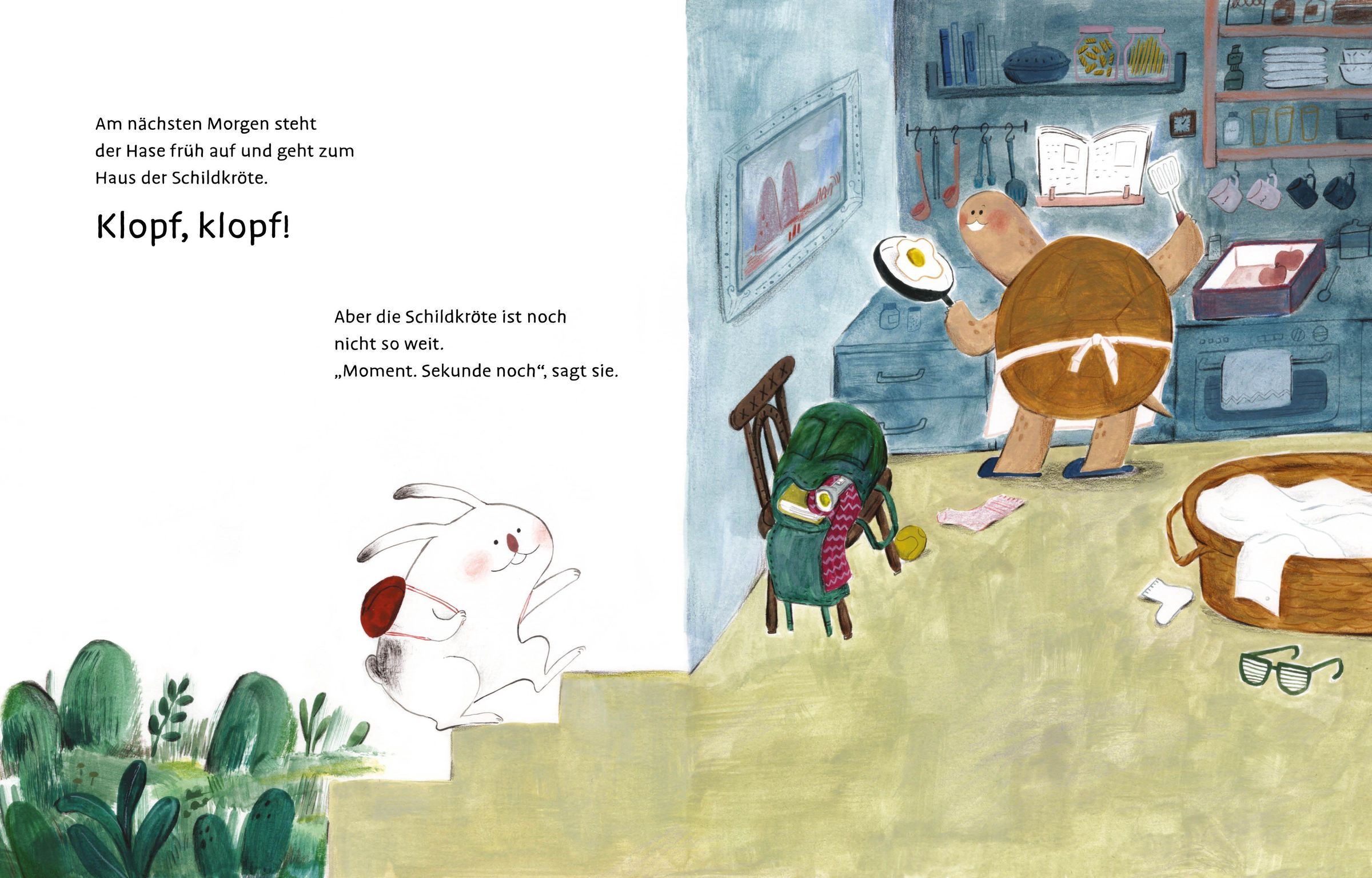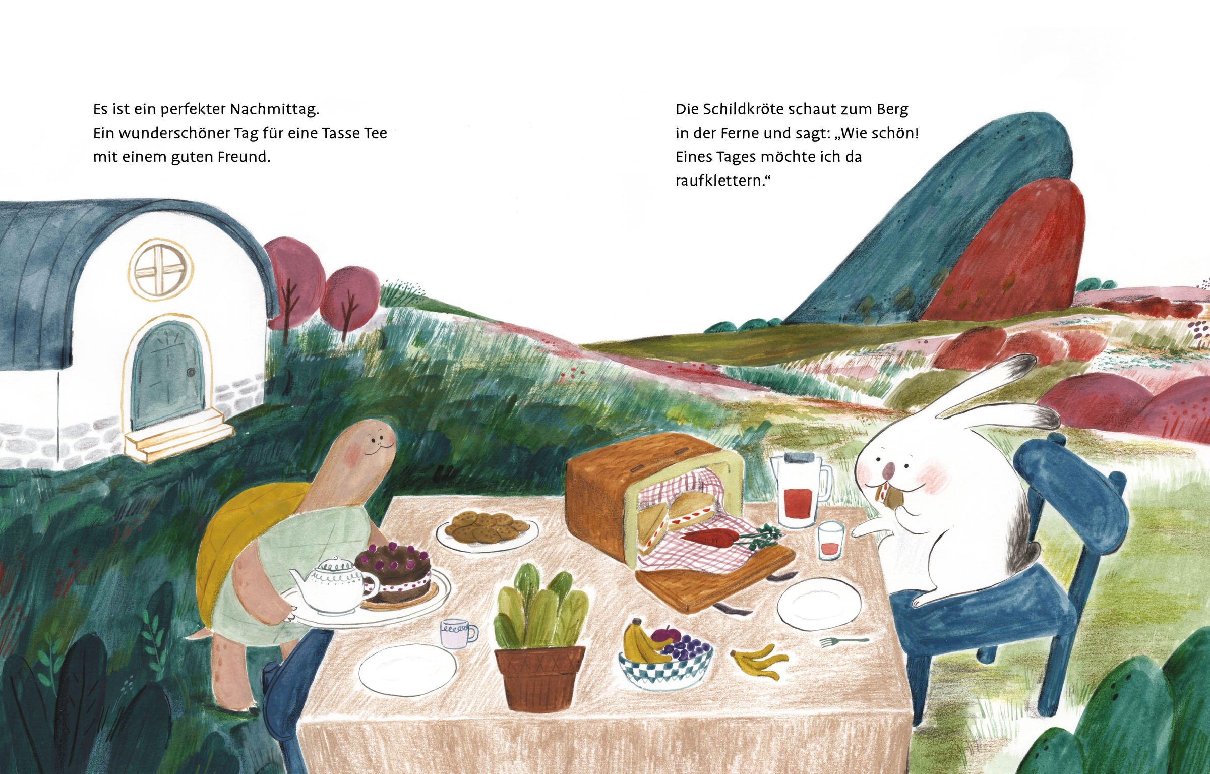 Geduld zu haben, ist für einen kleinen Hasen nicht leicht. Besonders dann nicht, wenn man eine gemächliche Schildkröte zur Freundin hat! Der Hase findet, es kann nun endlich losgehen mit der Wanderung auf den fernen Berg. Aber die Schildkröte ist noch nicht bereit. "Nur noch eine Sekunde!", verspricht sie. Dann noch eine ... bis dem Hasen der Geduldsfaden reißt: "Keine Sekunden mehr!" Schon bald jedoch lernt er, dass ein großes Abenteuer nur mit der richtigen Vorbereitung gelingt. Wie gut, dass er Schildkröte hat!